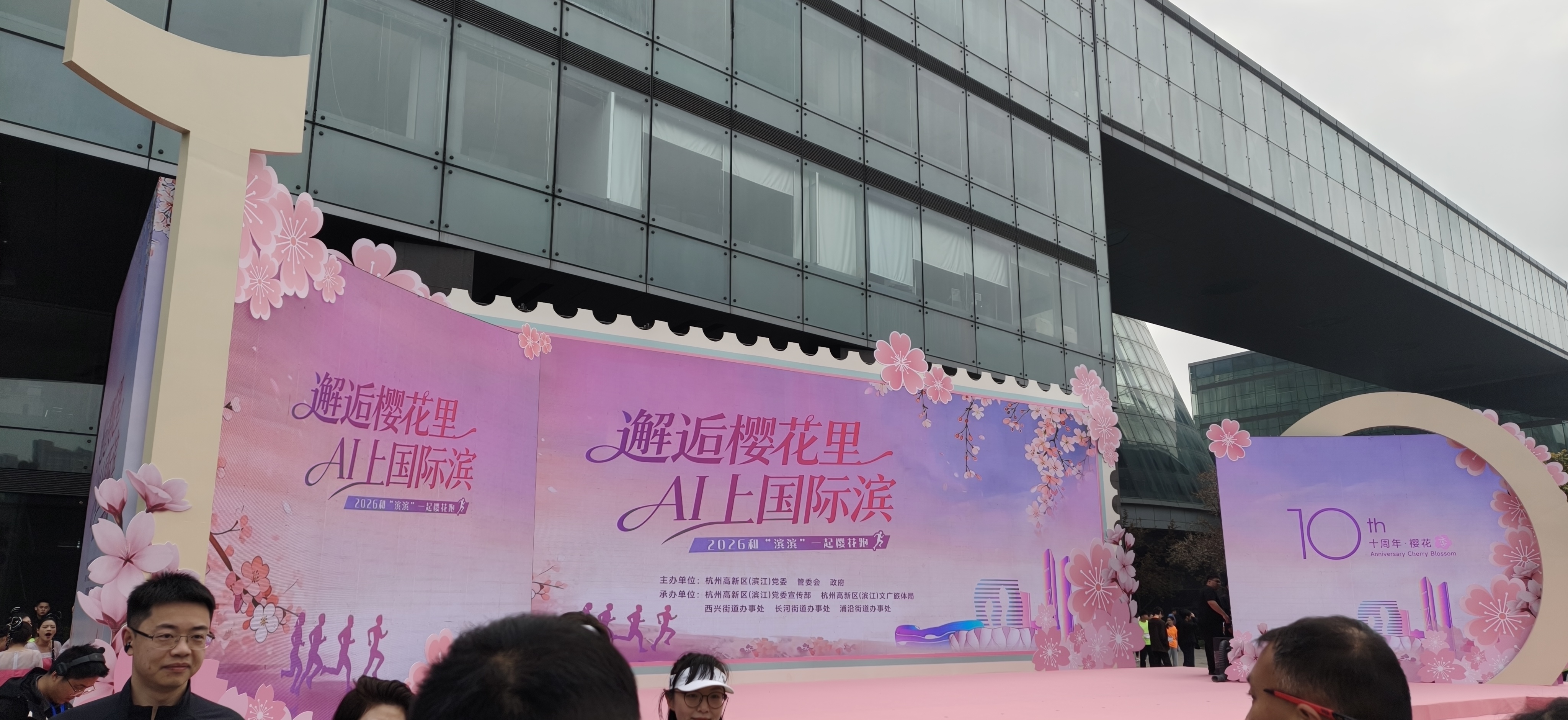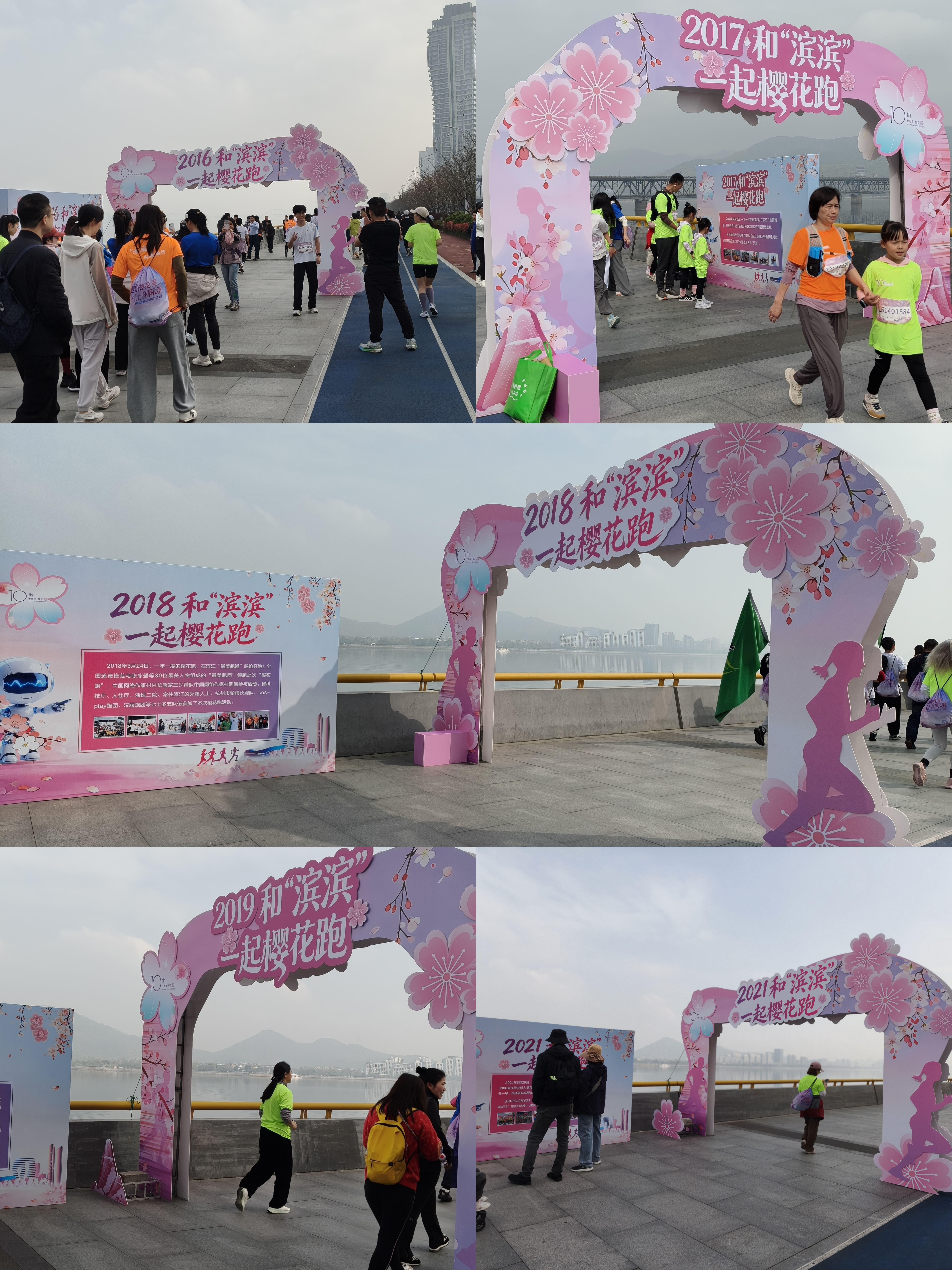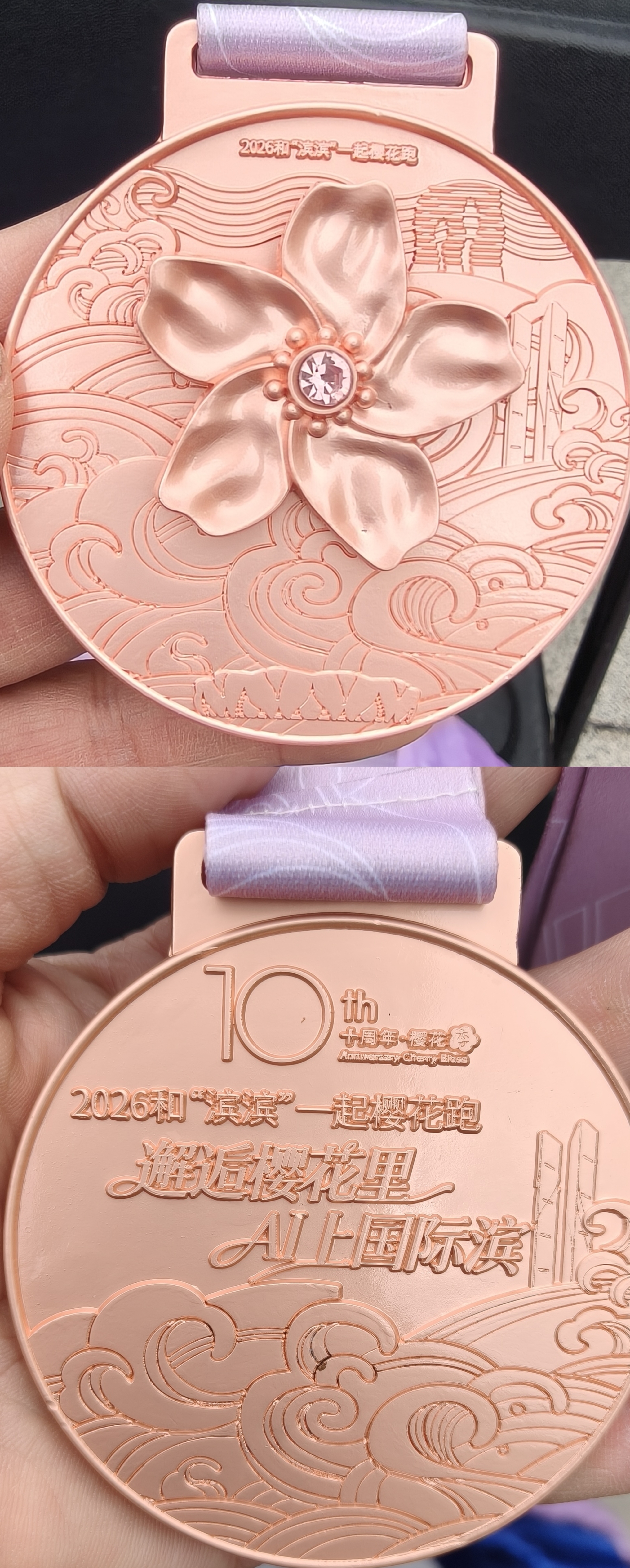 樱花跑里的十年春光 滨江的樱花跑道上,粉白的花串缀满枝头,风一吹就落满肩头。从2016到2026,十座粉色拱门依次排开,每一年的标语都藏着时光的印记:从“和滨滨一起樱花跑”的初心,到“樱为热爱,漫向未来”的期许,十年脚步,从未停歇。 补给站的绿茶香混着花香漫开,我们的笑声撞在江面上,溅起细碎的春光。有幸抽到“十周年樱花奖牌”,拿在手里沉甸甸,花瓣纹路里刻着每一次出发的勇气。好多跑友都想问我买,我当然不肯的啦。 没有刻意的追逐,只有春风里的并肩同行——原来最好的春天,从来不在远方,就在脚下的跑道,在身边的烟火,在和这座城一起慢慢变好的时光里。