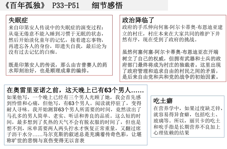 《百年孤独》正文第33页—51页。 一个晚上已经有63个男人光顾了她! 阅读就此停驻,变得耐人寻味了。炎热的夏季,不用脱衣服,进来、躺下、干完走人,如此才能在奥雷里亚诺进入前已经完成了63个,然后两人一起两头拧床单,再将席子上的汗水绞干,……这就是加西亚·马尔克斯的神奇地方,让我们面对堪称旷世的悲悯与哀伤,变得无以言表。