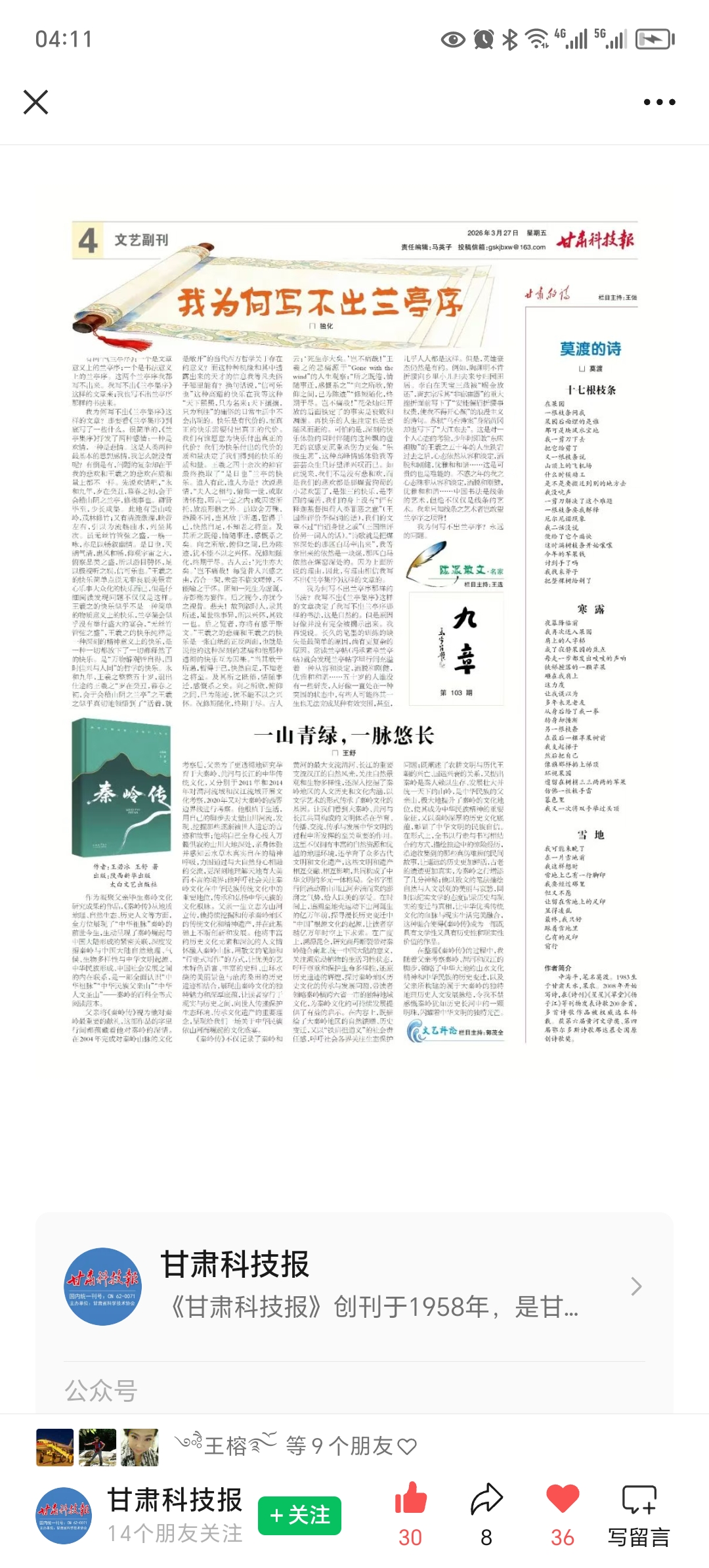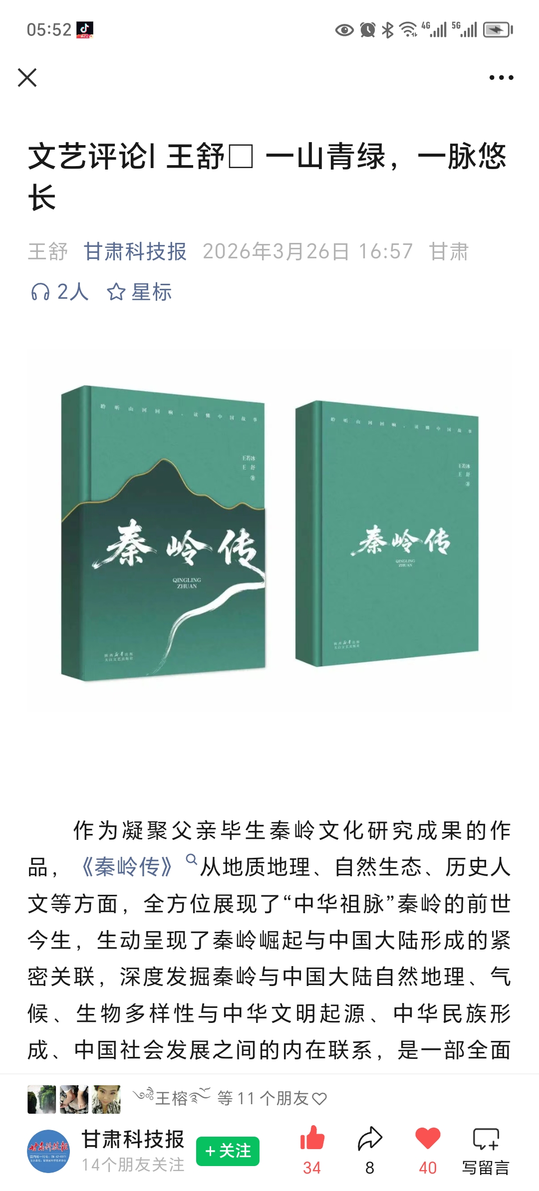 文艺评论| 王舒□ 一山青绿,一脉悠长 王舒 甘肃科技报 2026年3月26日 16:57 甘肃 听全文 王若冰(1962.10—2024.5),作家、诗人、秦岭文化学者。出版诗集《巨大的冬天》《我的隔壁是灵魂》,文艺评论集《倾听与呈现》,“大秦岭长篇散文系列”《走进大秦岭》《渭河传》《走读汉江》等10余部。8集纪录片《大秦岭》主撰稿,12集人文地理纪录片《中华秦岭》总撰稿。作品曾获第三、四届甘肃省优秀文学作品奖、第六届甘肃省政府敦煌文艺一等奖、第25届中国电视金鹰奖最佳纪录片奖、第八届中国作家鄂尔多斯文学奖、第六届中国报人散文奖、首届观音山杯·中国生态文学奖、第五届三毛散文奖实力奖等。