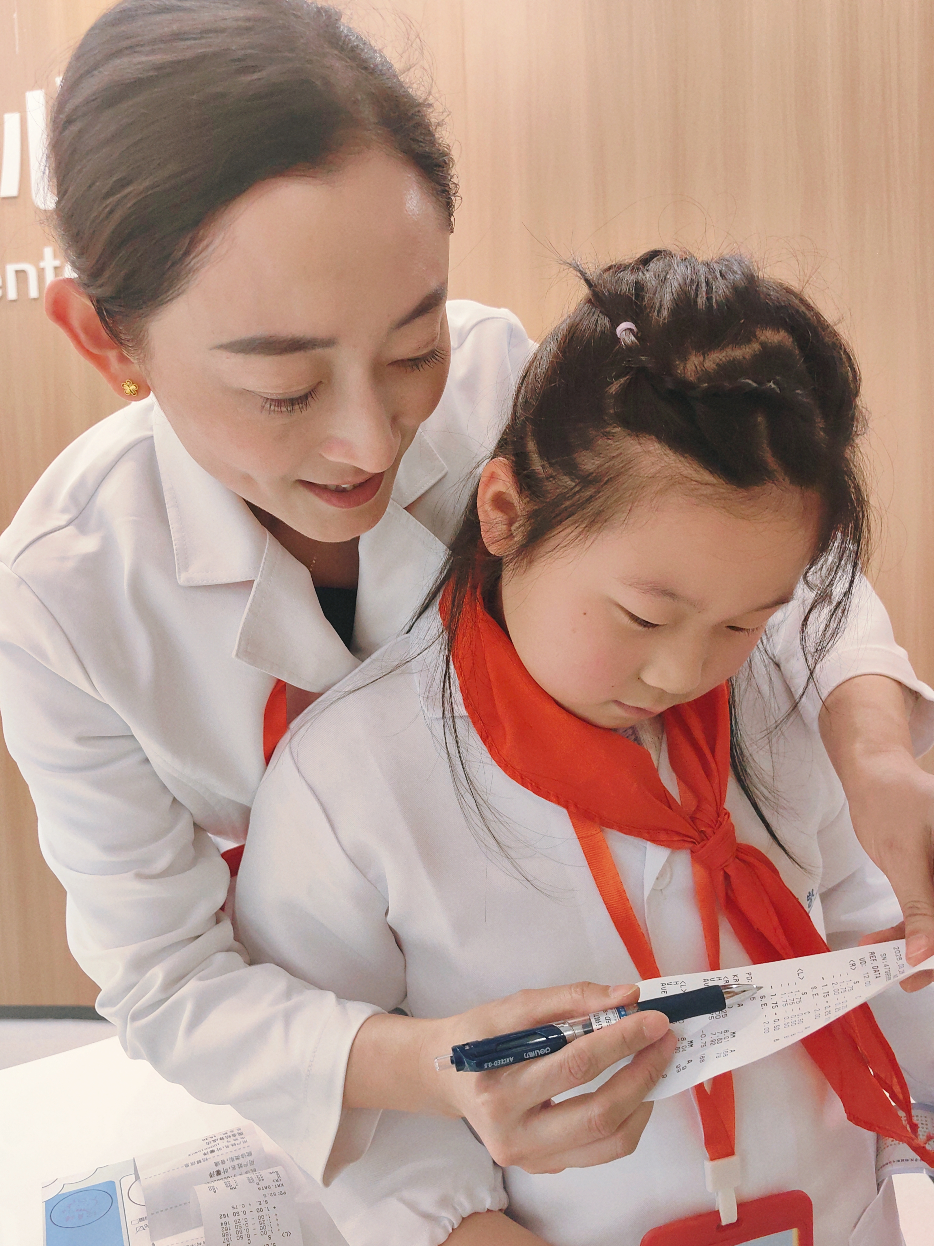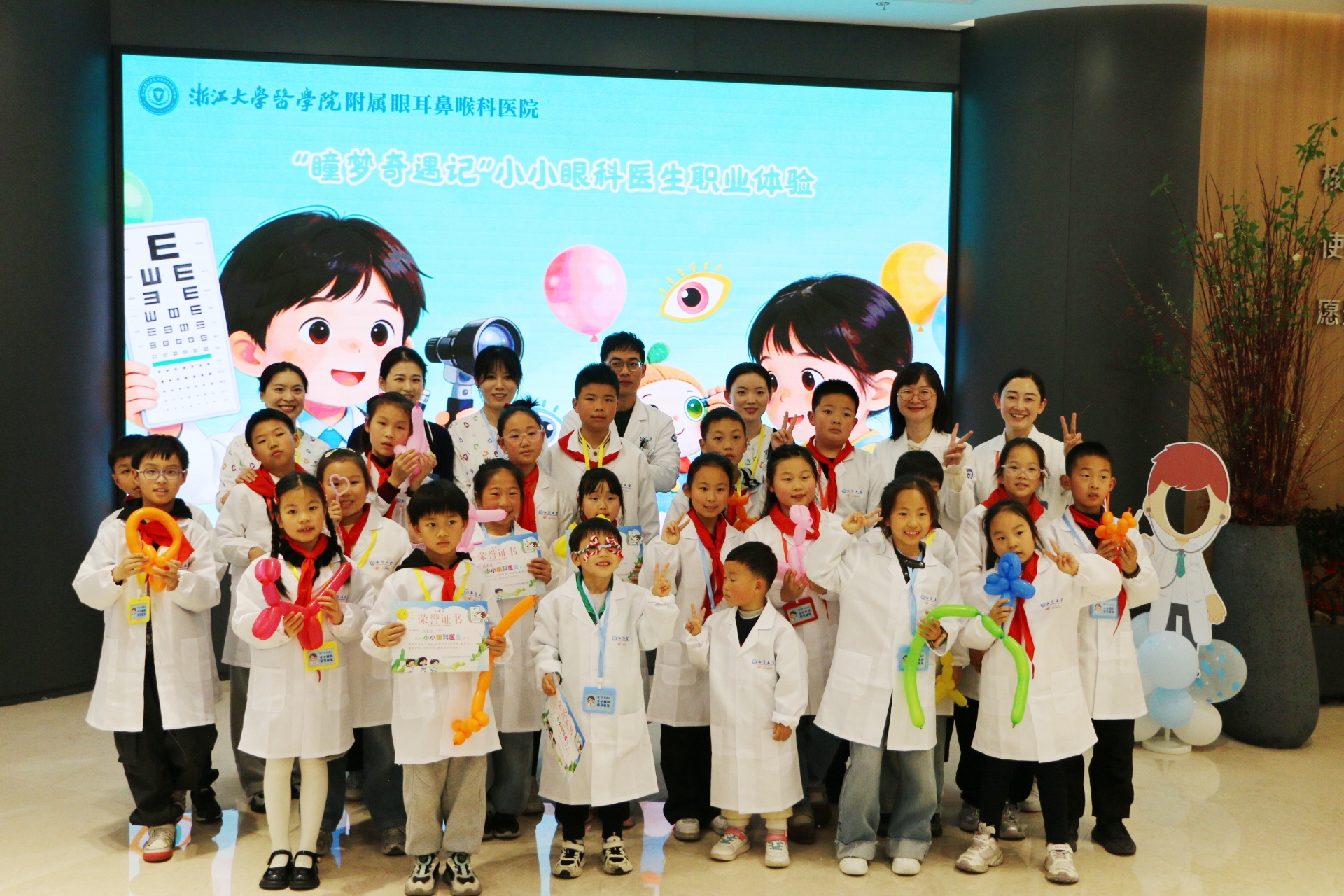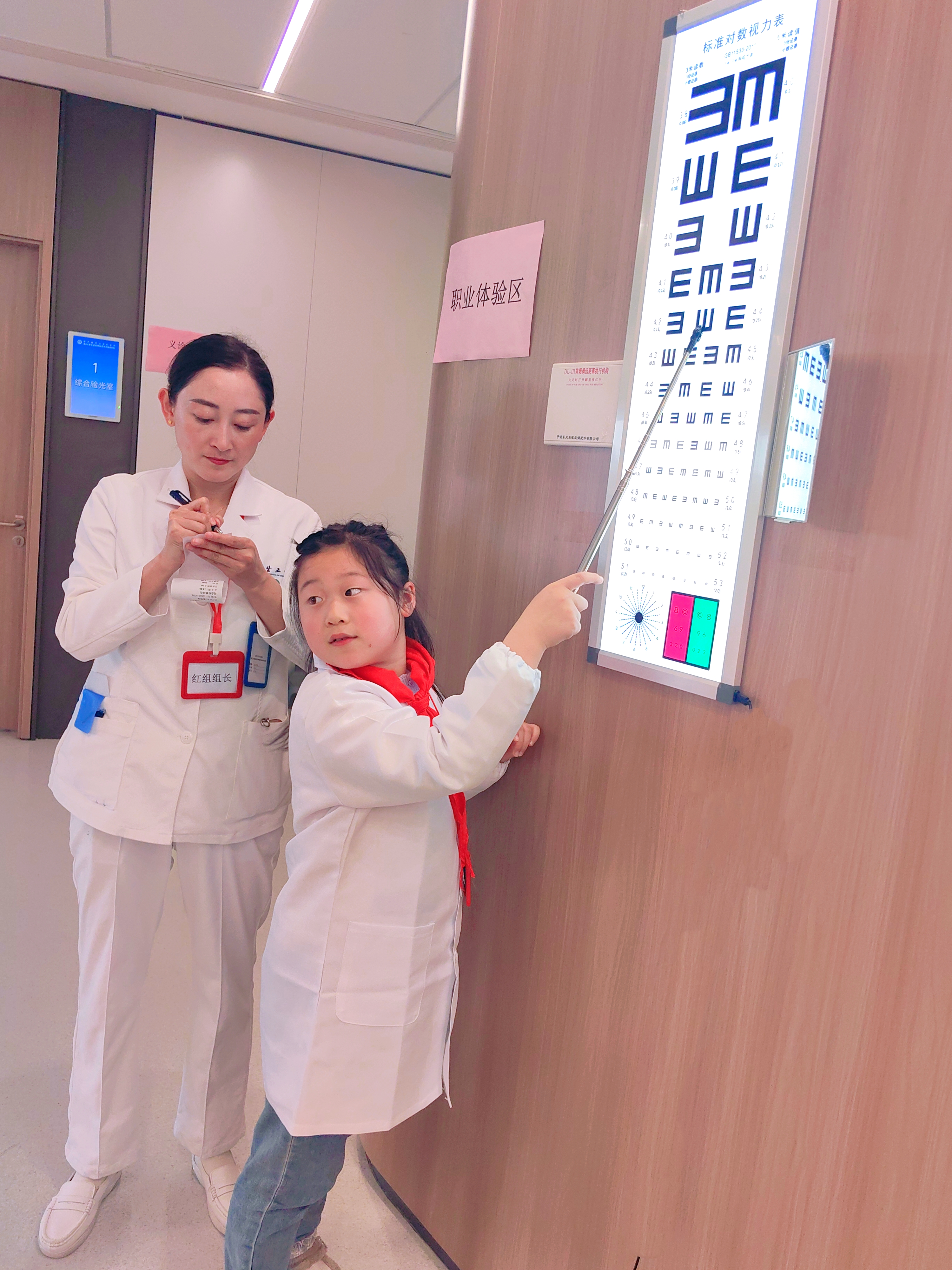 "瞳"梦职业启航,我的小小眼科医生梦! 在多日的期待中,我终于来到浙江大学医学院附属眼耳鼻喉科医院,参加“小小眼科医生”活动,满心欢喜地开启了这场奇妙的职业体验之旅。 刚踏入医院,换装仪式就点燃了我的热情。热心的护士姐姐为我穿上印有“浙医五官”标记的白大褂,还细心地帮我佩戴好工作牌。穿上这身神圣的白大褂,一股自豪感油然而生,我的心也跟着雀跃不已,仿佛瞬间化身成了一名真正的小医生。 第一轮趣味科普课堂——近视防控第一课,让我收获满满。医生用生动的比喻告诉我们,眼睛就像一台精密的相机,由角膜、晶状体、玻璃体、视网膜和眼轴组成。正常的眼球接近正圆形,而小朋友近视后,眼轴会不断拉长,每增长1mm,近视就会加深约300度,眼球也会变成椭圆形。更重要的是,眼轴一旦拉长就无法缩短,儿童近视大多是轴性近视。这堂课让我学到了许多护眼知识,充实了我的知识宝库。 第二轮职业体验环节,我正式化身小小眼科医生,为“病人”测视力、电脑验光、检测色盲。站在E视力表前,我手持指示棒,由上至下耐心地为小病患检测视力,先测裸眼视力,再测戴镜视力,最后认真叮嘱:“你的眼镜配得非常专业!以后一定要好好保护眼睛哦!”在医生的指导下,我还操控着精密的高科技仪器,为妈妈做电脑验光和眼压检测。我握着操纵杆,让妈妈注视仪器中的绿色光点,精准捕捉瞳孔数据,完成双眼检查后,一键打印出检查报告单,并为妈妈仔细分析。得知妈妈是低度数近视,眼压也一切正常,我和妈妈都开心地笑了。这次体验让我过足了当医生的瘾。 最后是义诊活动,专业又耐心的医生为我和妈妈做了全面的眼部检查,包括视力测试、电脑验光、裂隙灯检查、眼轴测量。最让我惊喜的是,我的视力非常好,还有充足的远视储备,医生们都夸赞我日常护眼做得特别棒,我心里乐开了花。 活动愉快的结束了,最后的最后我还收获了一张荣誉证书。这份喜悦一直陪伴着我,直到回家睡觉前,心里依旧美滋滋的。这场“小小眼科医生”活动,不仅让我圆了医生梦,更让我懂得了保护眼睛的重要性! ——杭州公益小天使 叶馨泽