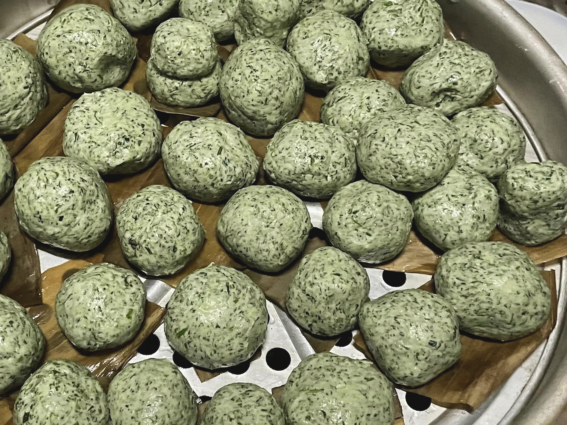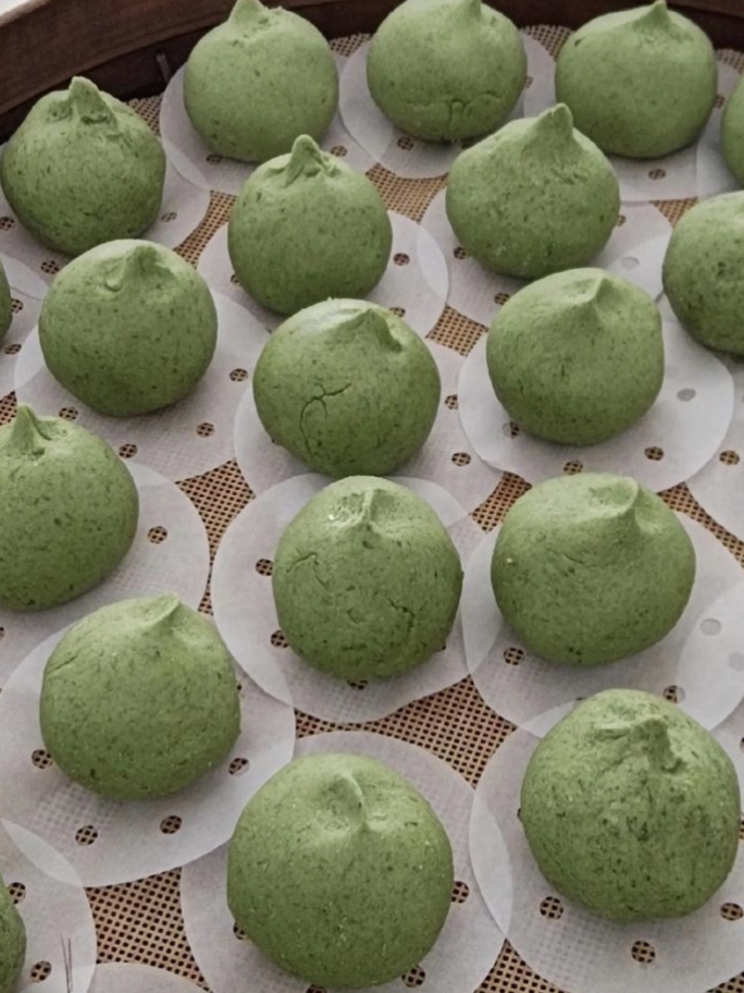 看到了两种外表不同的青团,一个是艾草打成汁,揉成揉进粉里,还有一个应该是艾草,切碎了再揉进粉里的,想必,两种青团的口感,应该也不太相同吧。