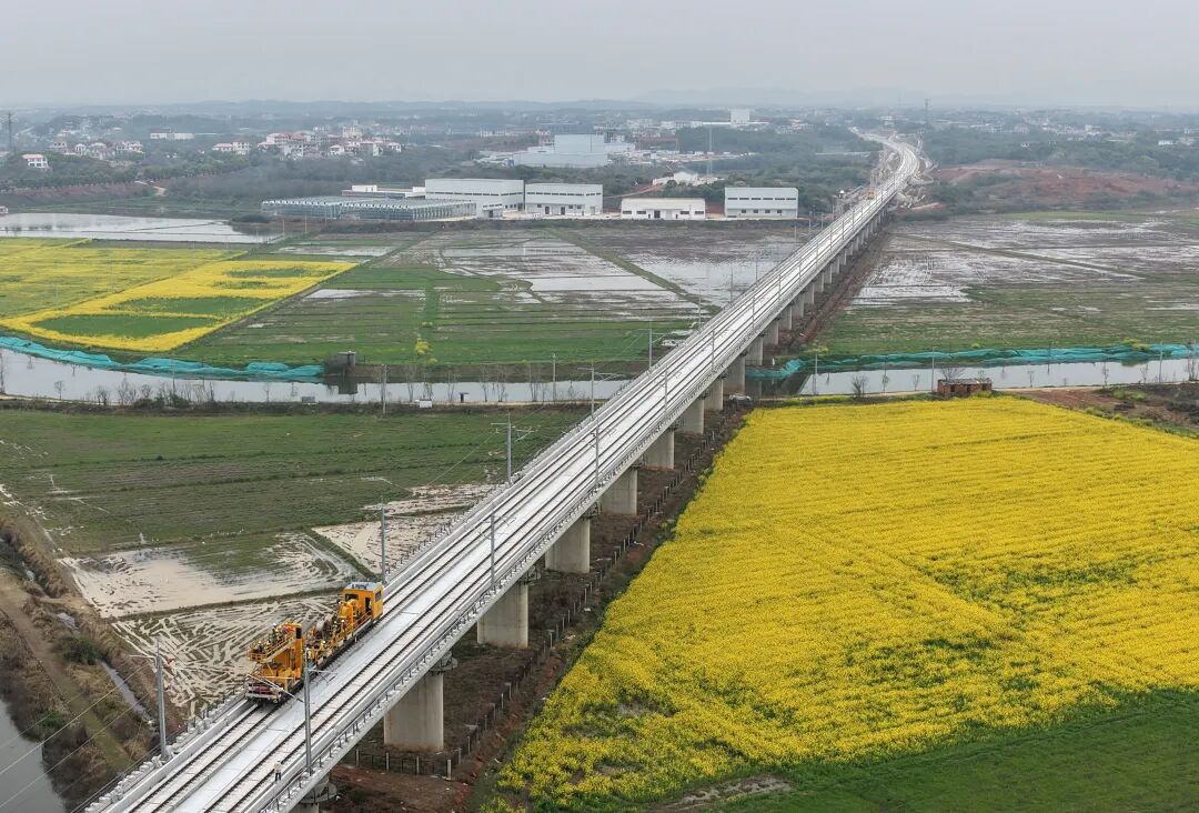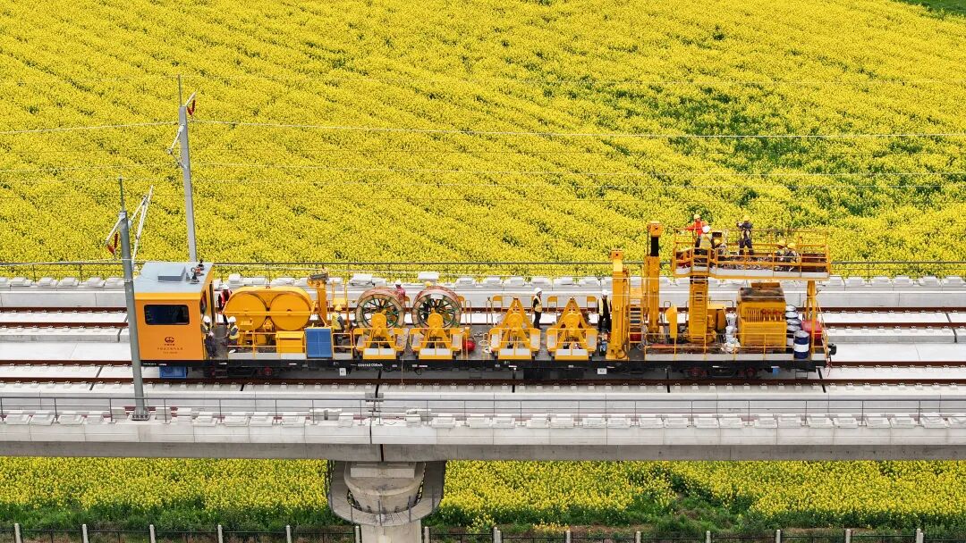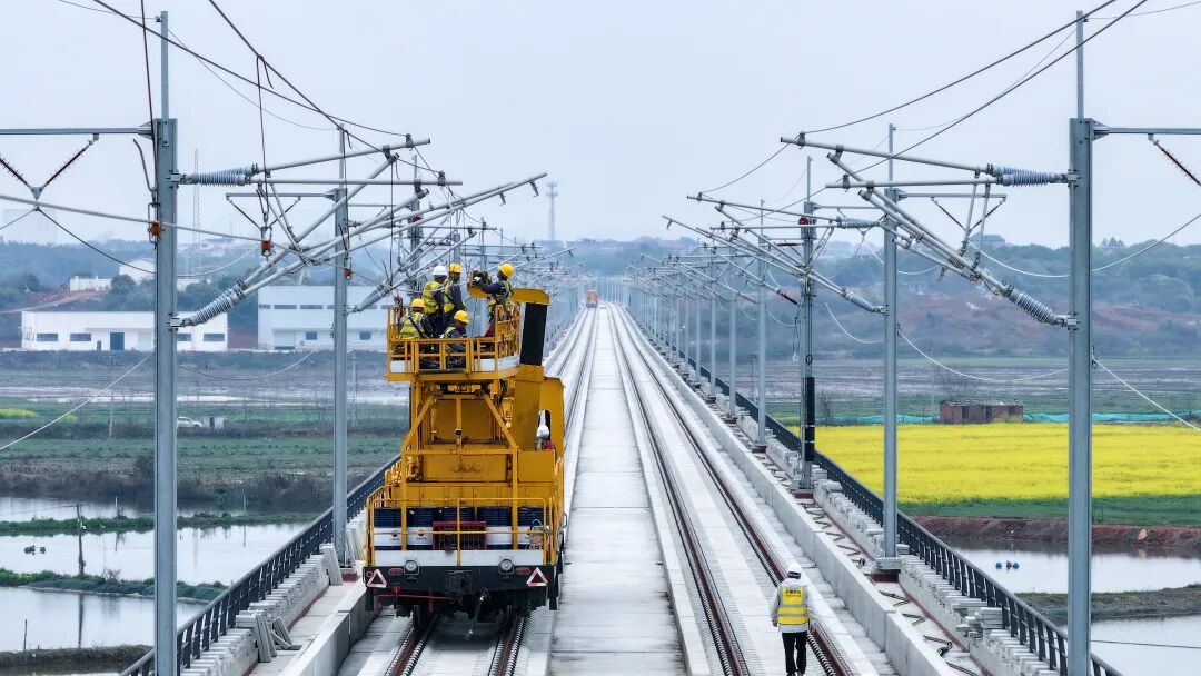 3月28日,在昌九高铁庐山南站至共青城东站区间施工现场,随着恒张力放线轨道车缓缓启动,首条接触网导线平稳架设到位,标志着昌九高铁全线接触网架设工作正式拉开帷幕,工程建设进入最后冲刺阶段。