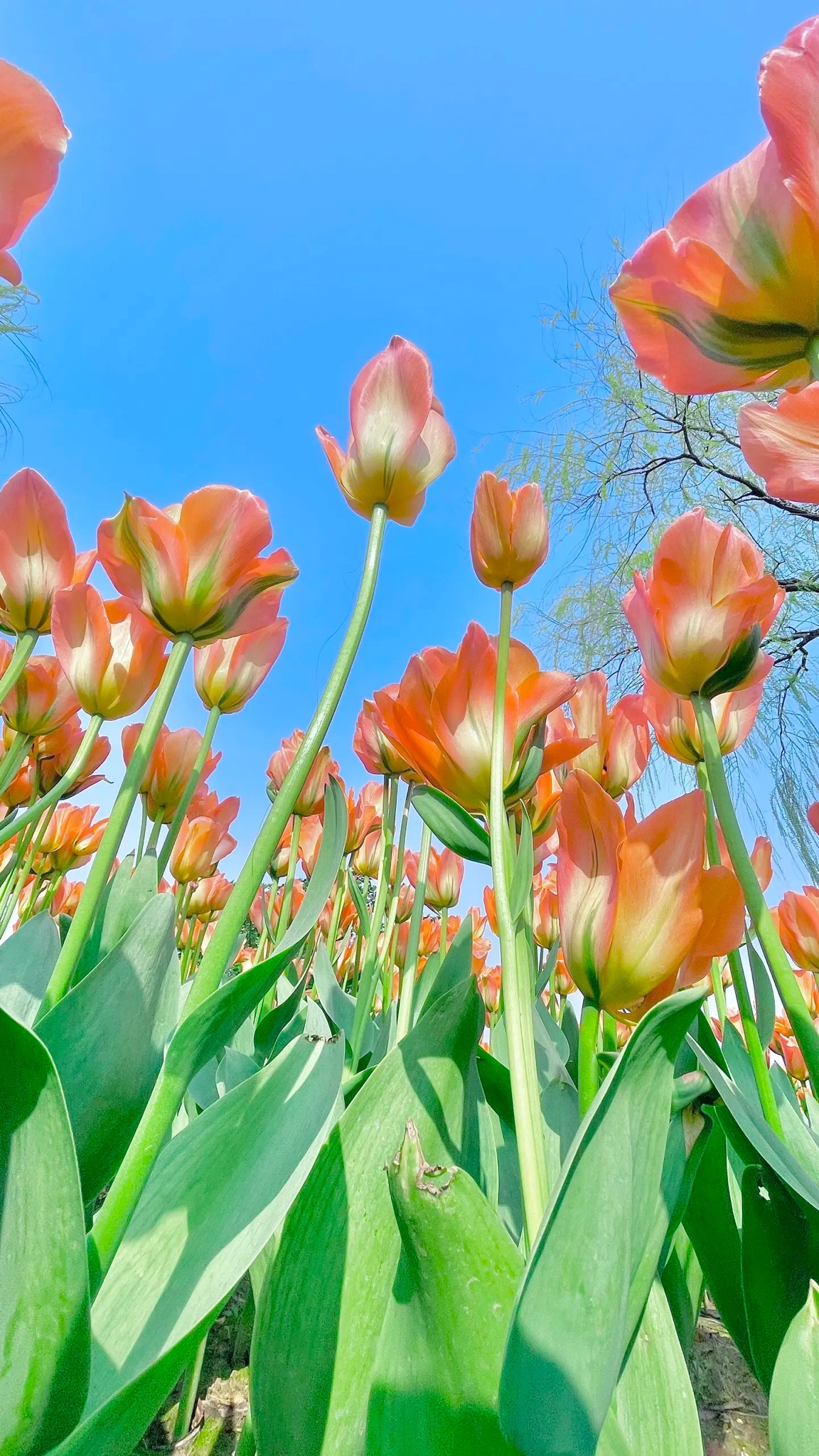 春日晴空下,橙粉郁金香于绿叶衬托中灼灼盛放。低角度取景,以澄澈蓝天为幕,勾勒出花卉蓬勃生长的天然韵律。镜头凝驻花园景观的静谧生机,诠释春季花卉最本真的色彩诗篇。