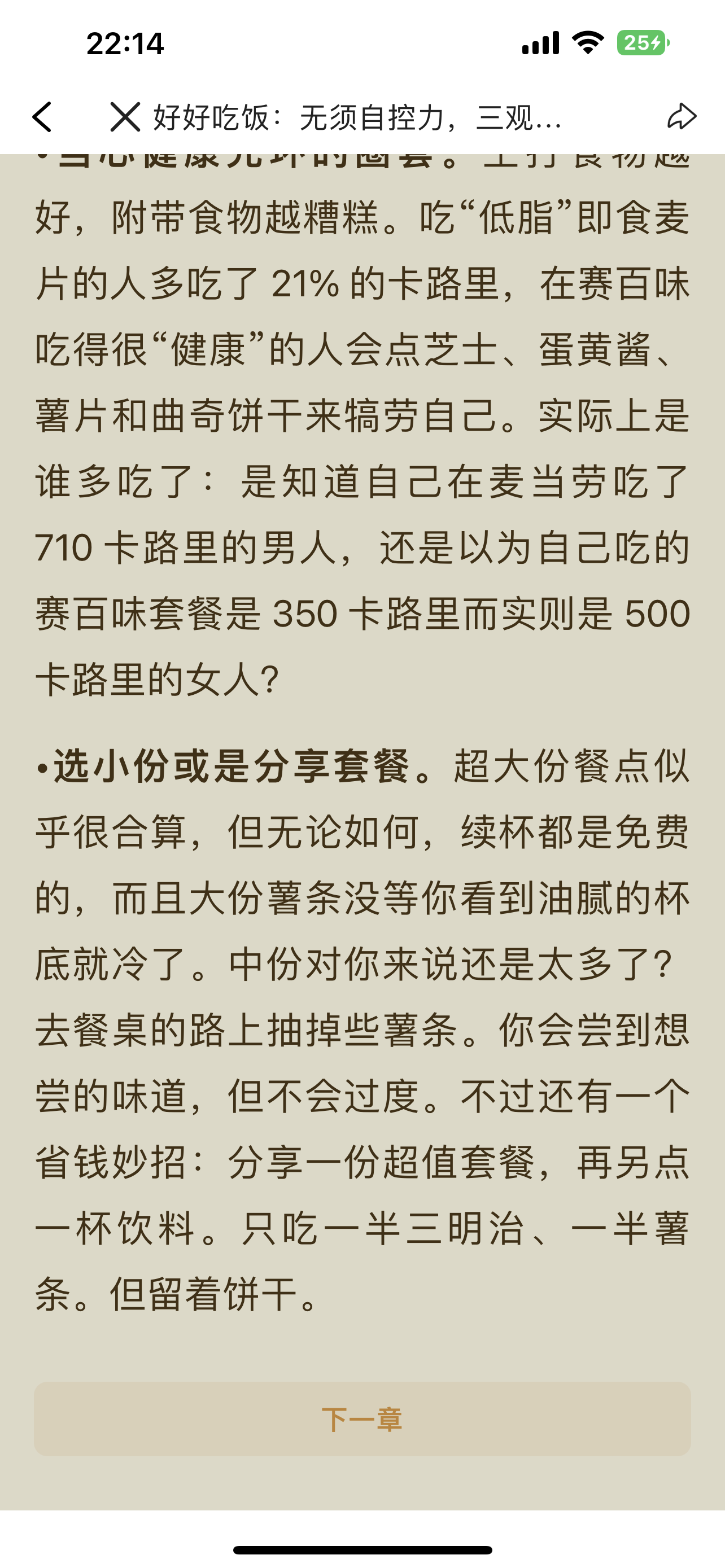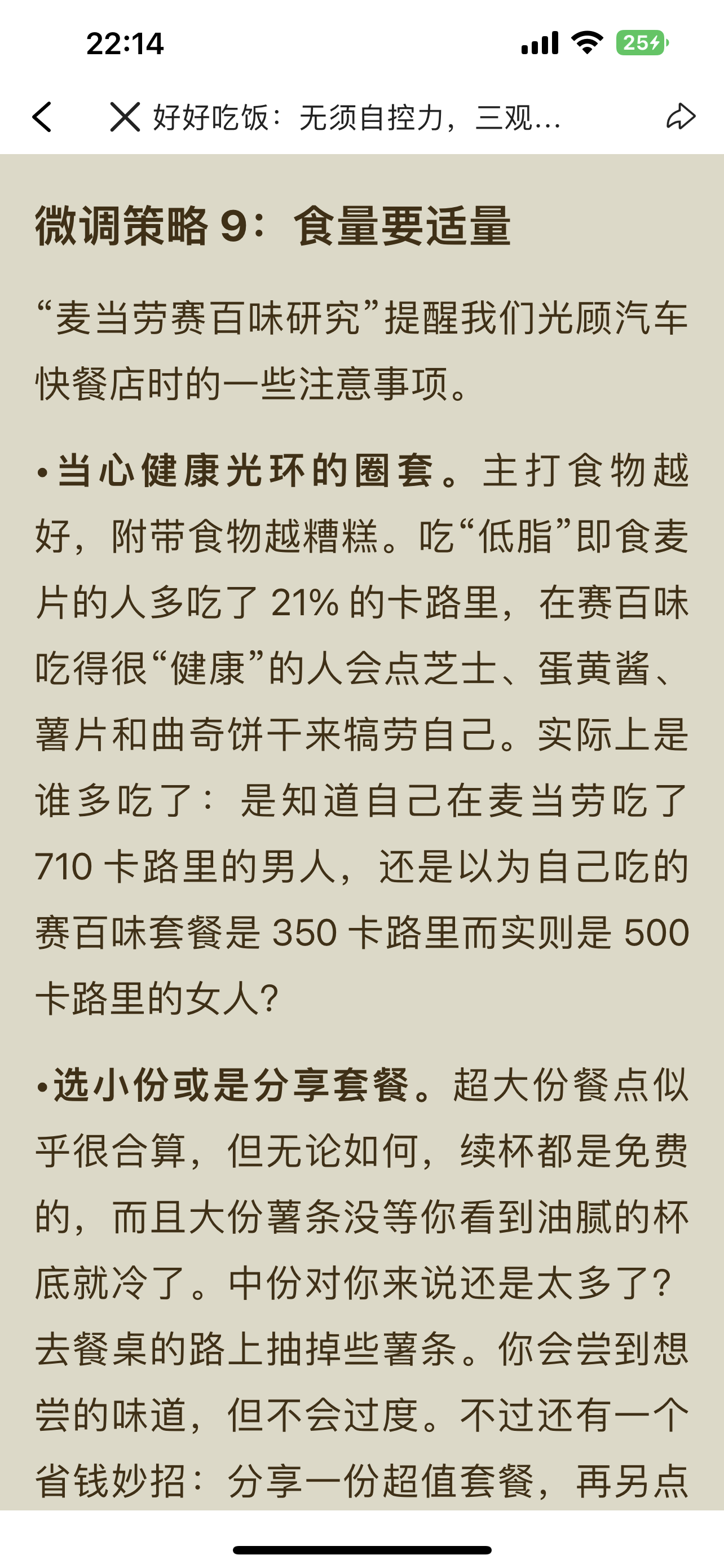 今日摘抄: 食量要适量 · 当心健康光环的圈套。主打食物越好,附带食物越糟糕。吃“低脂”即食麦片的人多吃了21%的卡路里,在赛百味吃得很“健康”的人会点芝士、蛋黄酱、薯片和曲奇饼干来犒劳自己。实际上是谁多吃了:是知道自己在麦当劳吃了710卡路里的男人,还是以为自己吃的赛百味套餐是350卡路里而实则是500卡路里的女人? · 选小份或是分享套餐。超大份餐点似乎很合算,但无论如何,续杯都是免费的,而且大份薯条没等你看到油腻的杯底就冷了。中份对你来说还是太多了?去餐桌的路上抽掉些薯条。你会尝到想尝的味道,但不会过度。不过还有一个省钱妙招:分享一份超值套餐,再另点一杯饮料。只吃一半三明治、一半薯条。但留着饼干。