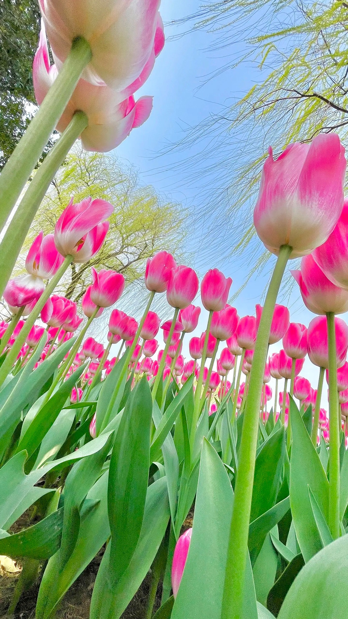 今天溜达到花田,粉白渐变的郁金香开得正欢~蓝天打底,绿叶作衬,柳枝还悄悄垂下来凑热闹。快门按到停不下来,连风都带着甜味儿!春日花园的温柔暴击,谁懂?🌸