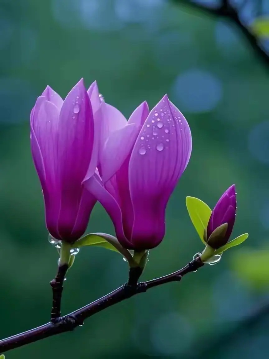 雨后紫玉兰,花瓣托着晶莹水珠,花苞微张,枝条舒展,嫩叶沾湿更显青翠~春天的园林小景,随手一拍就是清透感大片!