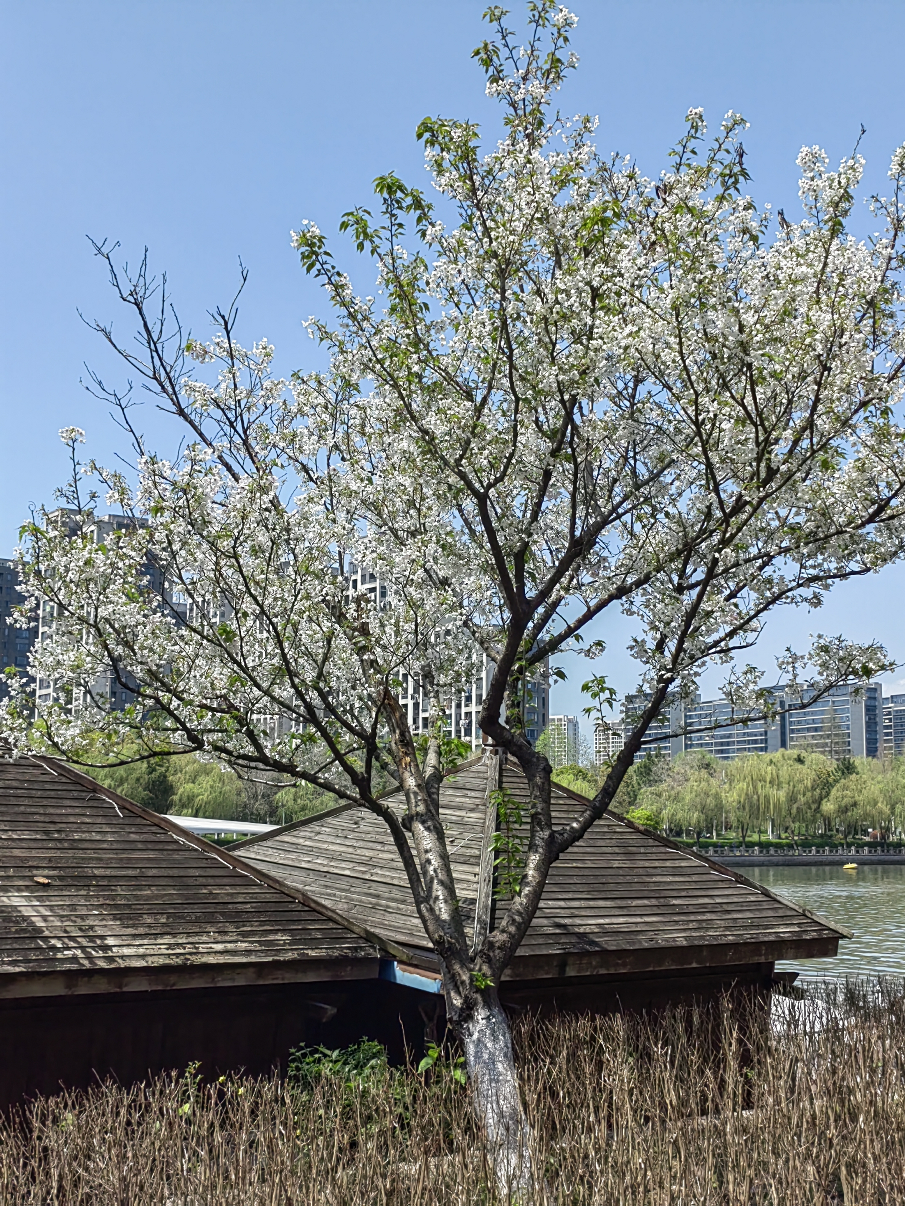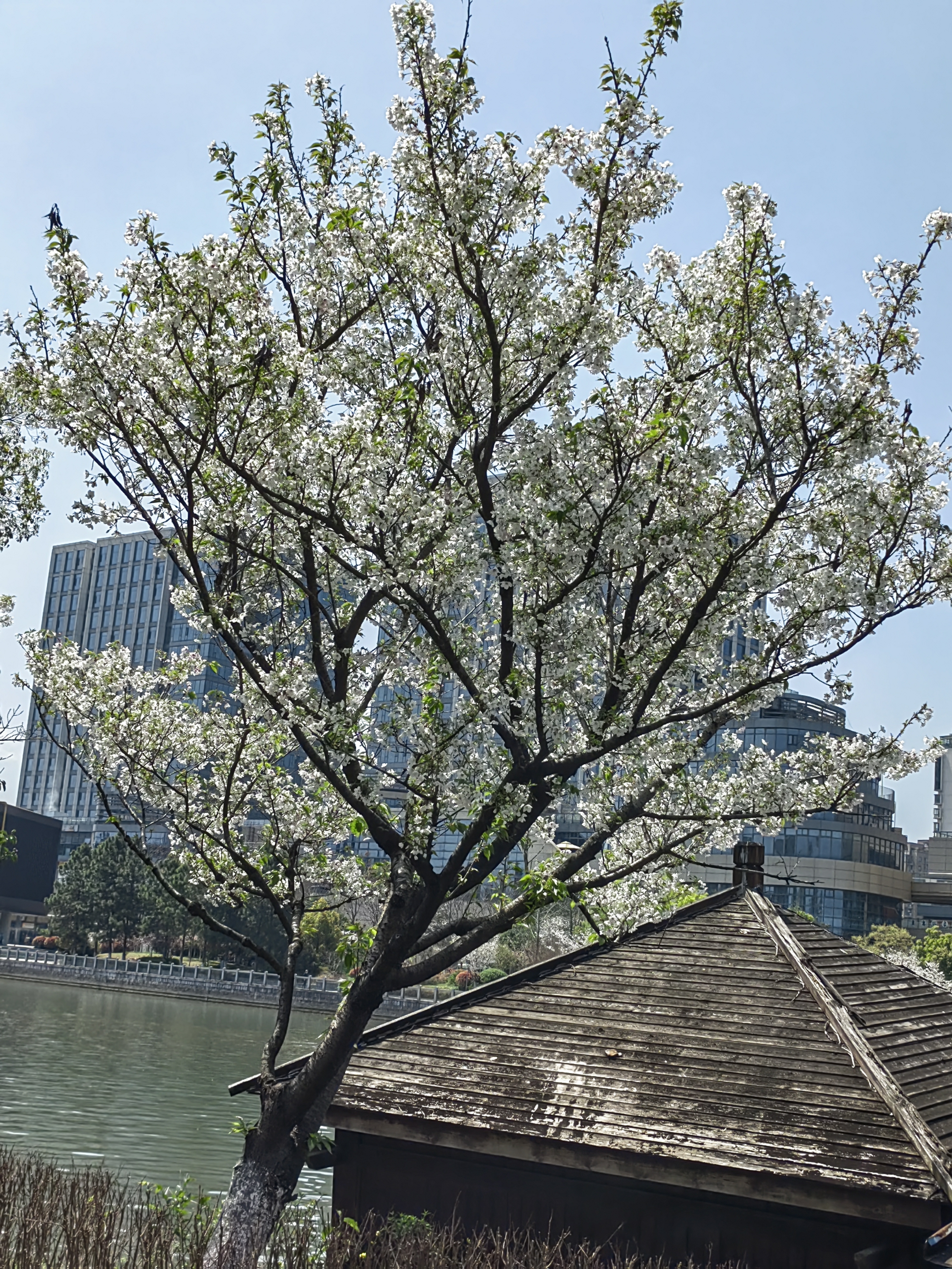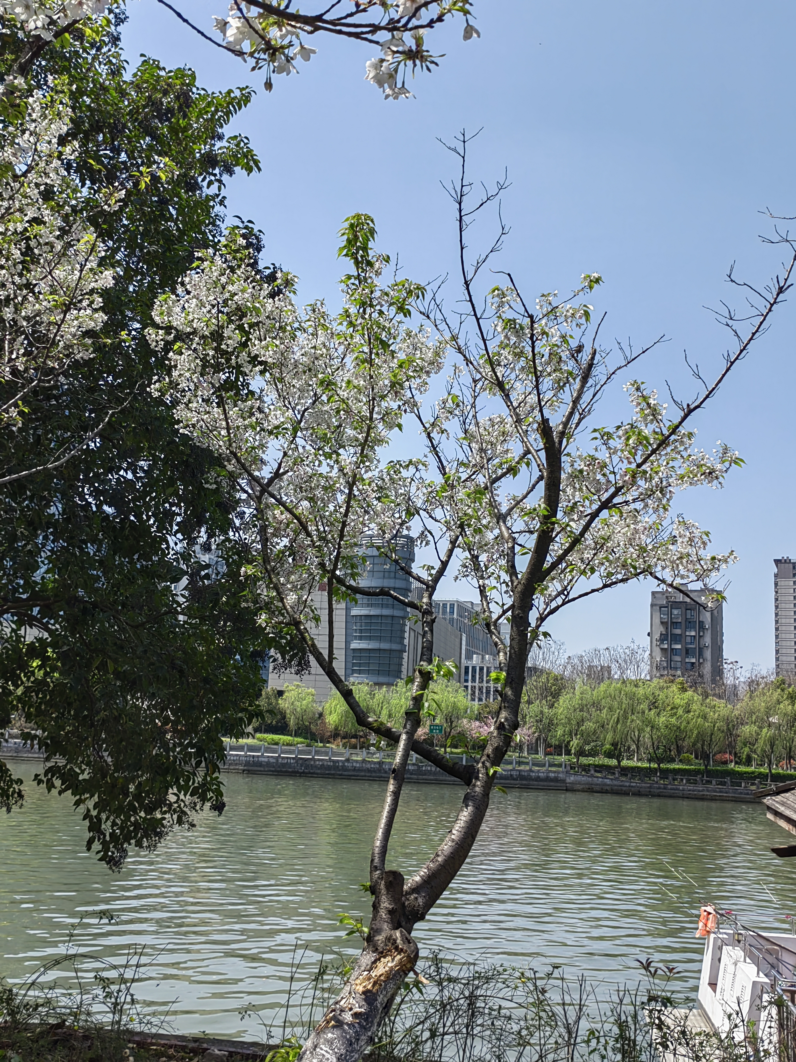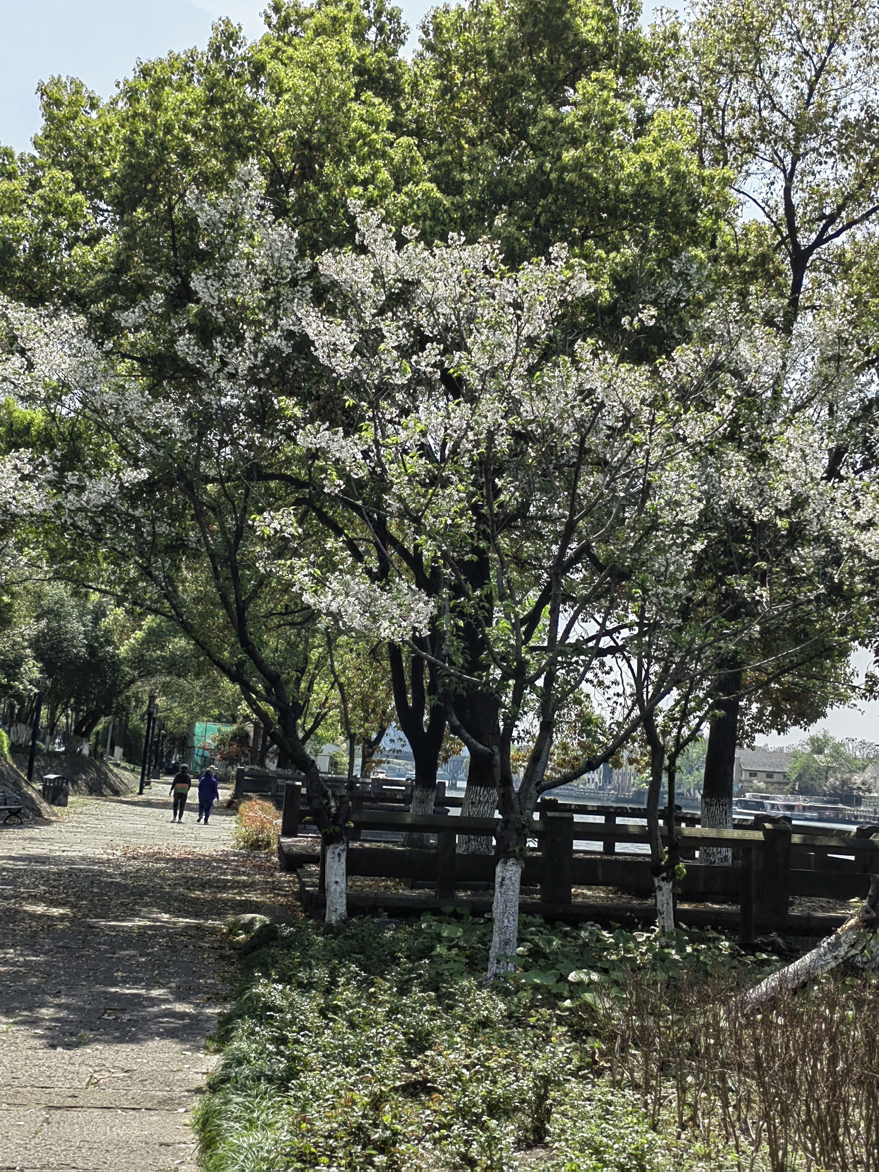 运河北星桥畔的樱花开了!白花繁茂,倒映河面,柳树成行,蓝天晴朗,随手一拍就是春日大片~