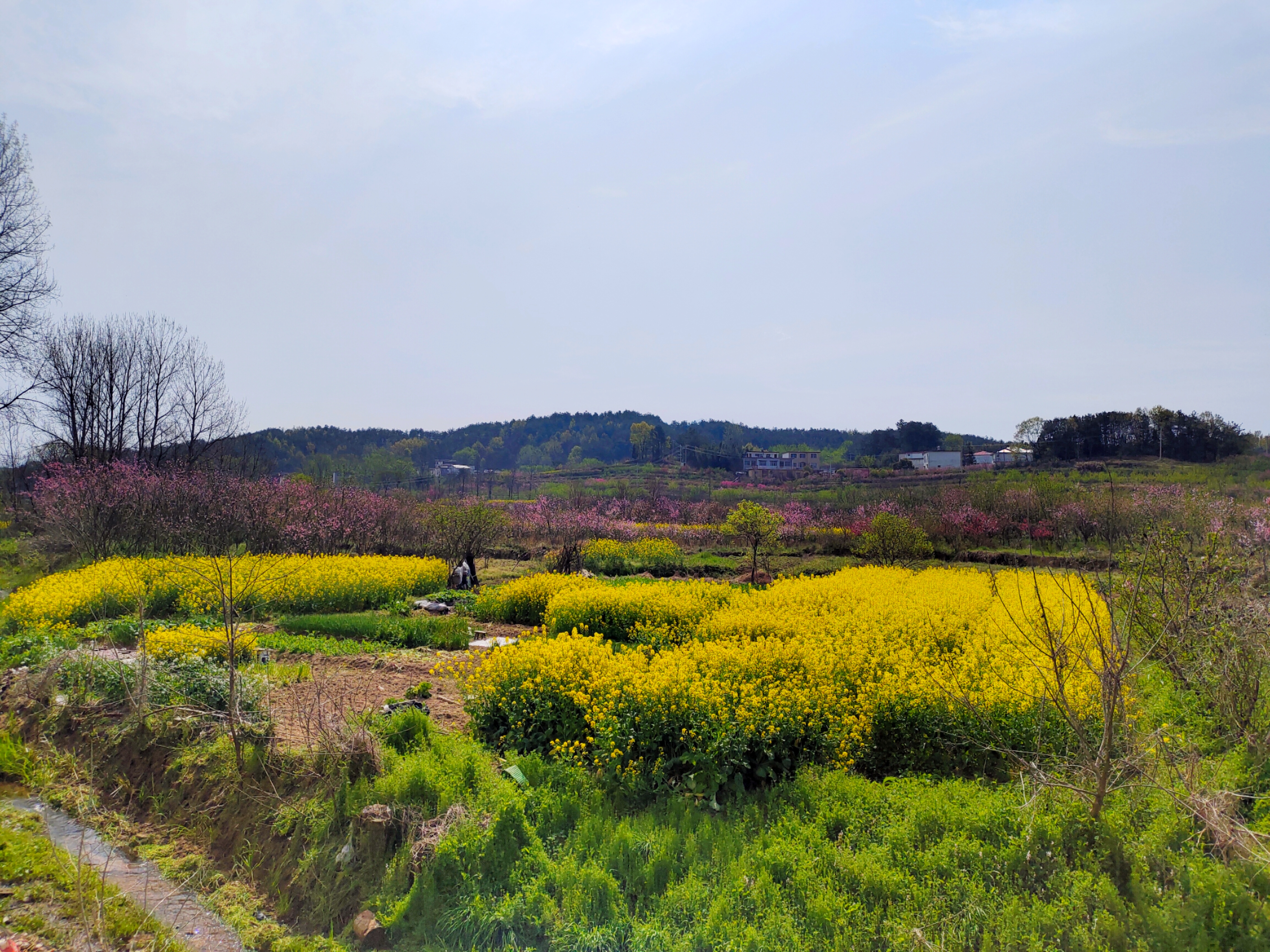 春日信步花径,油菜金浪涌向山丘,桃云浮于白屋檐角,风里全是青草与花开的私语。