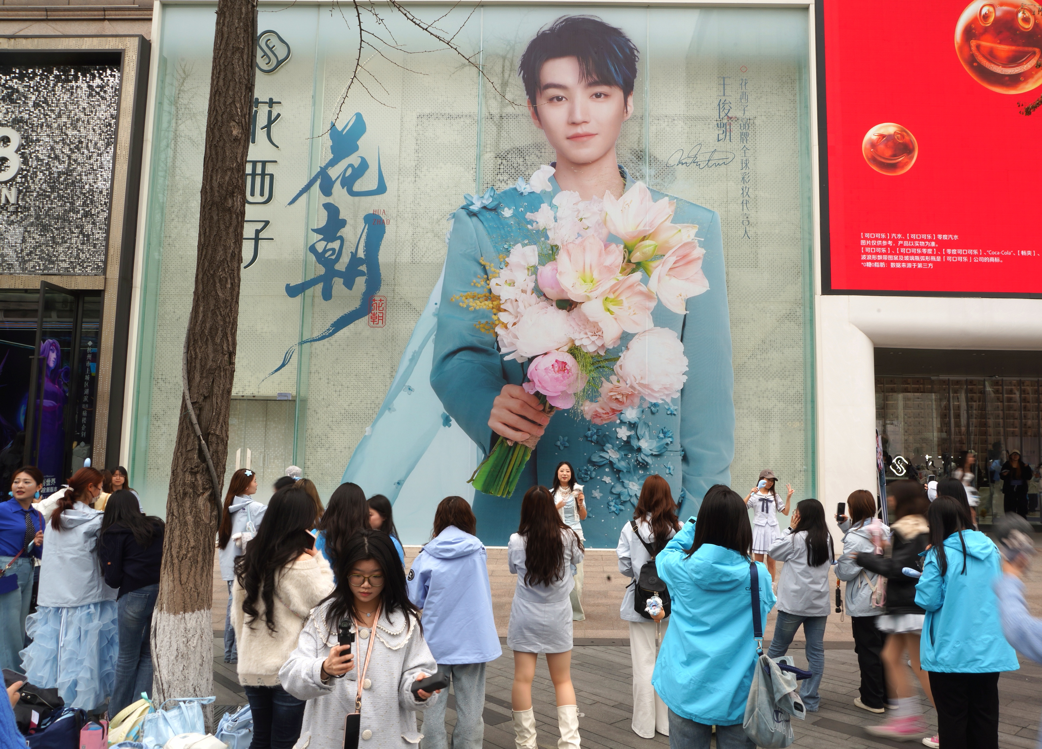 湖滨步行街,不知道为什么他们要在这里拍照,不就是一个广告大屏么!或许,这就是典型的粉丝为偶像线下应援、打卡的场景。