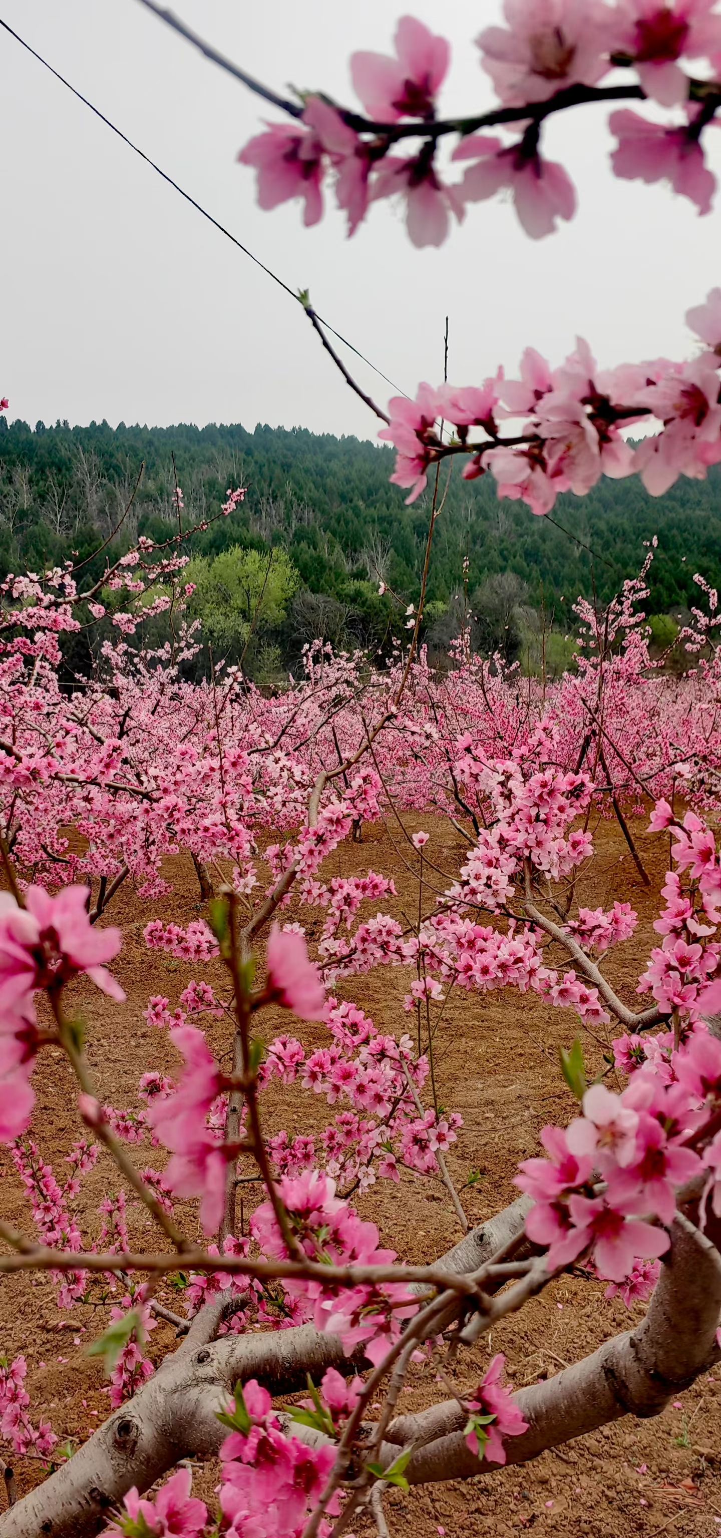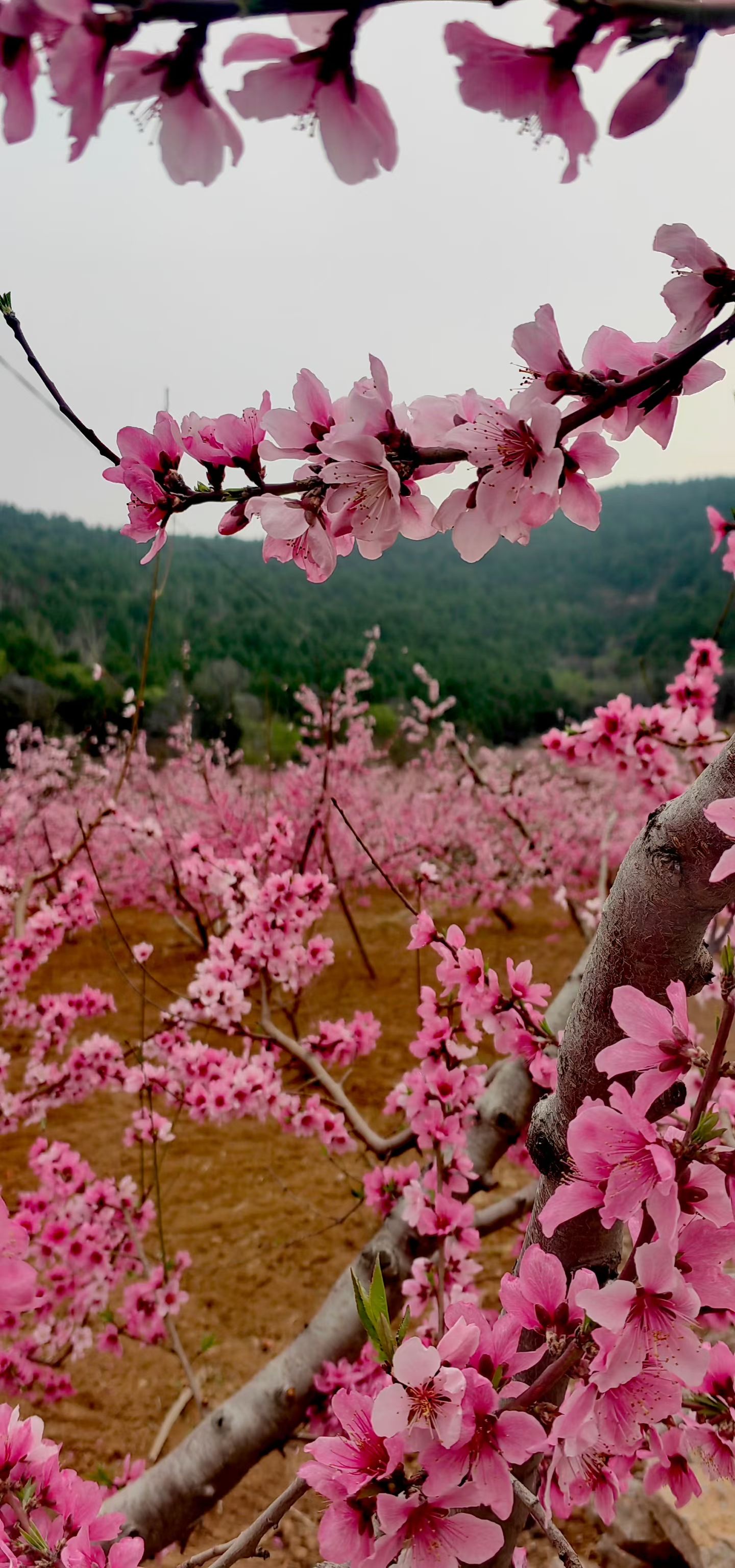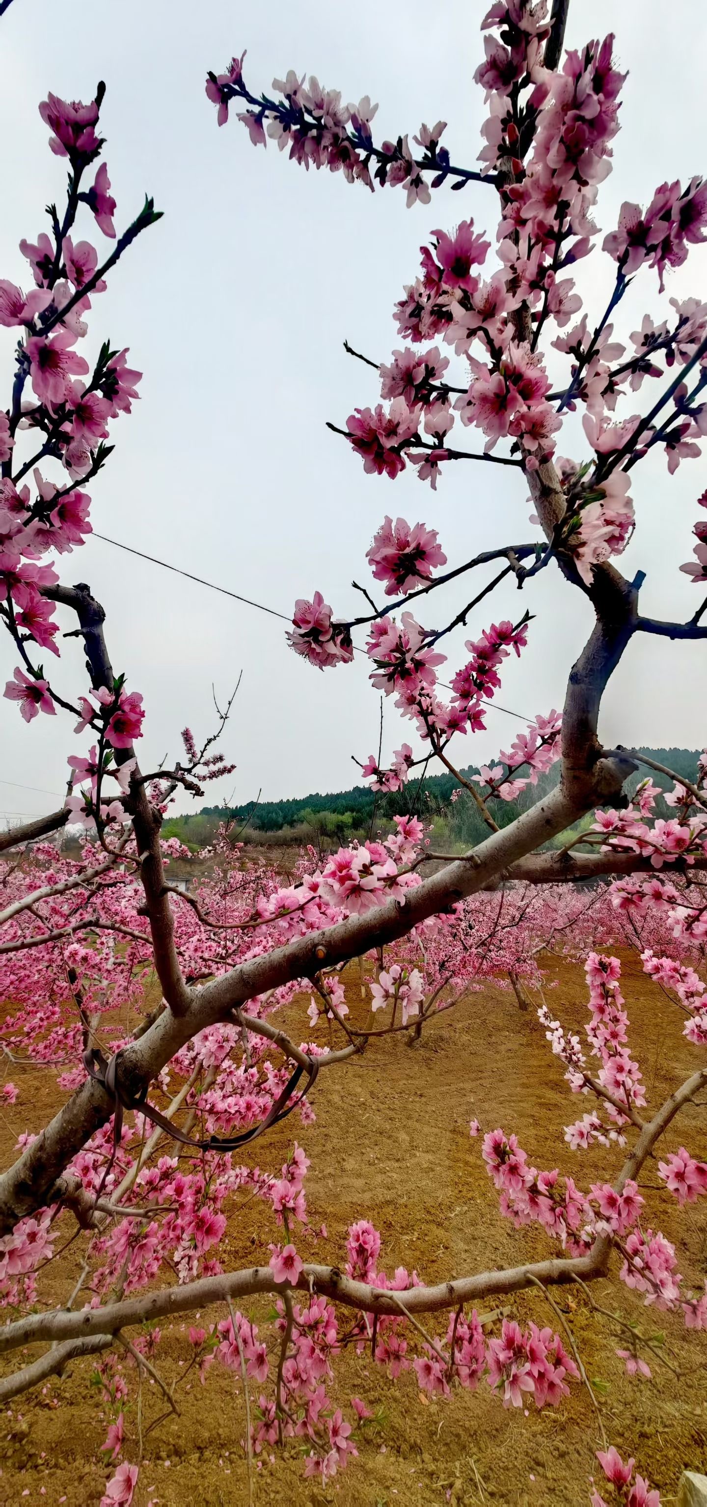 枝头繁花如云,粉染山野;风过处,花瓣轻旋,春在桃园深处低语。