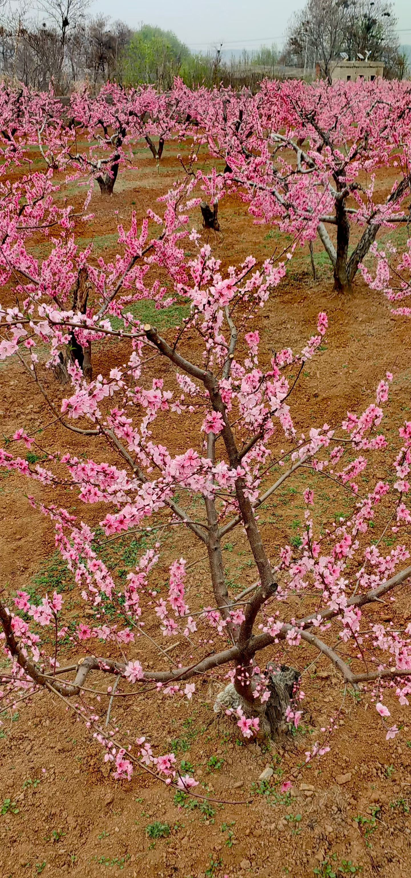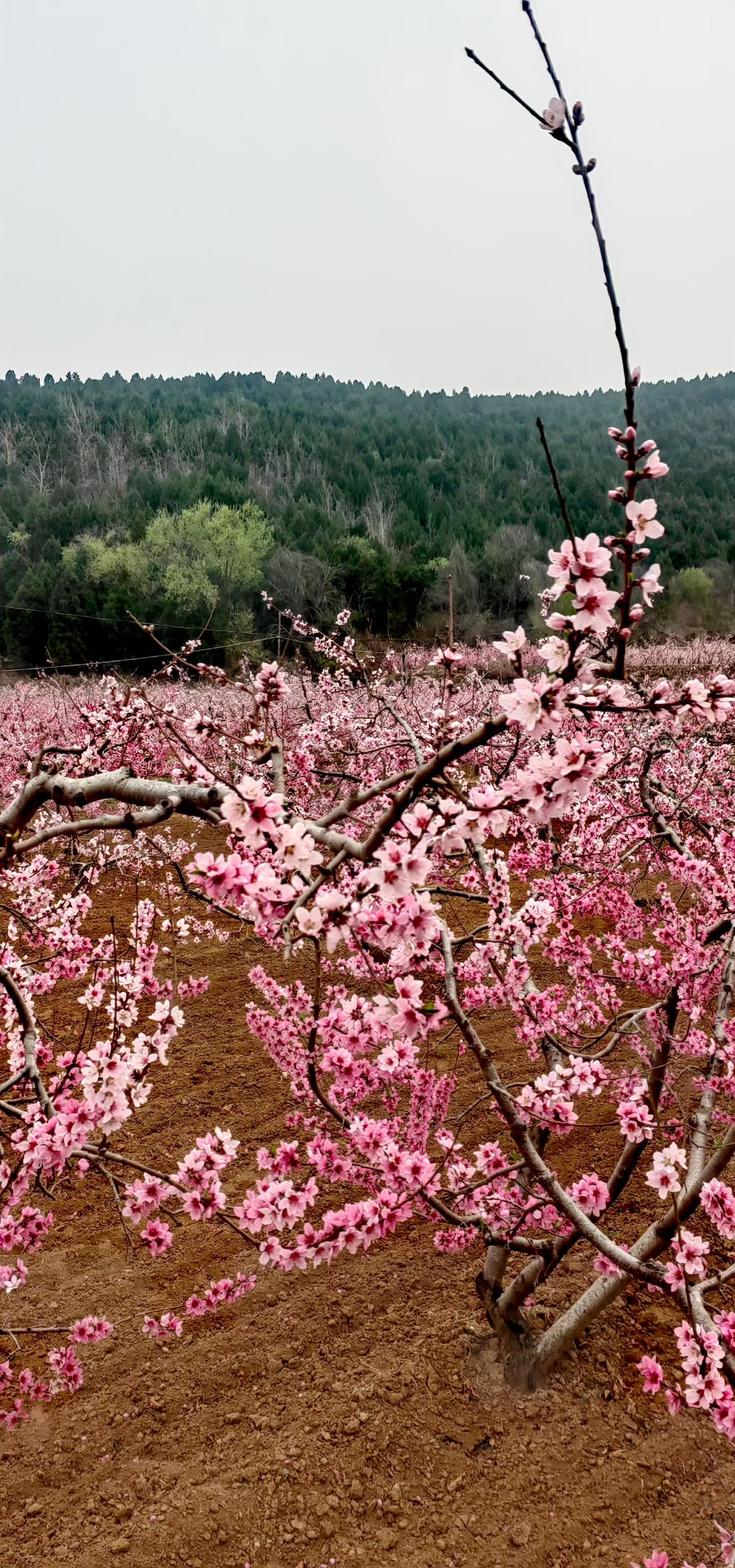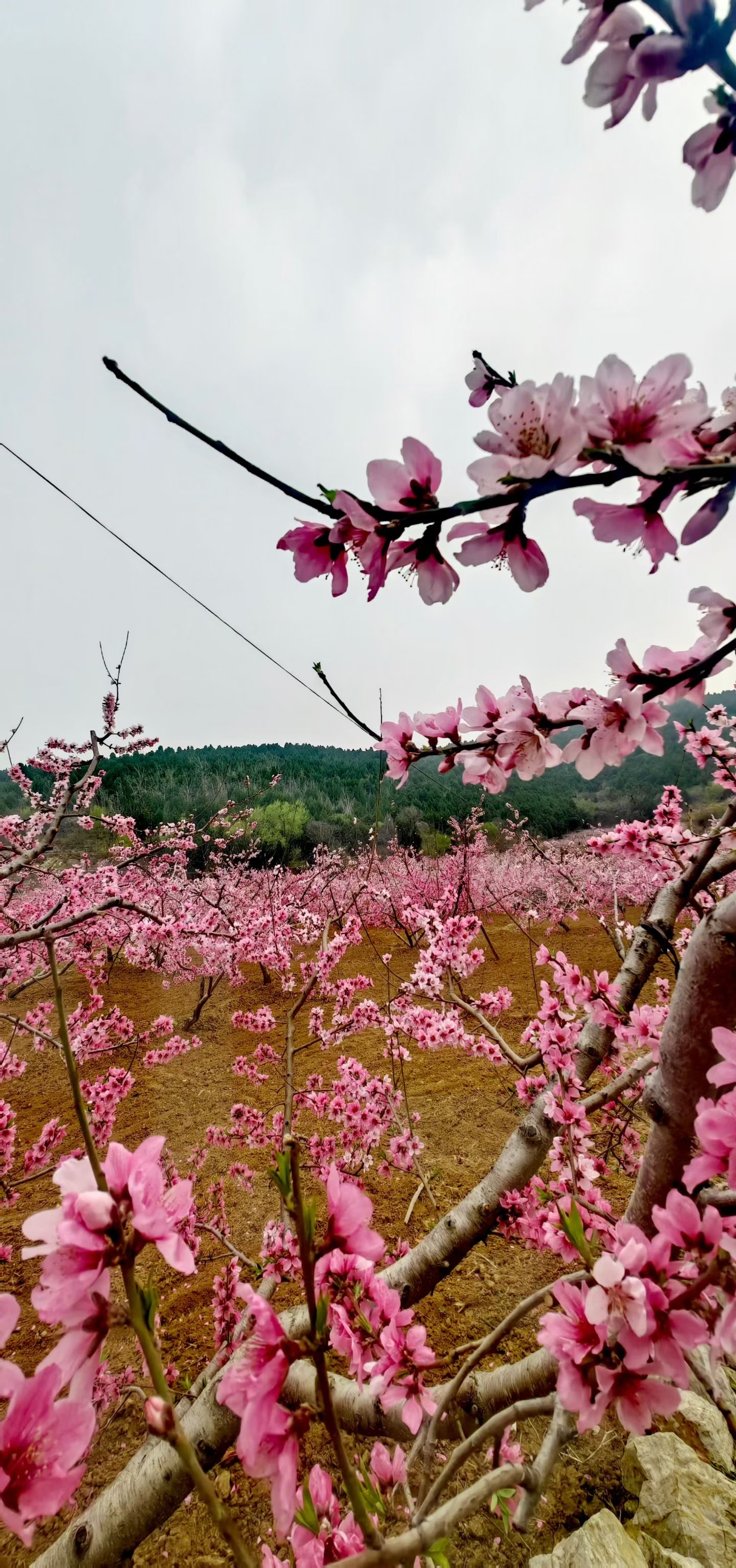 枝头繁花如云,粉染山野;风过处,花瓣轻旋,春在桃园深处低语。