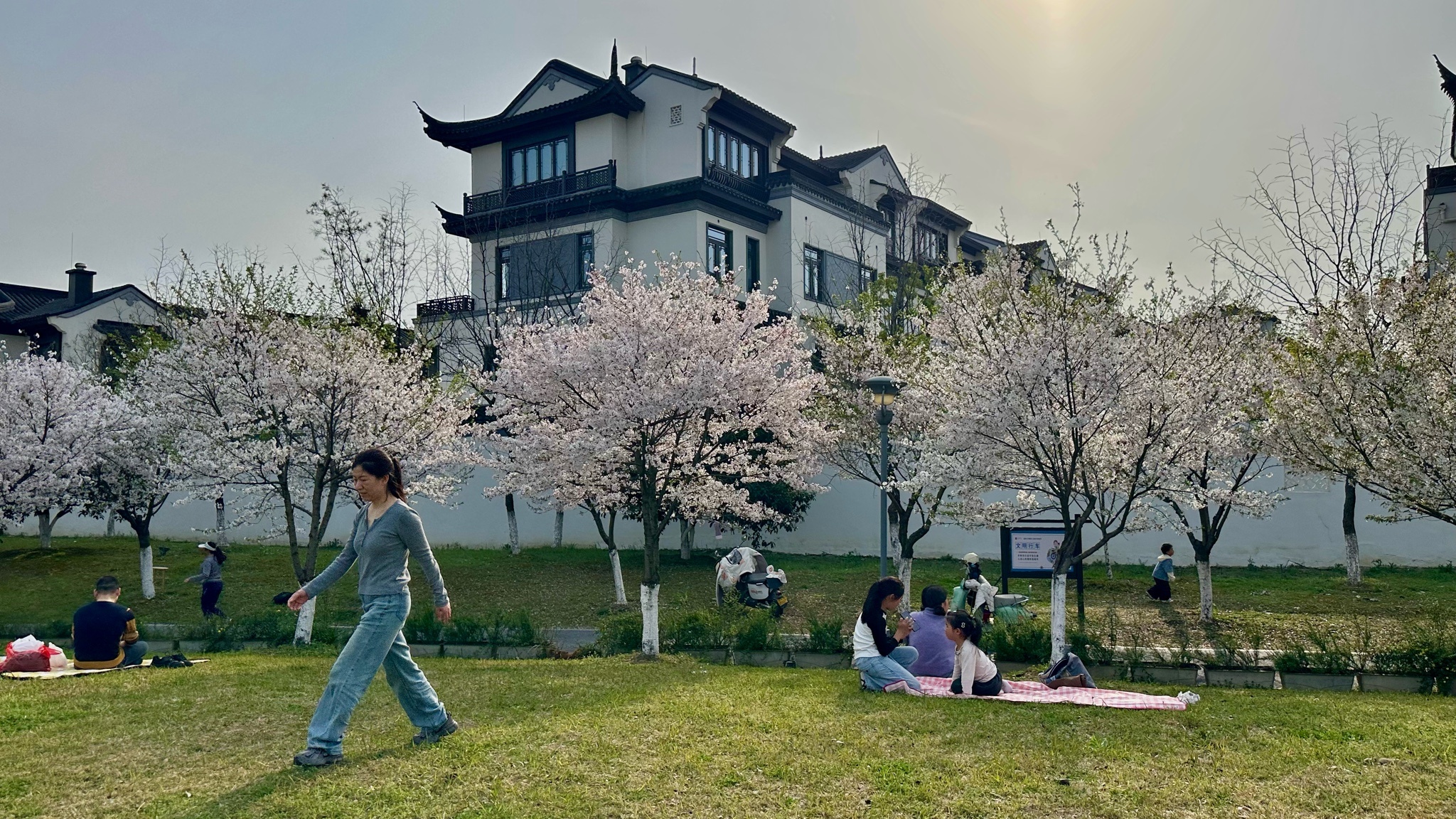 《樱花盛开的时候》樱花簌簌落肩头,白墙黛瓦间,孩子追着光跑过绿茵——春日的江南,是慢放的胶片。