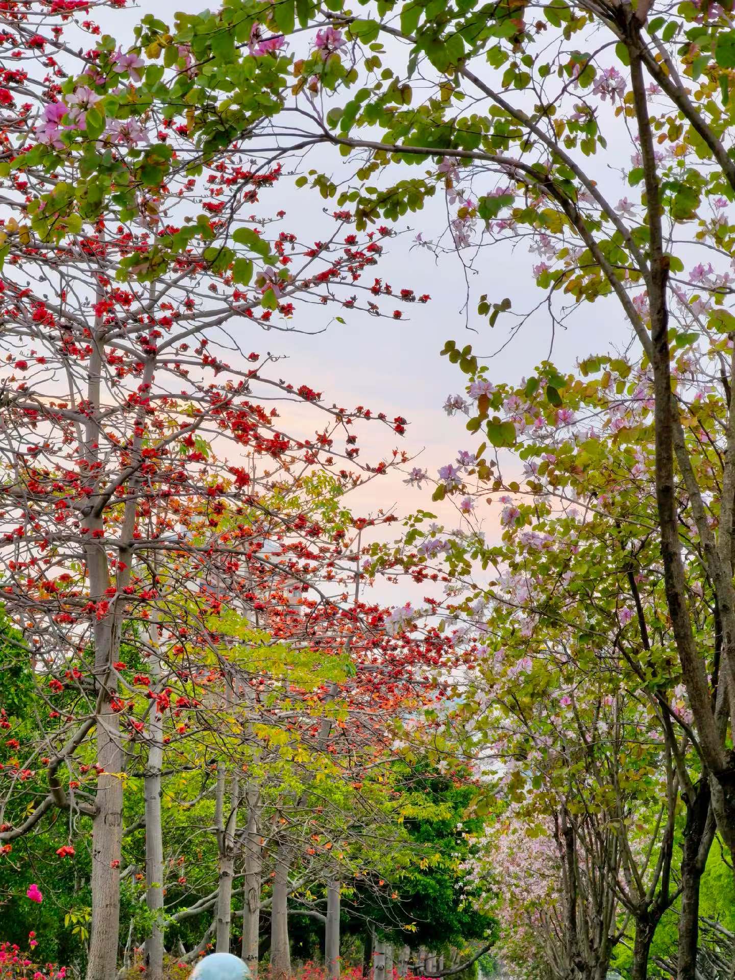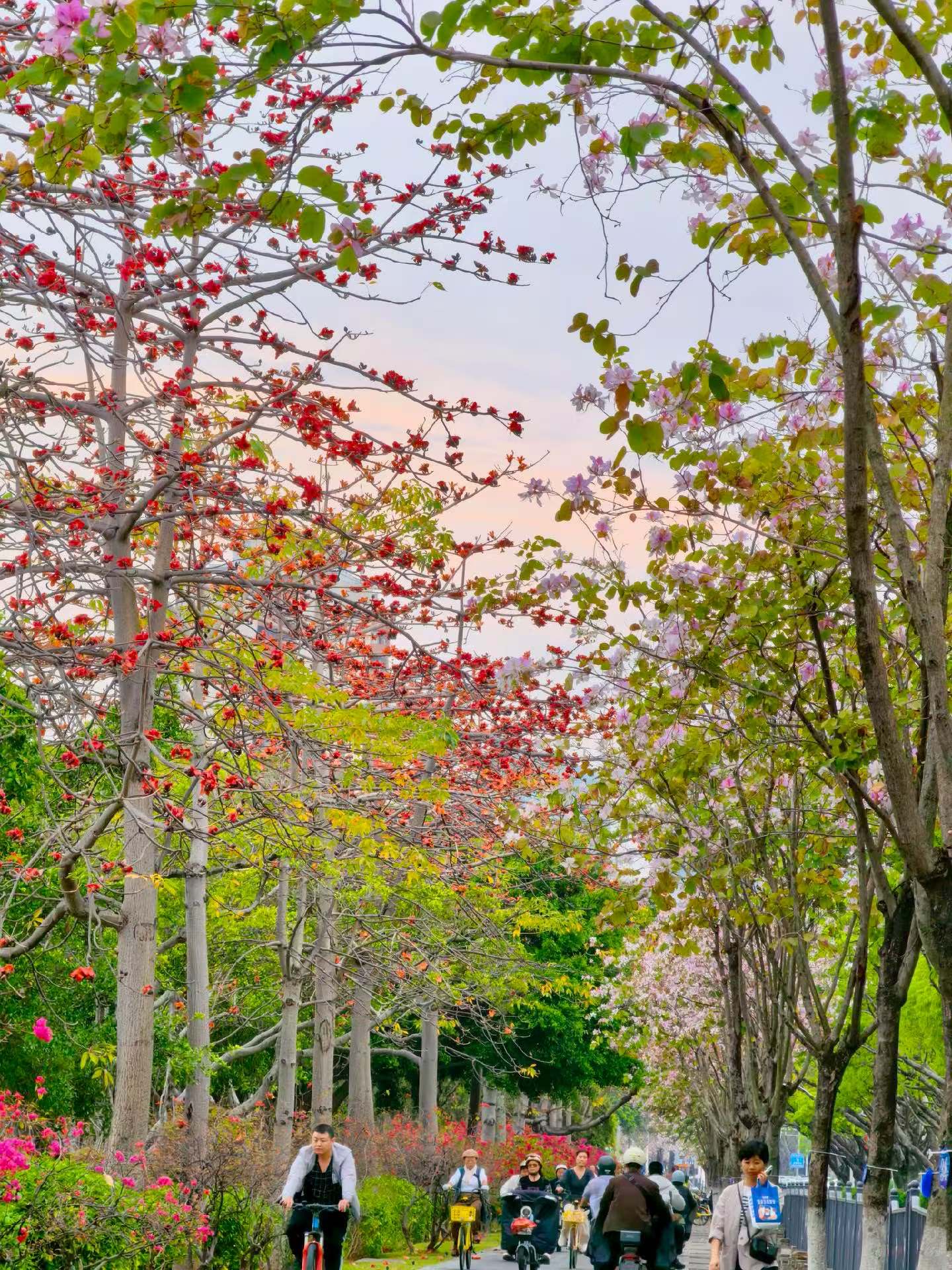 傍晚骑过海珠湖,粉红紫荆与火红木棉在头顶织成花隧道,风里都是春天的味道~