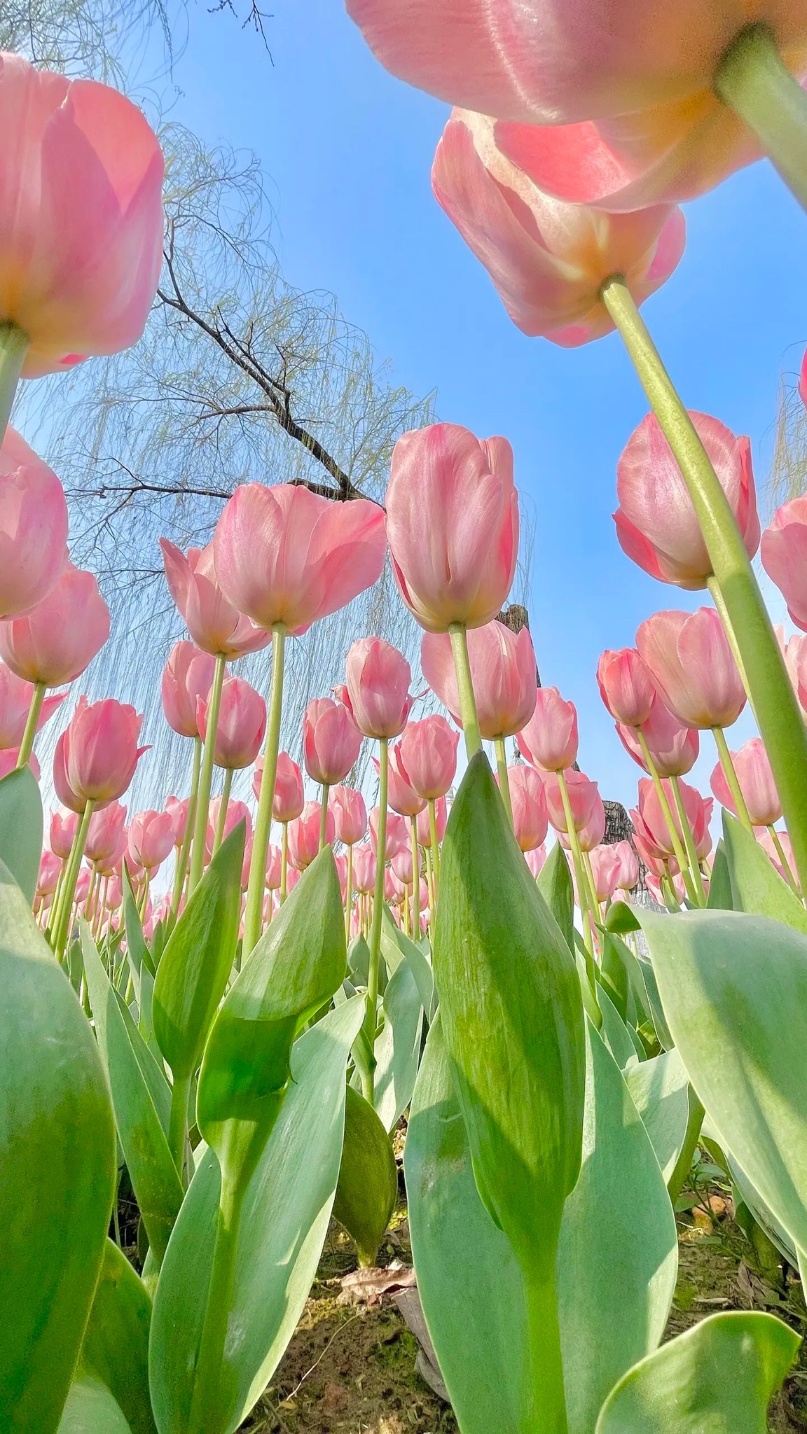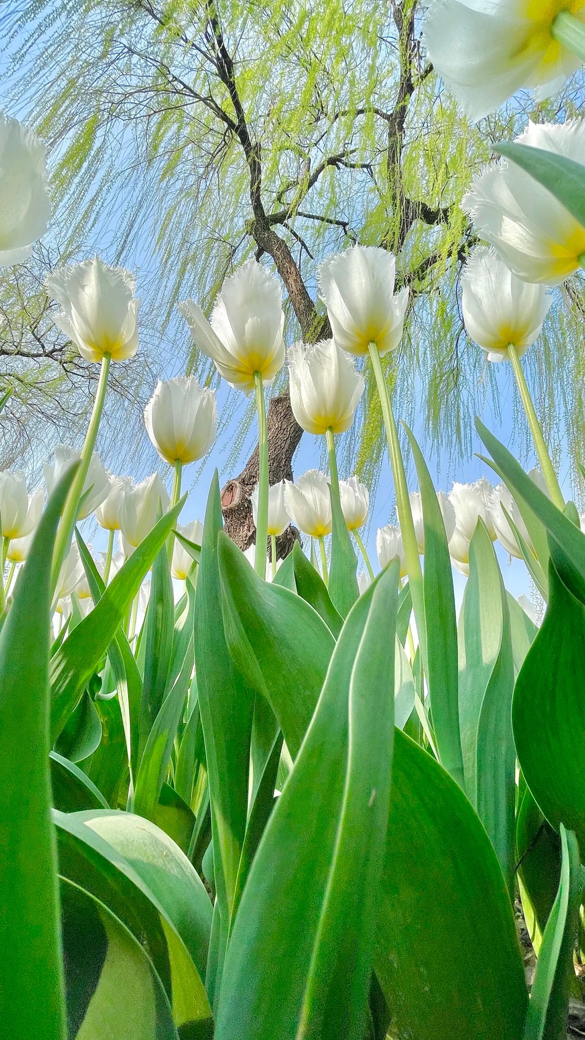 粉色与白色郁金香交织成海,绿叶婆娑,垂柳依依。澄澈蓝天为幕,繁花似锦的花园景观尽显自然生机。镜头定格这一刻,静谧而蓬勃的春季花卉之美跃然眼前。