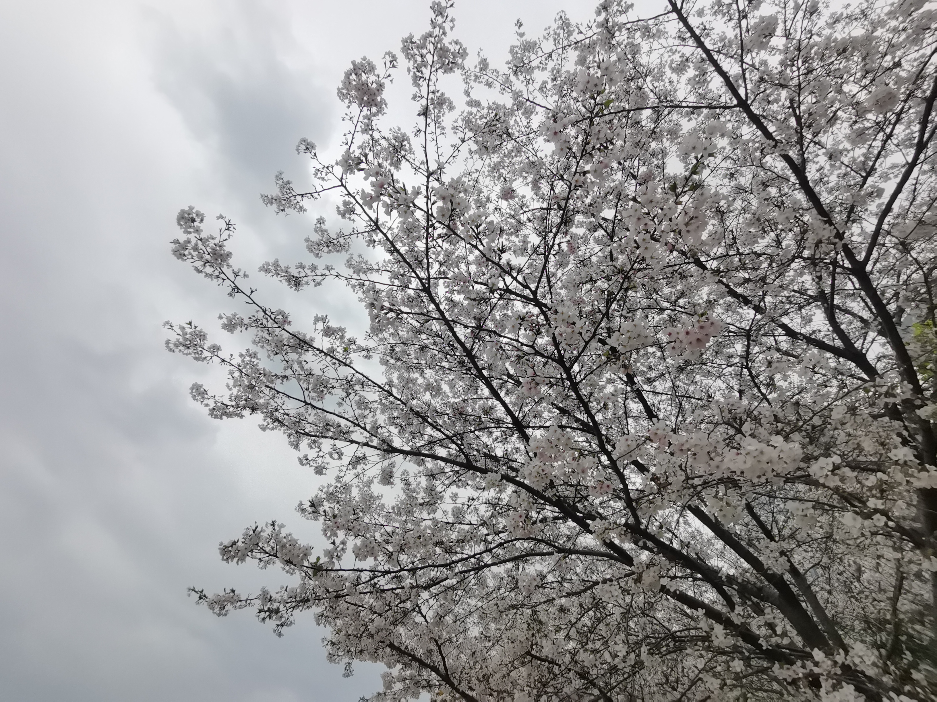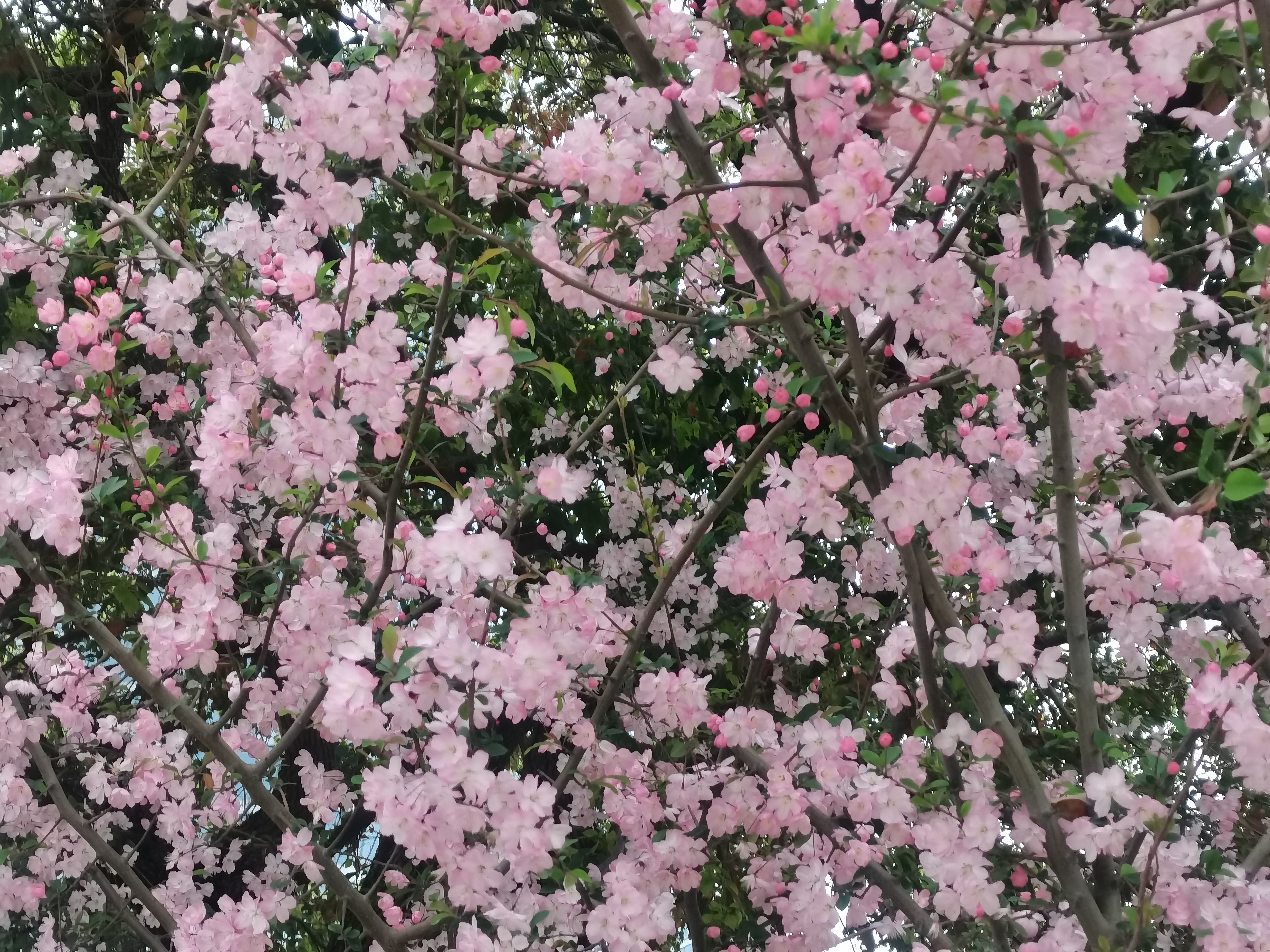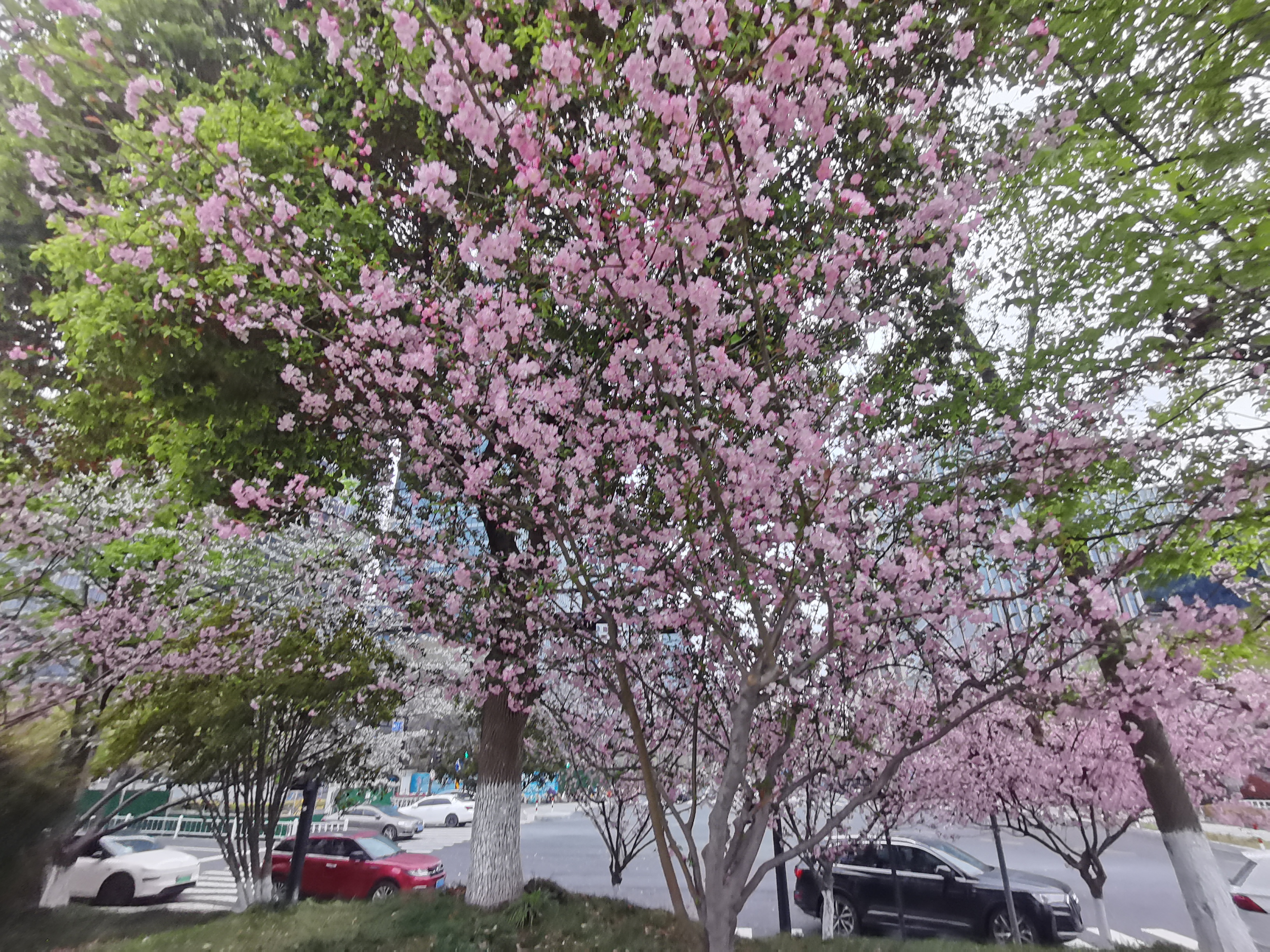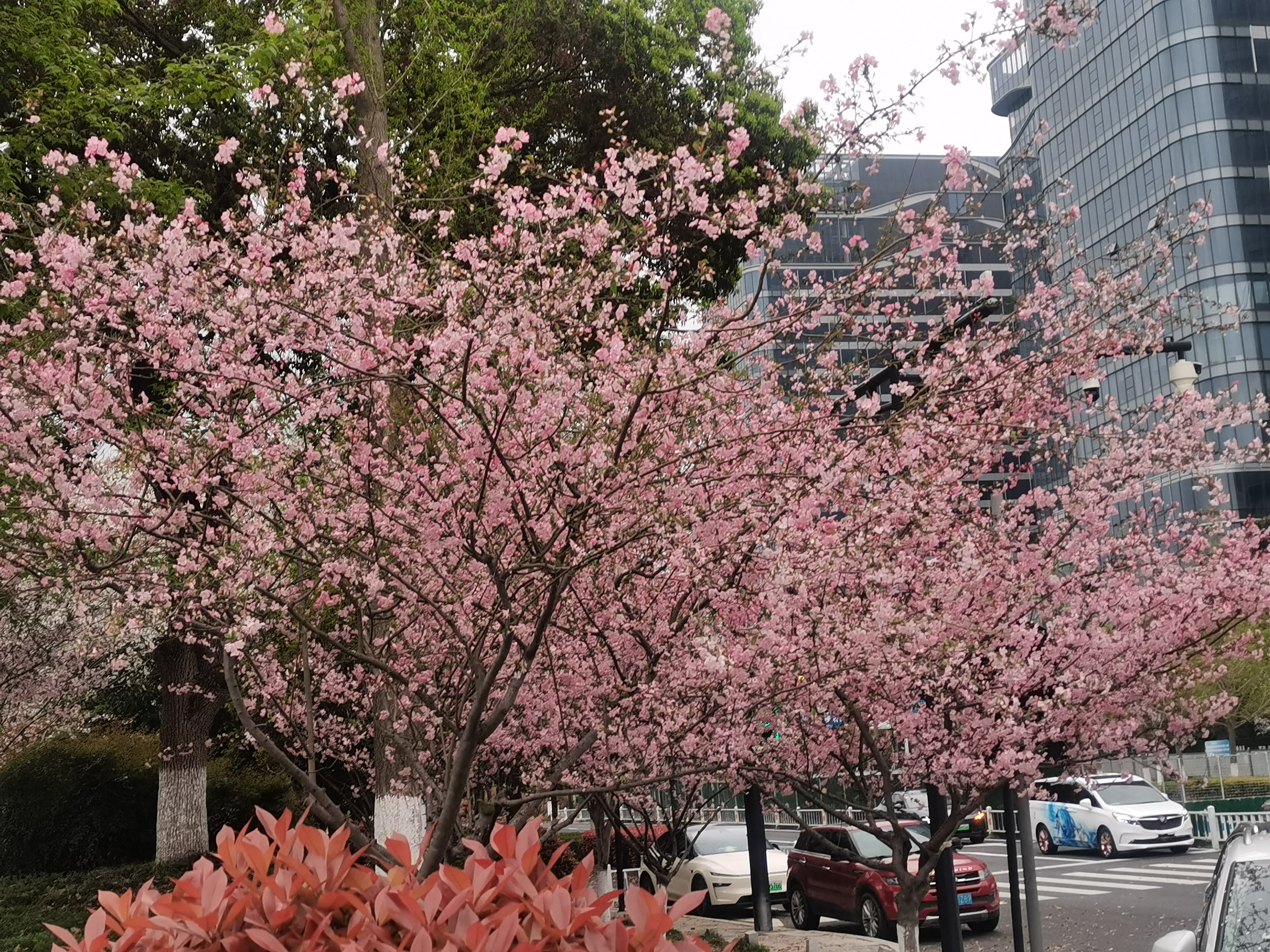 樱花街,粉白花枝与现代建筑撞个满怀~车停路边,抬头就是春日限定滤镜!