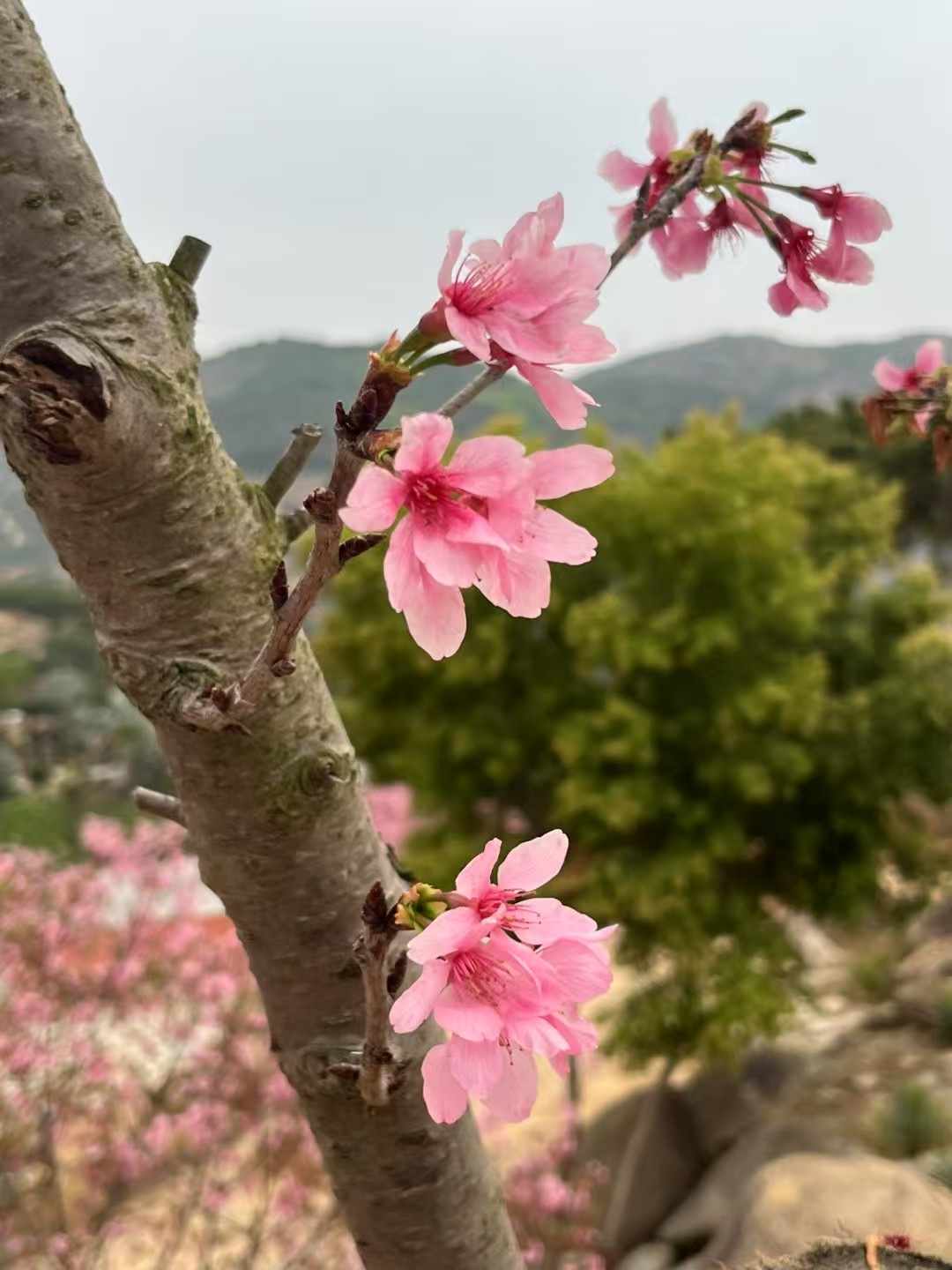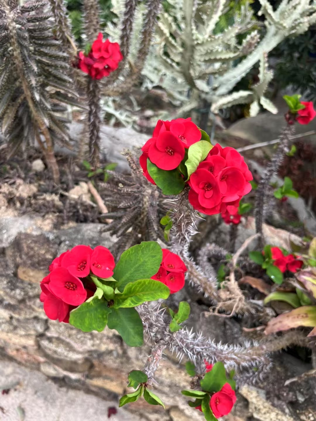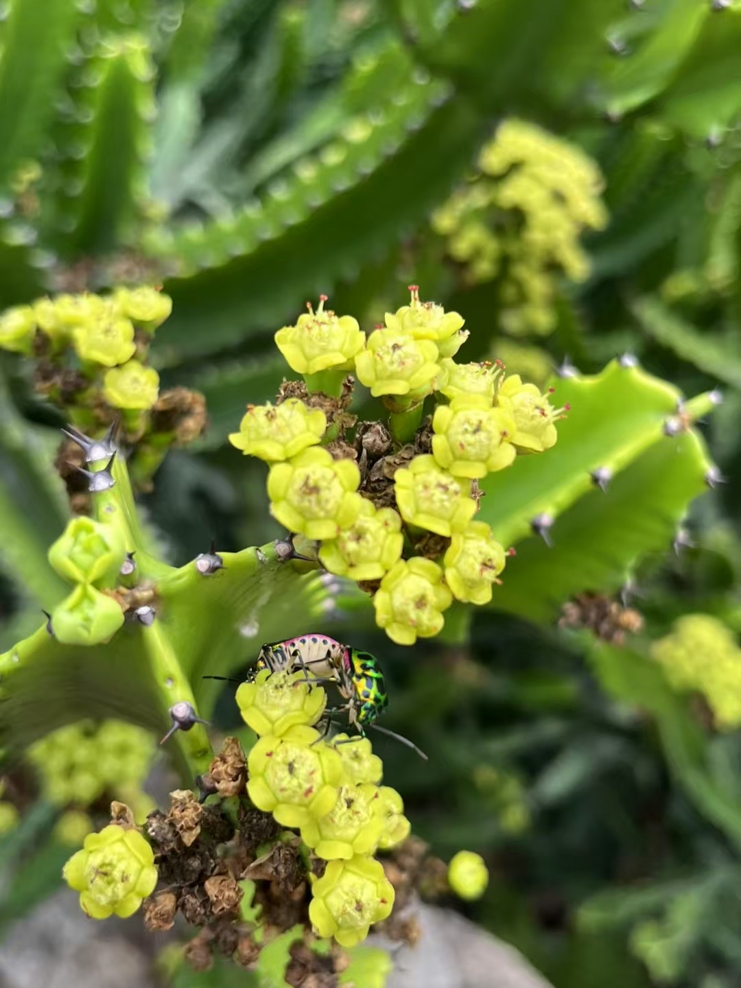 春日山园,大戟黄花缀绿肉,虎刺梅红映粉樱,甲虫轻栖刺茎间,石墙静默,枝影摇曳,万物生息如诗。