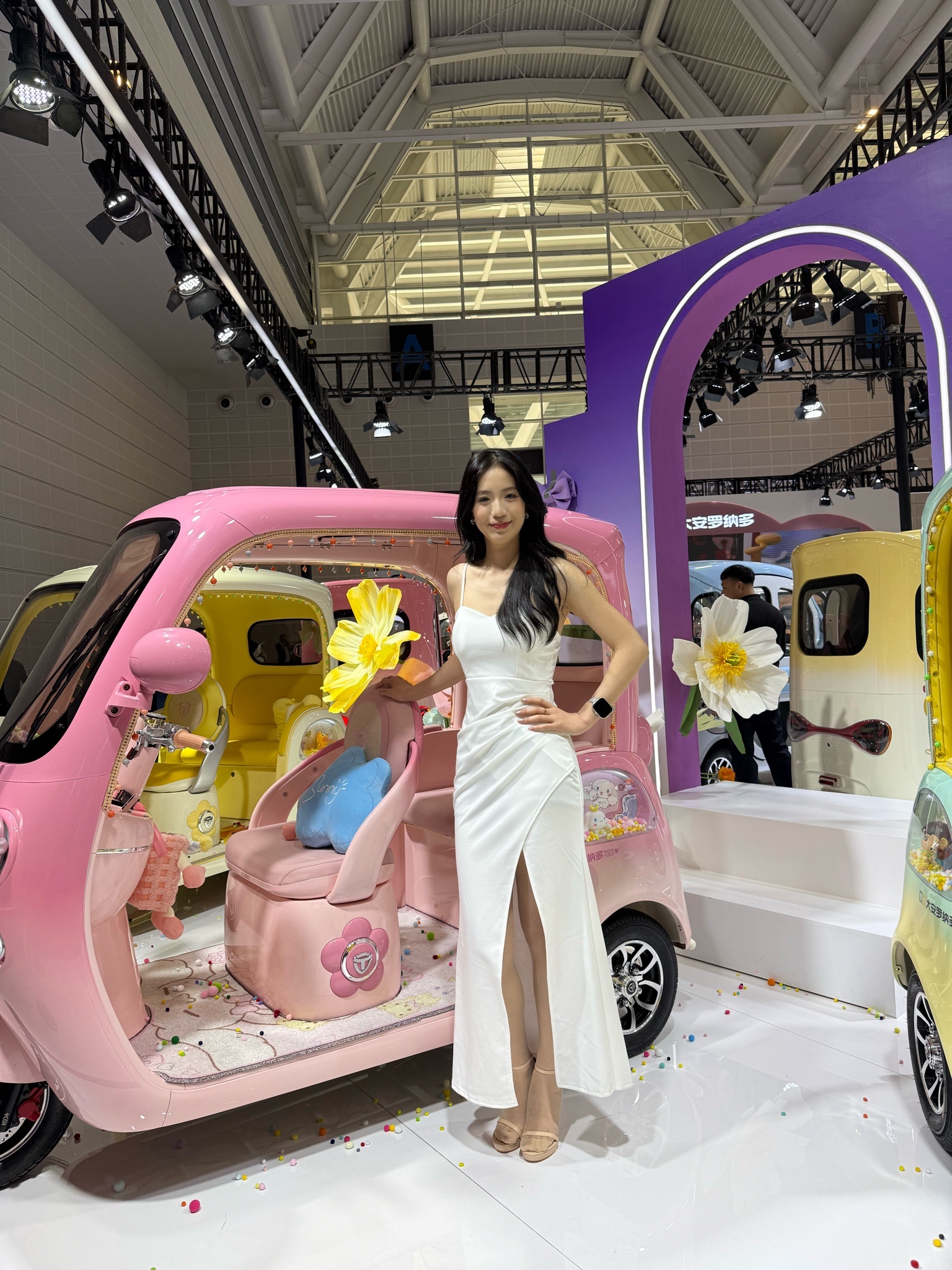 粉色三轮车配白礼服,车展里的小清新暴击!紫色拱门+黄花,可爱到犯规~