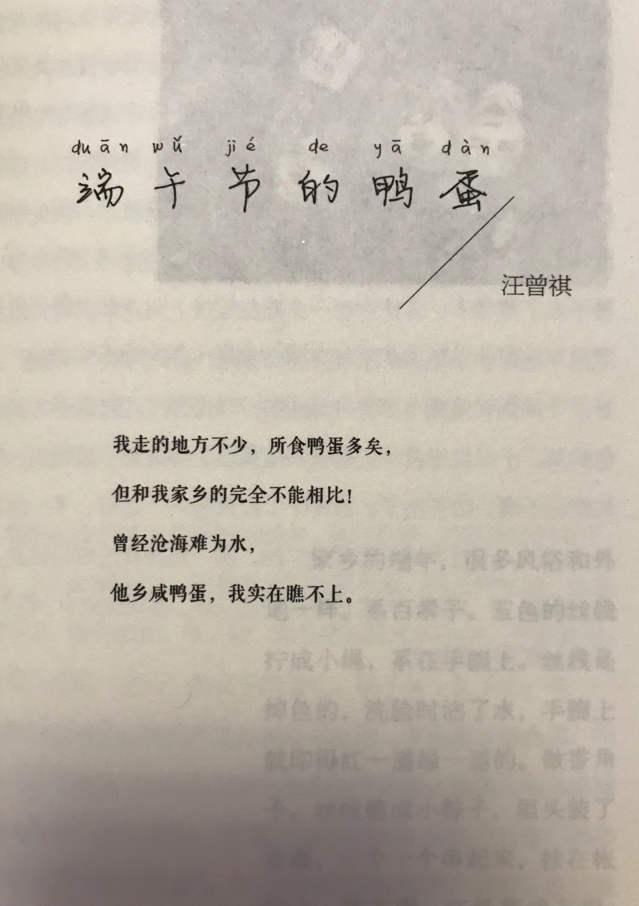 读到汪曾祺写的《端午节的鸭蛋》,让我想起我姥姥,她也特别爱吃咸鸭蛋,尤其是那流油的蛋黄。我偶然在网上看到有卖那种罐装的咸蛋黄酱,说是特别香,我就赶紧买了一罐,第一罐送过去后,姥姥尝了觉得特别好吃,直夸这酱“沙沙的,香香的,跟现磕的鸭蛋黄一个味儿”。看到她这么喜欢,我心里特别高兴,后来又陆续给她买了很多罐。每次见面,她都会念叨这酱,说抹在馒头上,或者拌在粥里,吃得特别开心。 现在每次看到咸鸭蛋,或者闻到那种特有的咸香味,我都会想起姥姥吃到蛋黄酱时满足的样子。汪曾祺怀念的是家乡的鸭蛋,而我,是借着这小小的咸蛋黄,一遍遍地想念着已经离开的姥姥。那份亲情,就像这咸蛋黄的油一样醇厚,永远在心里流淌。