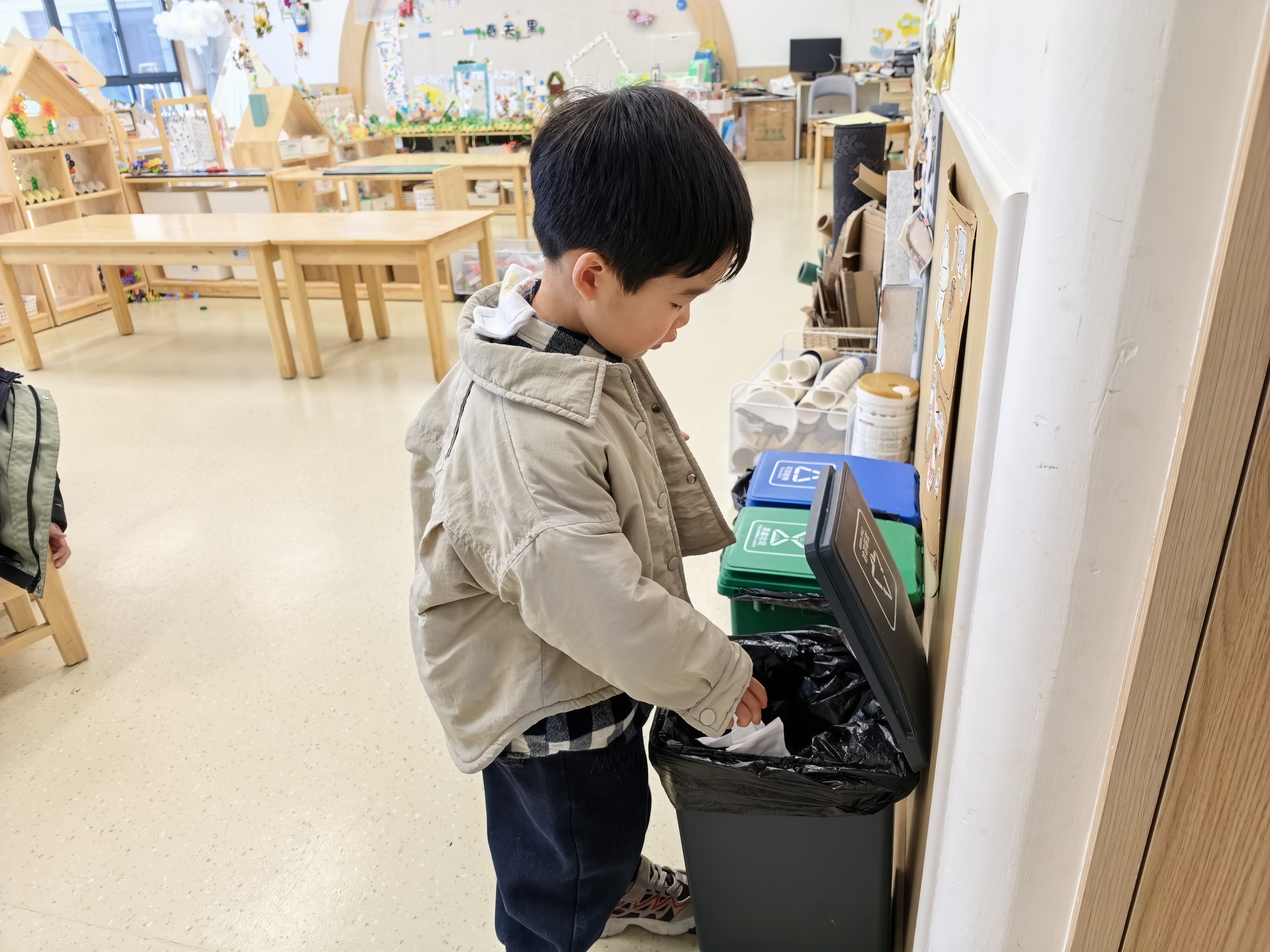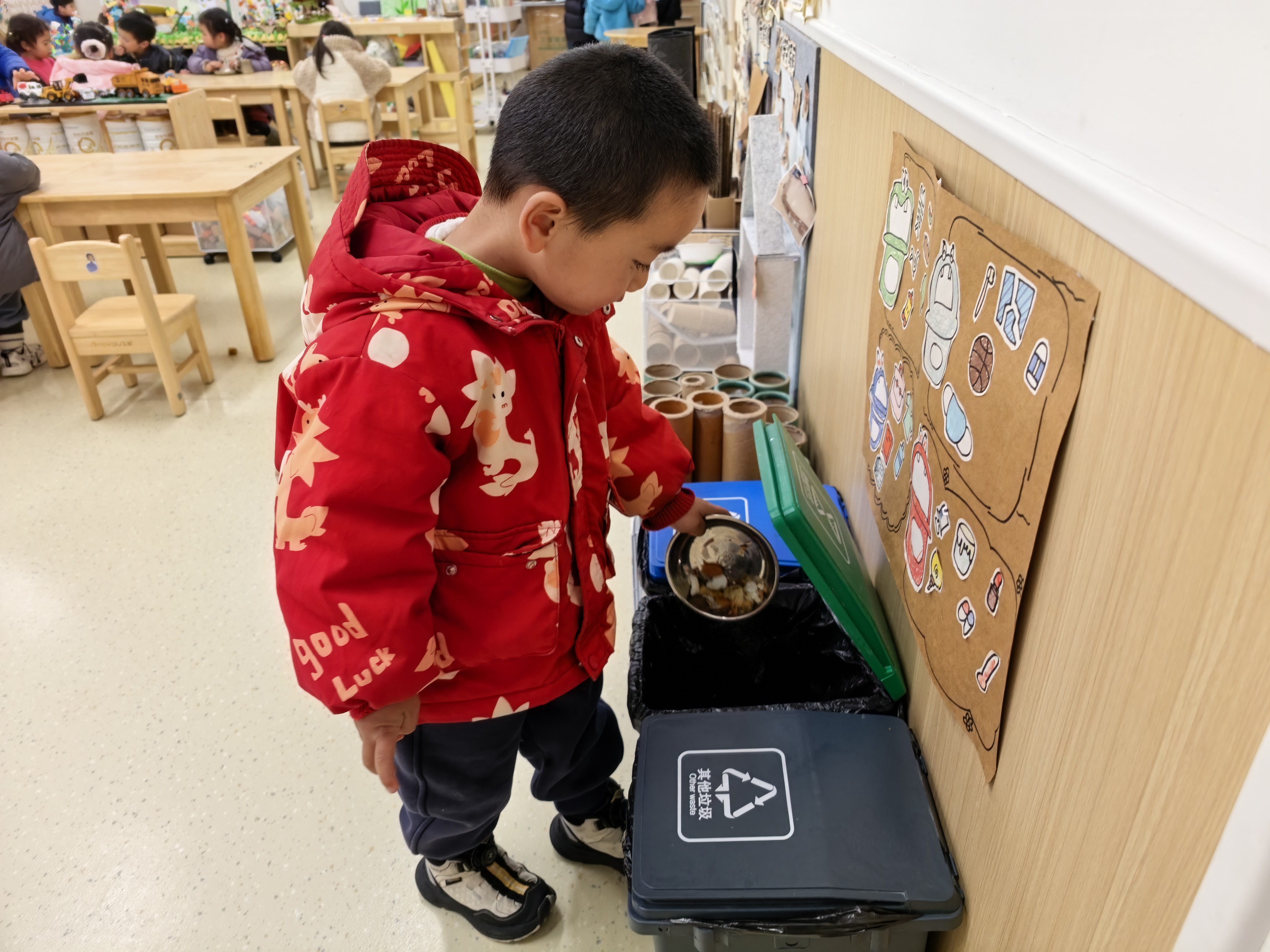 萌娃学分类,环保小当家 为积极响应环保号召,让垃圾分类理念融入幼儿日常生活,我们开展了以“萌娃学分类,环保小当家”为主题的系列活动。活动从巩固已有知识出发,带领孩子们重温四色垃圾桶的用途,再通过垃圾分类儿歌学习与趣味表演,让抽象的环保知识变得生动有趣。 一、认识四色“环保卫士” 活动伊始,孩子们在老师的带领下,重新认识了四位“环保卫士”——四色垃圾桶。通过直观的图片展示和生动的讲解,孩子们区分了红、灰、蓝、绿四种桶的不同用途。 二、趣味学唱:垃圾分类 为了让枯燥的知识变得生动有趣,孩子们学习了欢快的垃圾分类儿歌。朗朗上口的歌词搭配可爱的动作,让孩子们在边念边做中轻松记住了分类规则。随后,孩子们分组进行情景表演,化身垃圾分类员,生动演绎了垃圾分类的过程。在欢声笑语中,环保知识悄然内化。 三、闯关实践:分类游戏 在精彩的“贴一贴”游戏环节,孩子们化身小小分类能手。他们仔细观察,认真思考,准确地将一张张卡片贴进了对应的分类框中。在闯关挑战中,孩子们不仅巩固了分类知识,还锻炼了观察力与动手能力,脸上洋溢着成功的喜悦。 本次环保主题活动圆满落幕。从认识四色桶到学唱儿歌,再到趣味闯关,孩子们在沉浸式体验中学会了分类,树立了环保意识。此次活动不仅培养了孩子的良好习惯,也为家园共育绿色理念搭建了桥梁。
