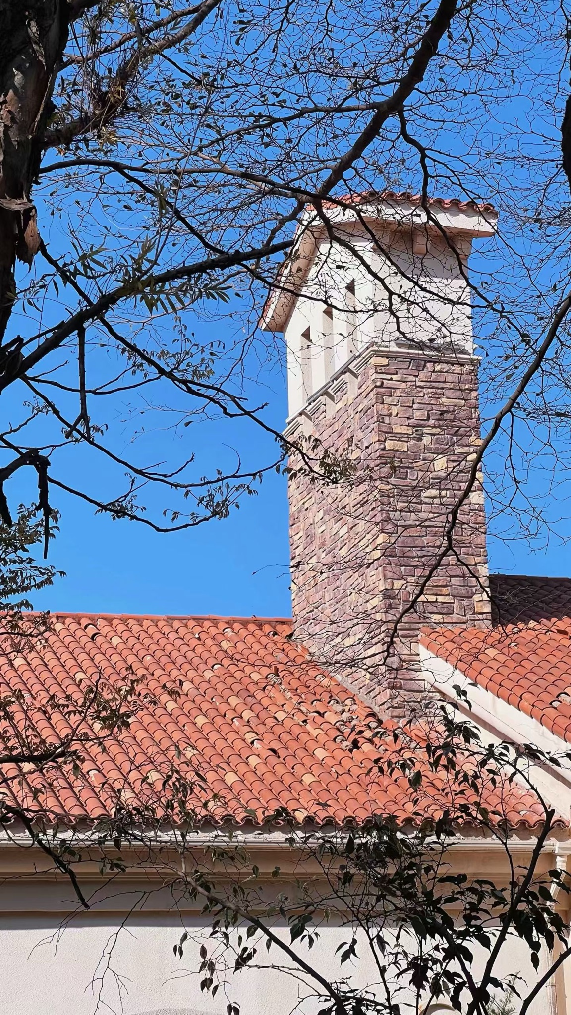 红瓦白墙吻蓝天,砖砌烟囱静立,枝影婆娑间,地中海的风轻轻拂过屋檐。