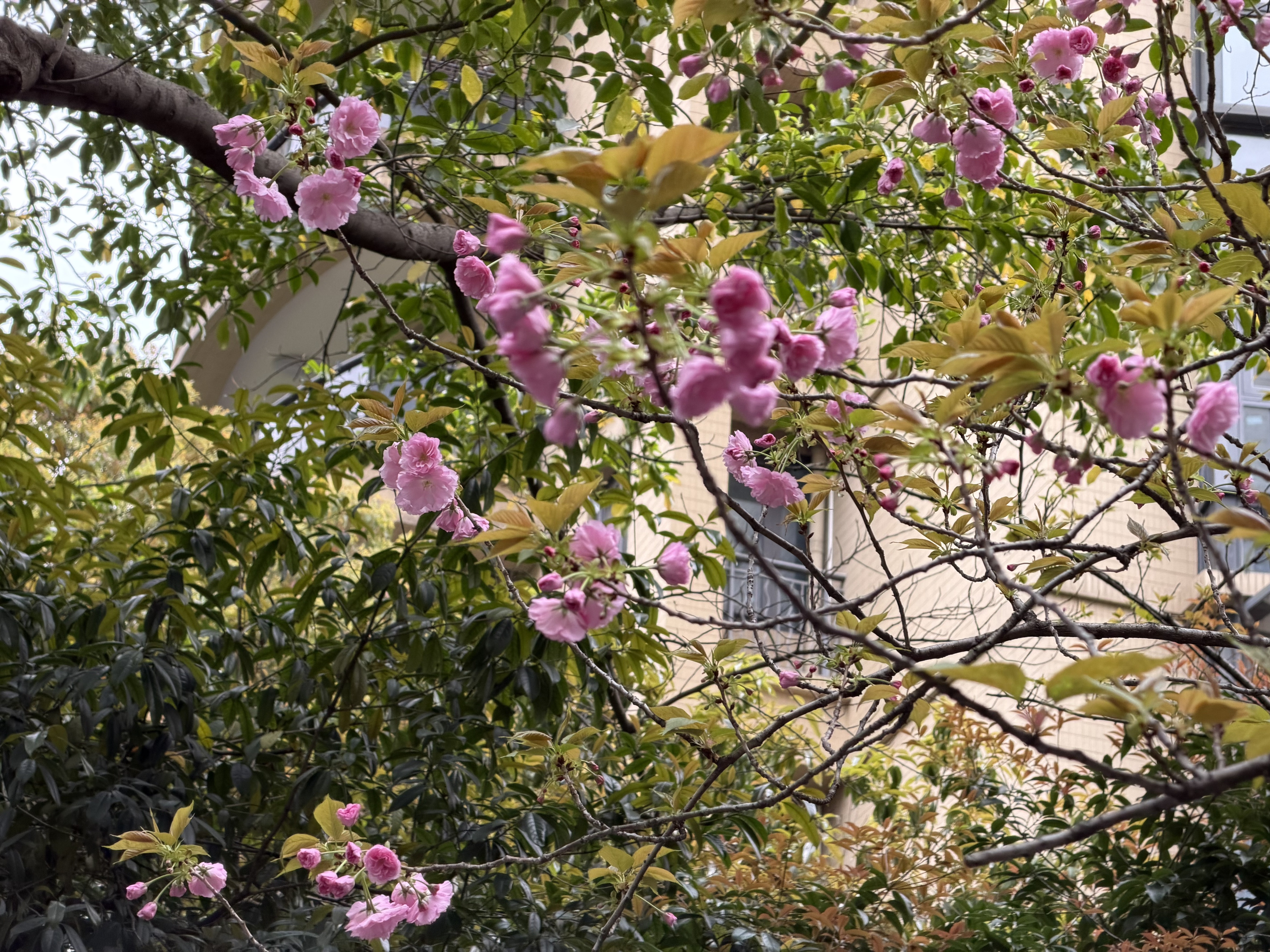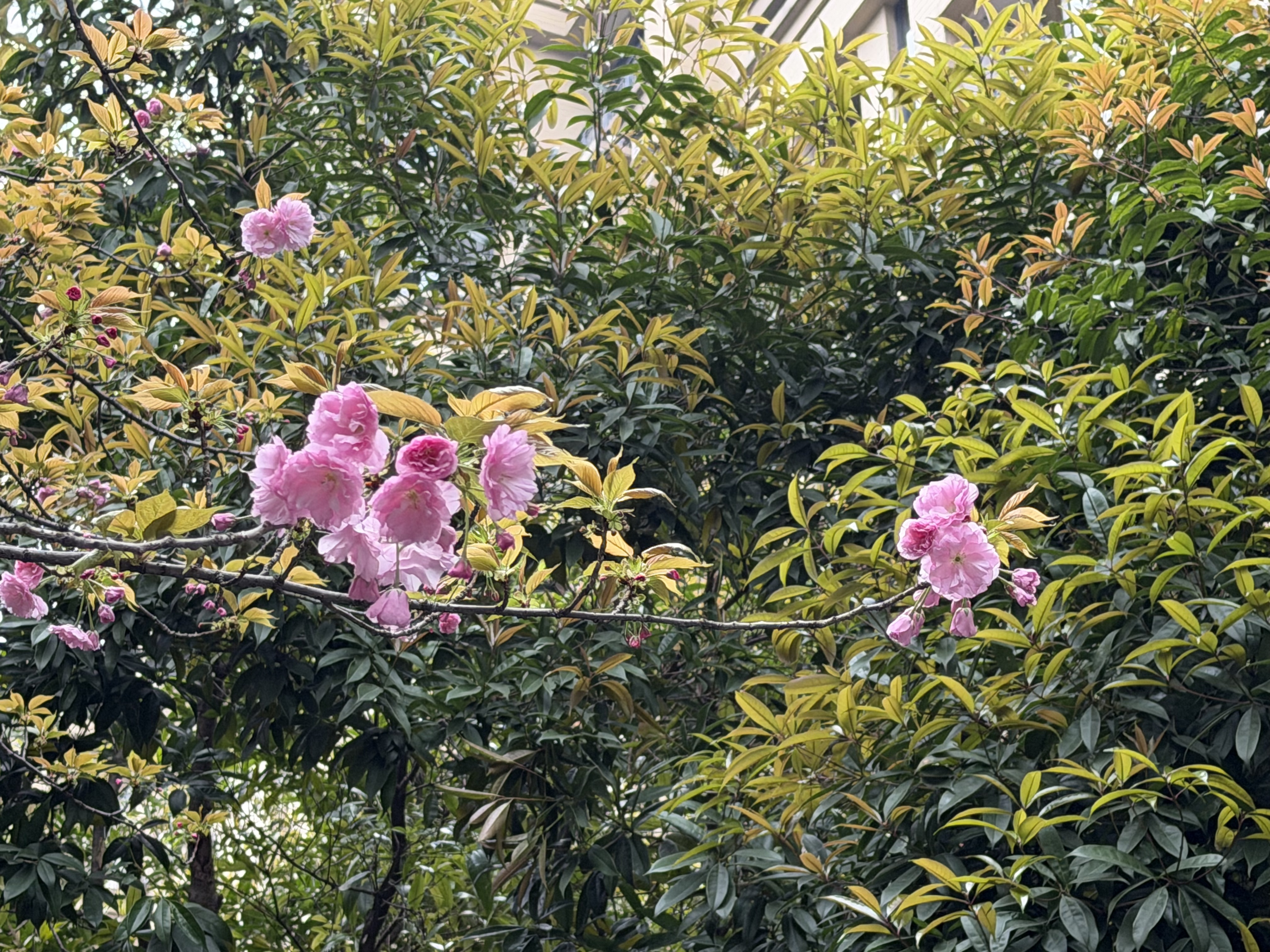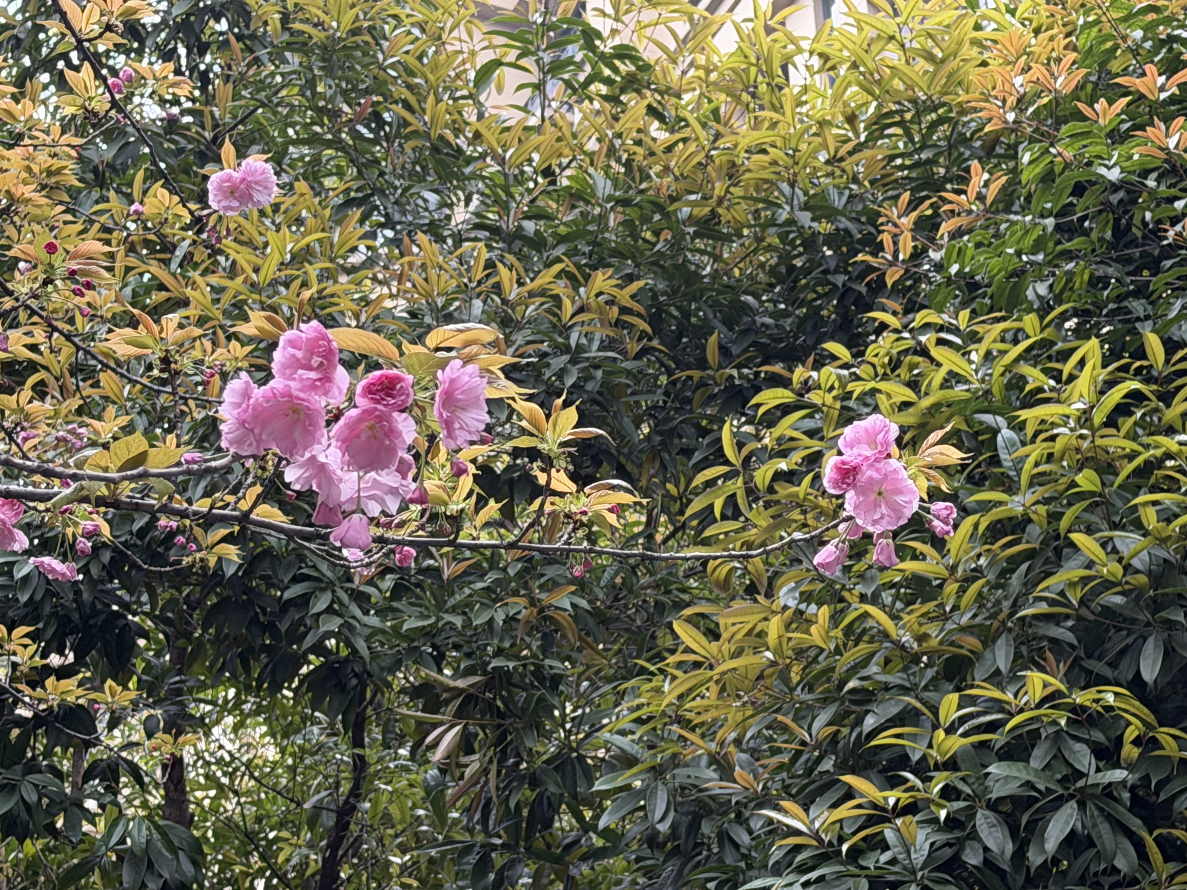 春江花月·晚樱花开花·晚樱是春日的尾声,是不肯散场的华美谢幕。 当早樱如雪,纷纷扬扬地铺满小径,带着一种近乎天真的、不顾一切的烂漫,晚樱才不疾不徐地,在枝头酝酿她的心事。她开时,是带了叶的。嫩生生的,或是赭红的,衬着那重重叠叠的花——粉的浓丽,白的清雅,或是一朵花里,从瓣尖到心底,由粉渐渐洇成了白。于是,那绚烂便不是孤注一掷的,而是笃定的,丰盈的,热闹中自有一份沉静的底气,仿佛知道春光将尽,偏要把这繁华,结结实实地、绵密地再绣上一遍。 春江看花的人,也换了心境。不再有初逢时的惊喜与躁动,只是沿着水岸,或倚着老桥,静静地看。看花影投在幽绿的潭水里,碎成一片流动的锦;看夕阳的金粉,怎样为每一片曲折的花瓣勾上毛茸茸的光边。风来时,那沉沉的花枝只是微微颔首,洒下几片花瓣,也是慢的,沉的,不像早樱的别离那般决绝飘忽,倒像一声满足的、轻轻的叹息。 这时的空气,是暖的,润的,饱含着植物生长的、近乎甜蜜的气息。你忽然觉得,早樱是一场青春的梦,清澈而易醒;晚樱,则更像一段中年情意,知晓了时光的限度,于是将所有的色彩与馥郁,都从容不迫地,绽放在这恰到好处的末尾。 开到酴醾花事了。可晚樱不说“了”字,她只说:你看,春光在此,尚有余温