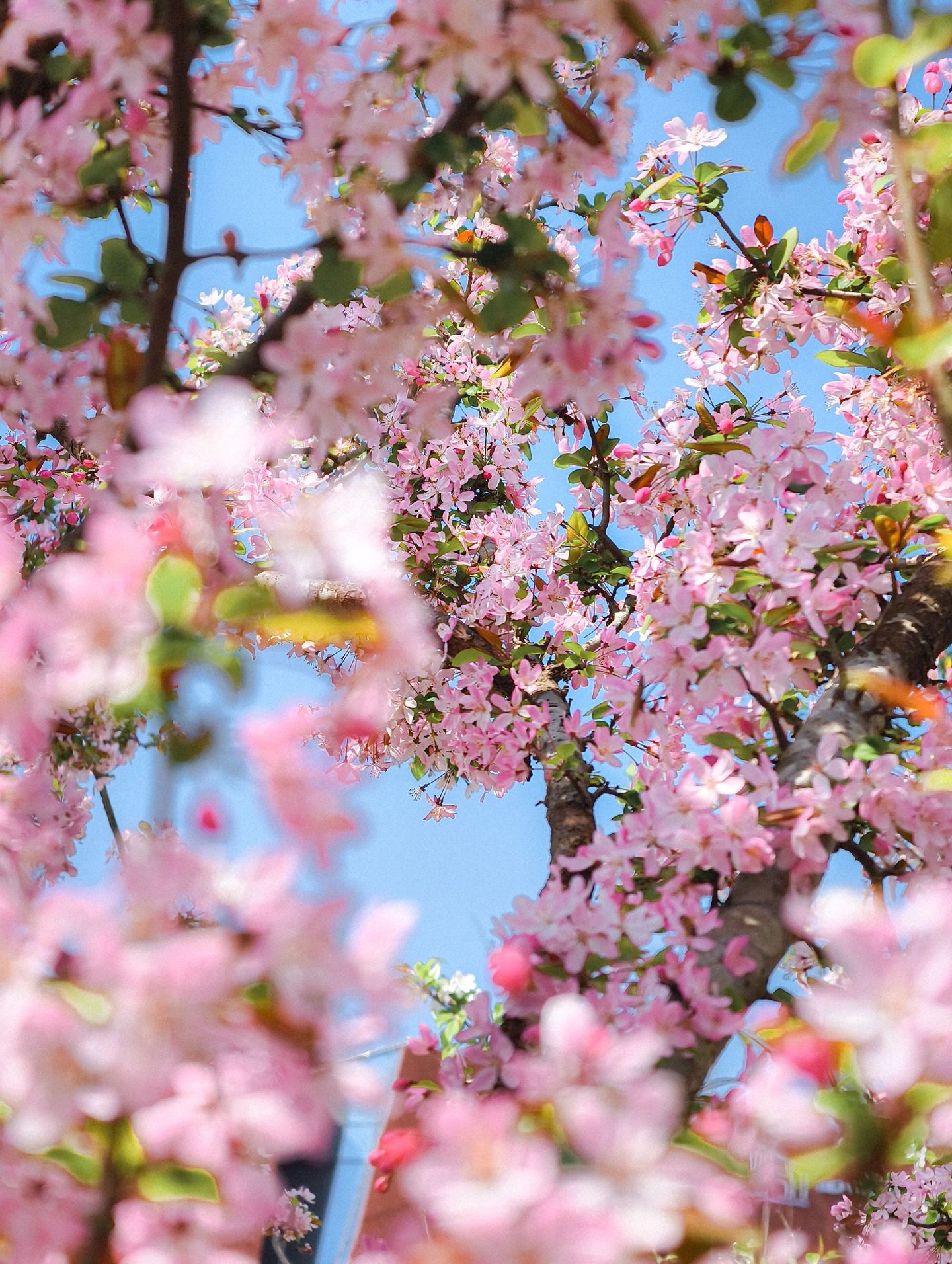 海棠如云,粉染天际,枝头繁花似锦,绿叶悄然点睛。仰首间,蓝天为幕,风过处,落英簌簌拂面。这春日的诗行,不必着墨,光影自成章。