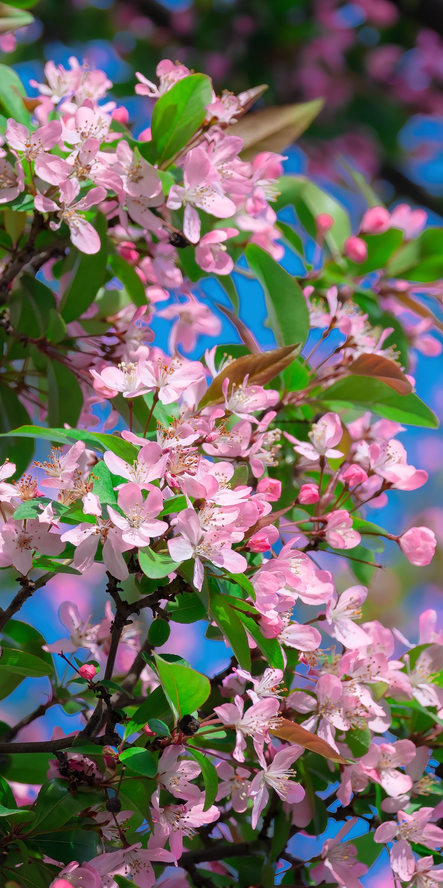 枝头海棠初盛,绿叶托着春的私语。蓝天作幕,花簇如云,风过处,瓣影轻摇,仿佛时光也放慢了脚步。镜头里,是自然最温柔的笔触——不争不抢,却把整个春天,开成了诗。