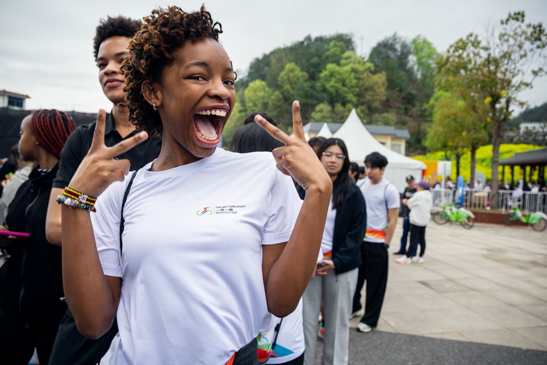 义乌市摄影家协会副主席杨志斌拍的这张照片感染力太强啦!我们来细细品味一下其独特魅力: 极具张力的表情:她张开嘴巴大笑,露出整齐的牙齿,眼睛里满是光芒,这种毫不掩饰的、发自内第一眼的情绪冲击 心的快乐极具感染力,画面的视觉焦点,无疑是这位开怀大笑的年轻女孩。 瞬间就能把看照片的人带入现场的热烈氛围里。 充满活力的肢体语言:双手比出标志性的V字手势,动作舒展又元气满满,把年轻人特有的朝气和热情展现得淋漓尽致。 场景与细节的故事感 背景信息:她身上的白色T恤印着“THE BELT AND ROAD”(一带一路)的字样,点明了这是一场与国际交流相关的活动,让这张照片不只是记录快乐,更多了一层多元文化交融的温度。 环境氛围:背景里熙攘的人群、户外的帐篷、远处的绿意和模糊的油菜花田,都在告诉我们这是一场热闹的户外集会。阴天柔和的光线,没有强烈的阴影,让人物的肤色和表情细节都得到了很好的呈现。 多元的瞬间:她身后不同肤色的年轻人,也呼应了活动的国际属性,让画面充满了包容与活力的气息。 构图的巧妙 摄影师用中近景构图,把人物放在画面中心,通过景深虚化背景,让观众的视线牢牢锁定在女孩的表情上,完美突出了情绪表达。这种“以小见大”的手法,用一个人的高光瞬间,就传递出了整个活动的热烈与多元。 这张照片最动人的地方,就在于它捕捉到了最真实、最鲜活的快乐,也定格了不同文化背景下,年轻人共通的热情与活力。