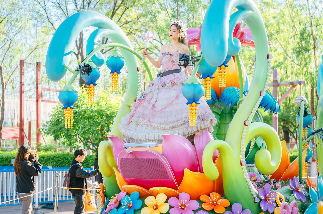 大同方特园区春日童话在花车巡游中绽放,粉色裙摆与绚烂花海共舞,快门定格梦幻瞬间。
