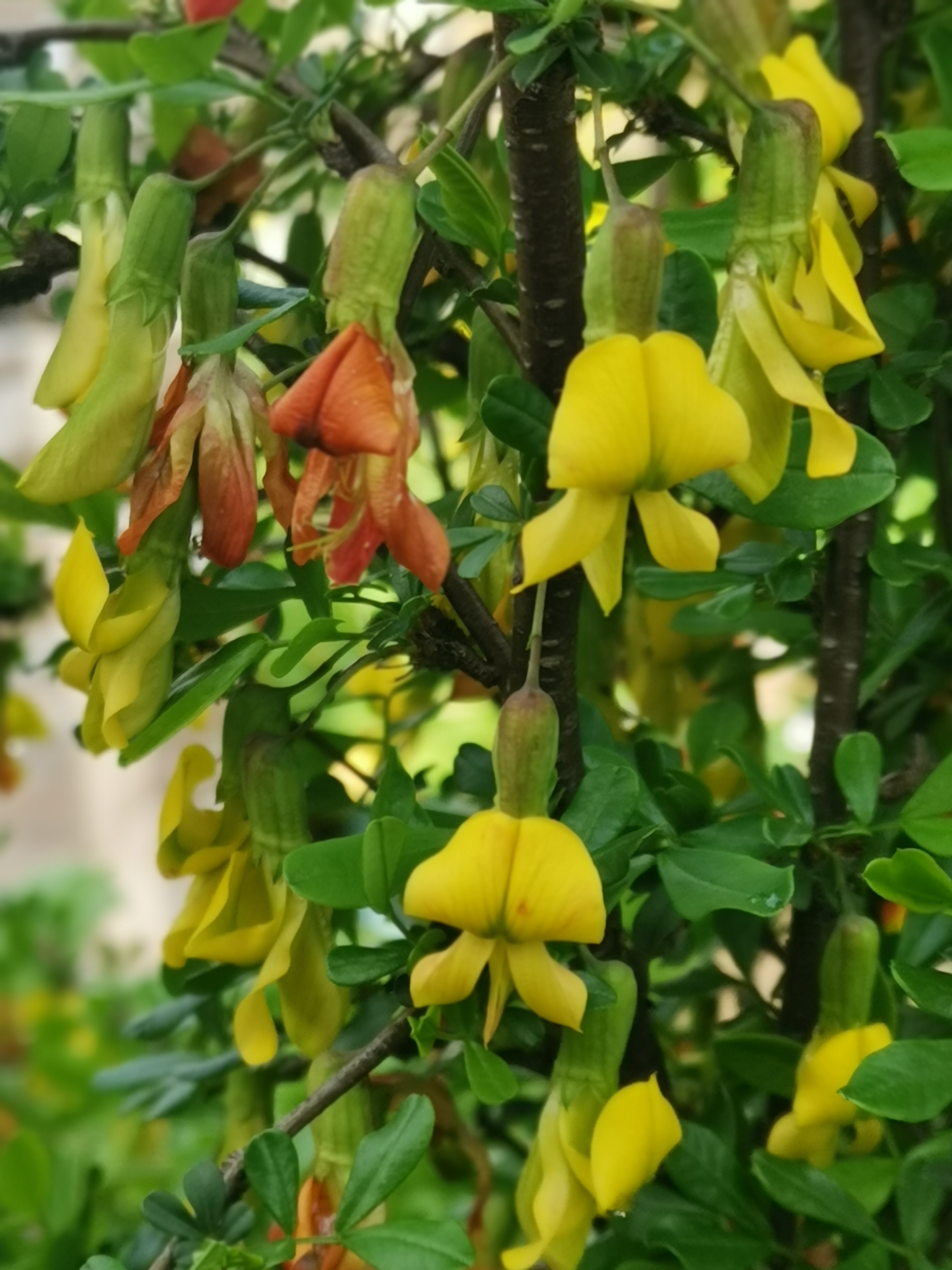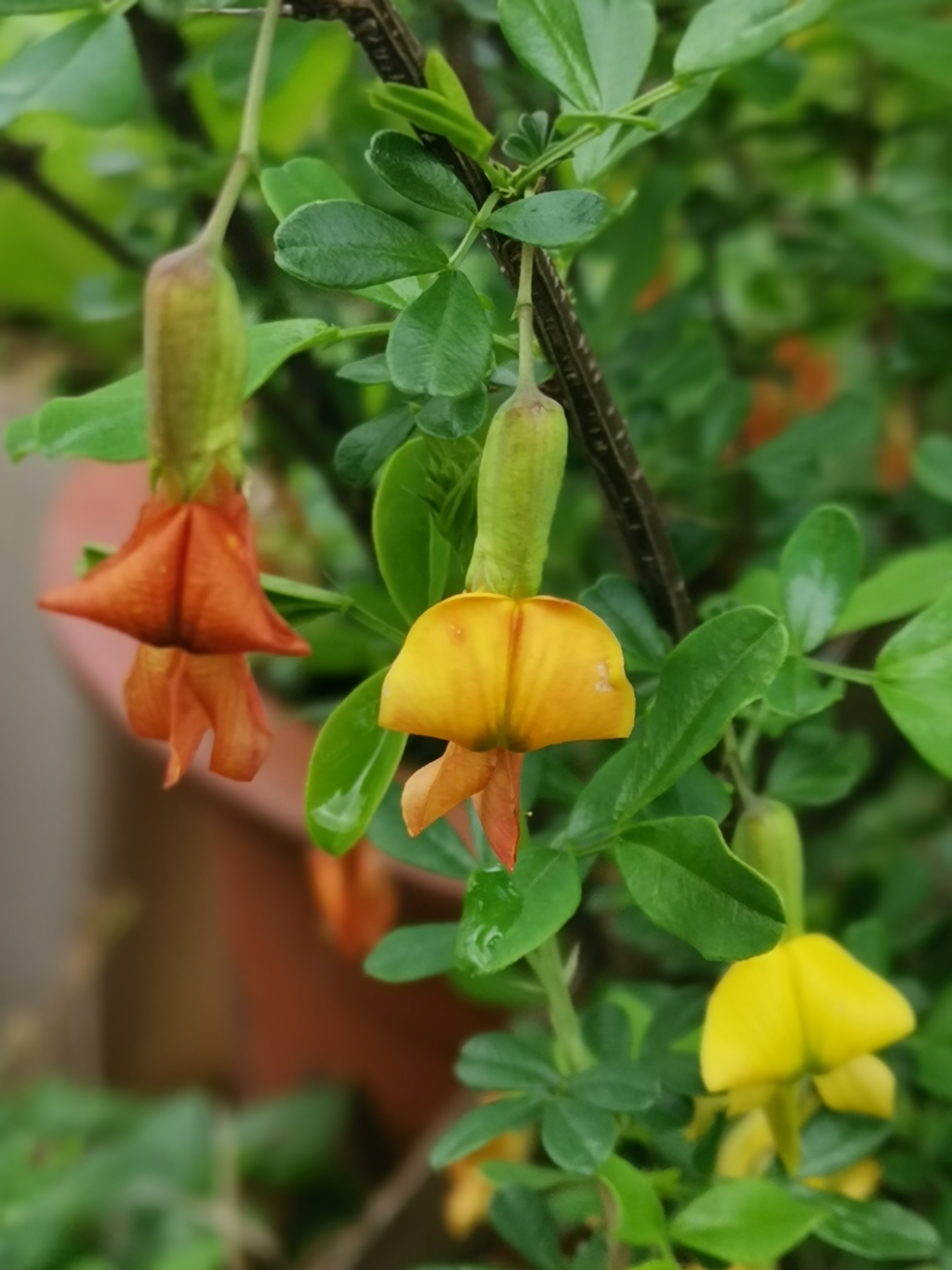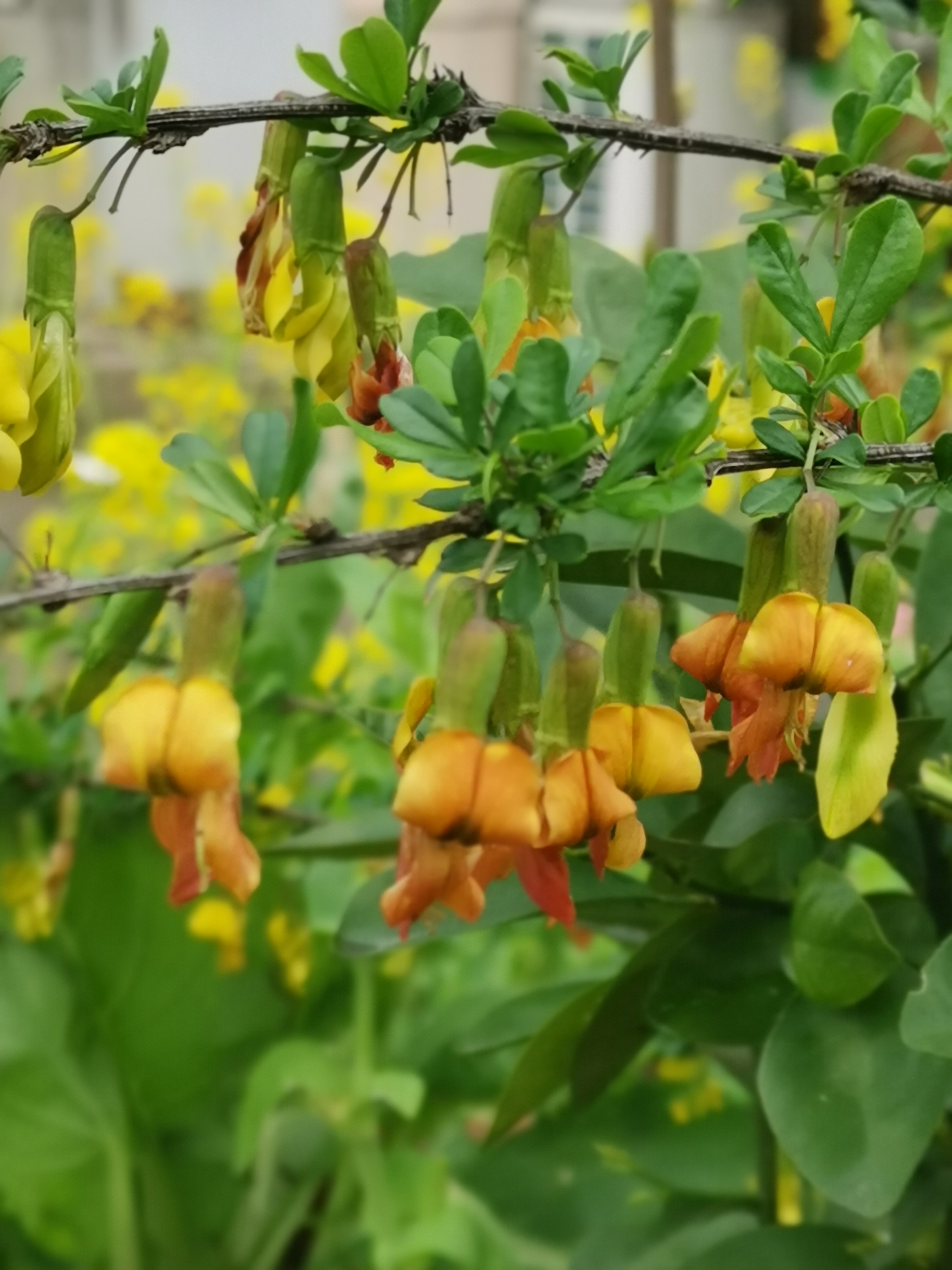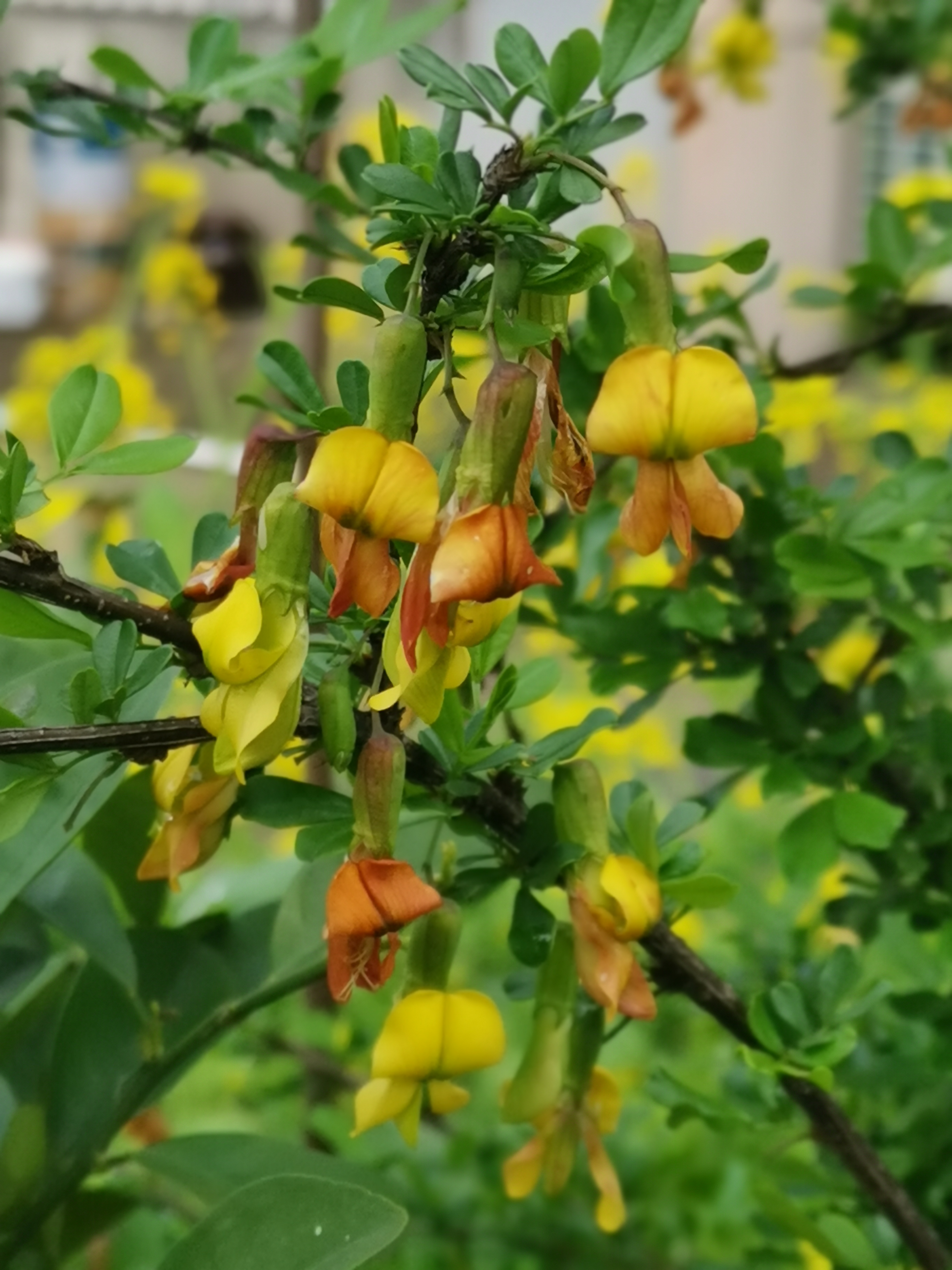 🇨🇳阳台上的红花锦鸡儿开的热热闹闹,红黄相间,绿意盎然,像一只只风铃!
