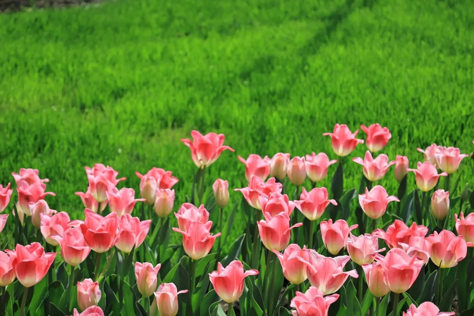 粉红郁金香在绿草坪上开得正欢~阳光刚好处,风一吹,整片花海都在晃。随手一拍就是春日限定壁纸!今天在植物园蹲点两小时,就为等这束光穿过花瓣的瞬间~谁说春天不营业?它可忙得很呢🌸