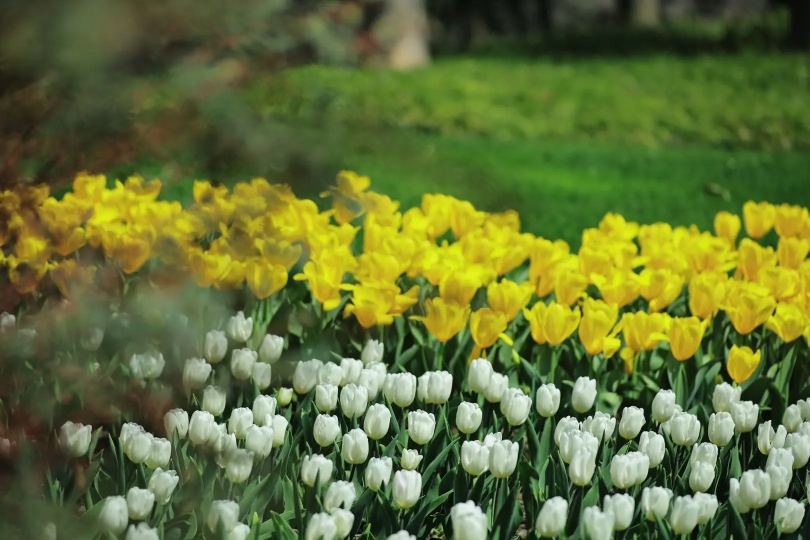 春日花园,黄白郁金香相映成趣。阳光倾泻于盛放花丛,明黄热烈,素白清雅,在翠绿草坪的映衬下,构图饱满而富有层次。花卉园艺精妙布局,花坛设计疏密有致,自然光影与植物景观浑然天成。此般春季花园,既是园艺典范,亦为摄影佳境——静待快门,定格生命蓬勃之瞬。