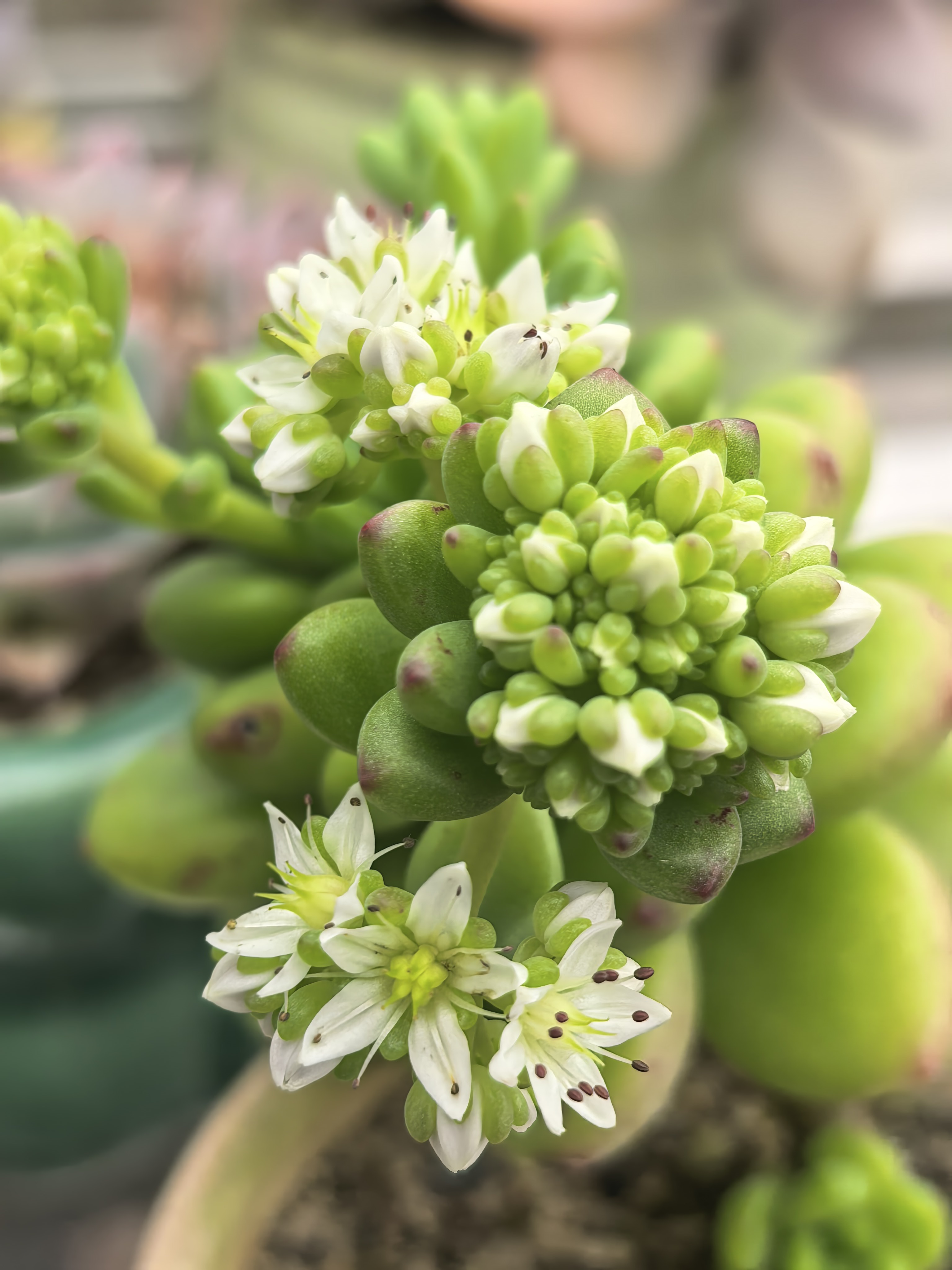 阳光刚好,多肉悄悄开白花啦~绿叶托着小花序,景天科的温柔暴击!🌿✨