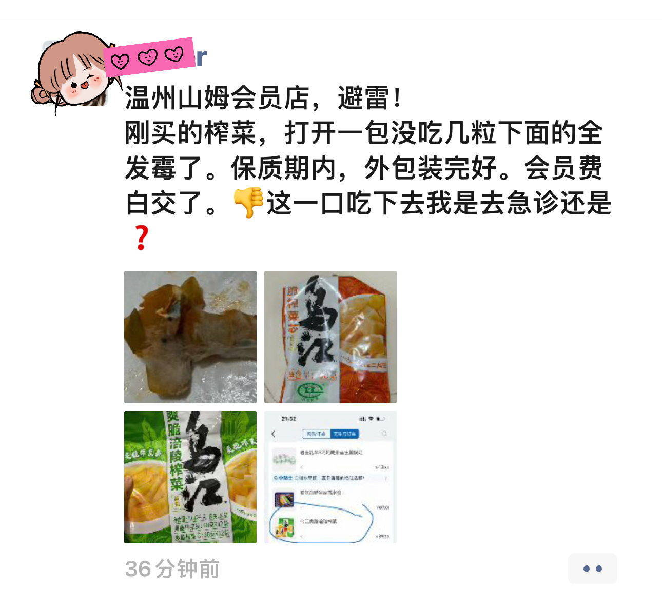 【会员费白交了?温州山姆被指保质期内榨菜发霉,网友:吃下去要进急诊?】 “这一口吃下去我是去急诊还是?”龙港网友Clever的一条吐槽,把山姆会员店推上了风口浪尖。 据Clever反映,自己在温州山姆会员店购买了一袋榨菜,回家打开一包,没吃几粒,竟发现底下的榨菜全部发霉。更令人气愤的是,产品尚在保质期内,外包装也完好无损。作为付费会员,Clever直言“会员费白交了”,并在社交平台上晒出照片,霉变部分触目惊心。 作为一家实行会员制的高端仓储式超市,山姆一直以“严选品质”作为核心卖点,吸引消费者缴纳每年数百元的会员费。然而,这并非山姆首次因食品质量问题引发争议。此前,多地山姆门店曾多次被曝出食品异物、变质等问题,让消费者对其品控流程产生质疑。 对于Clever的遭遇,不少网友表示“太恶心了”。“榨菜这种高盐食品都能发霉,要么是生产环节有问题,要么是储存运输出了问题。”也有网友调侃:“山姆的会员费是交来买‘霉菜’的吗?” 截至发稿,温州山姆方面尚未对此事作出公开回应。究竟是哪一环节出了问题,消费者能否得到合理赔偿,仍需等待官方答复。 食品安全无小事,会员费买的应是安心,而非“开盲盒”般的惊吓。(陈记)