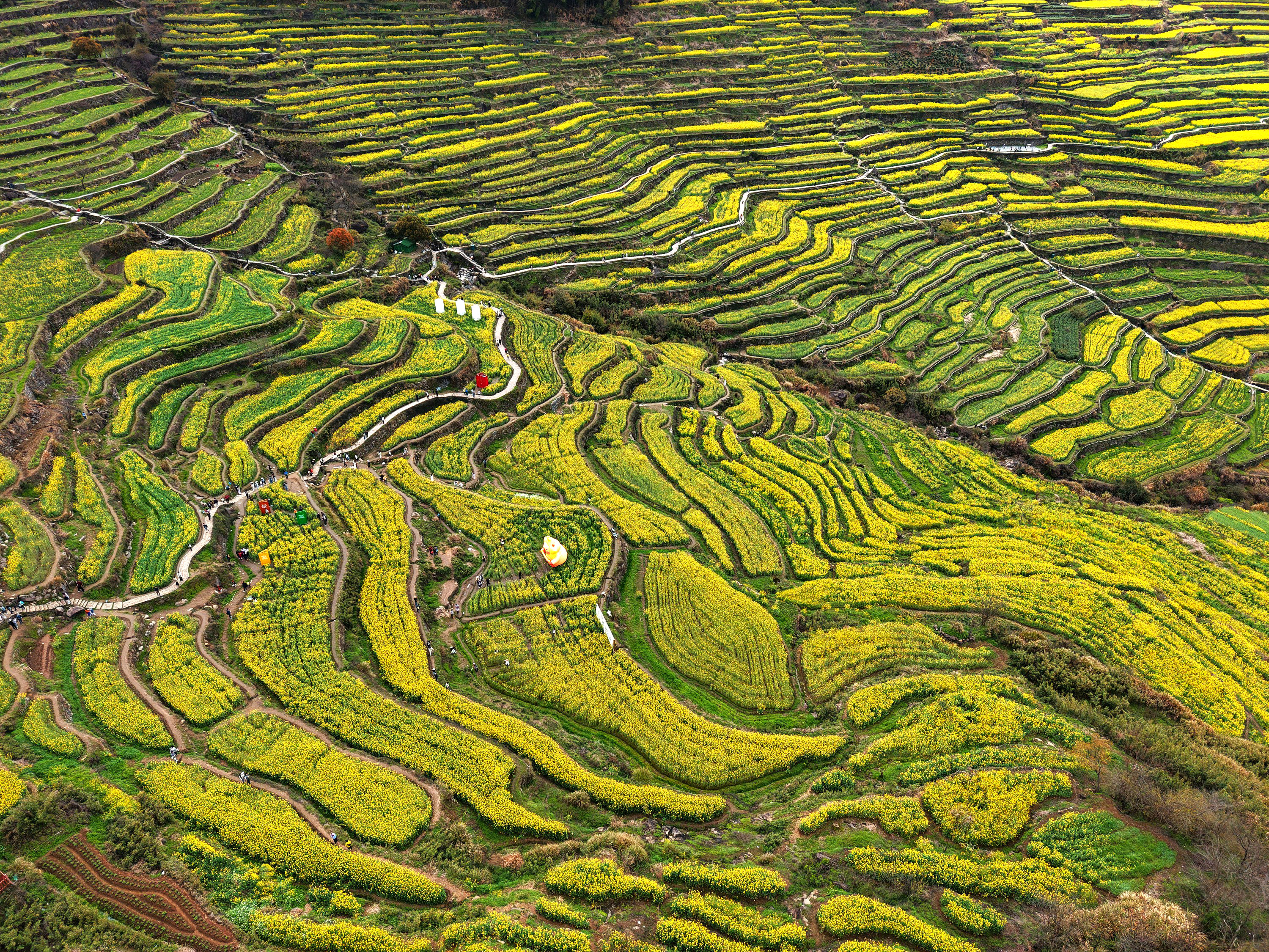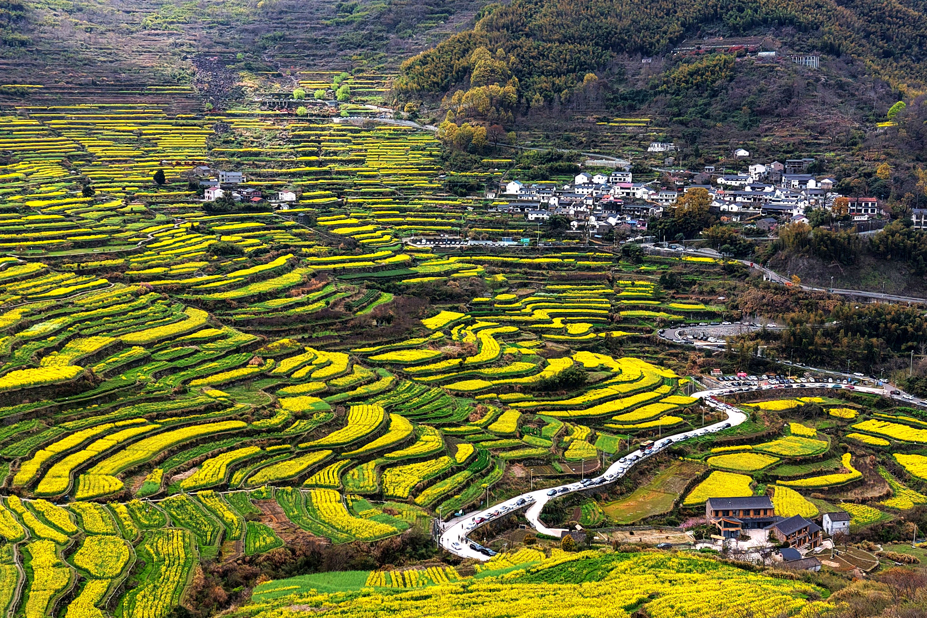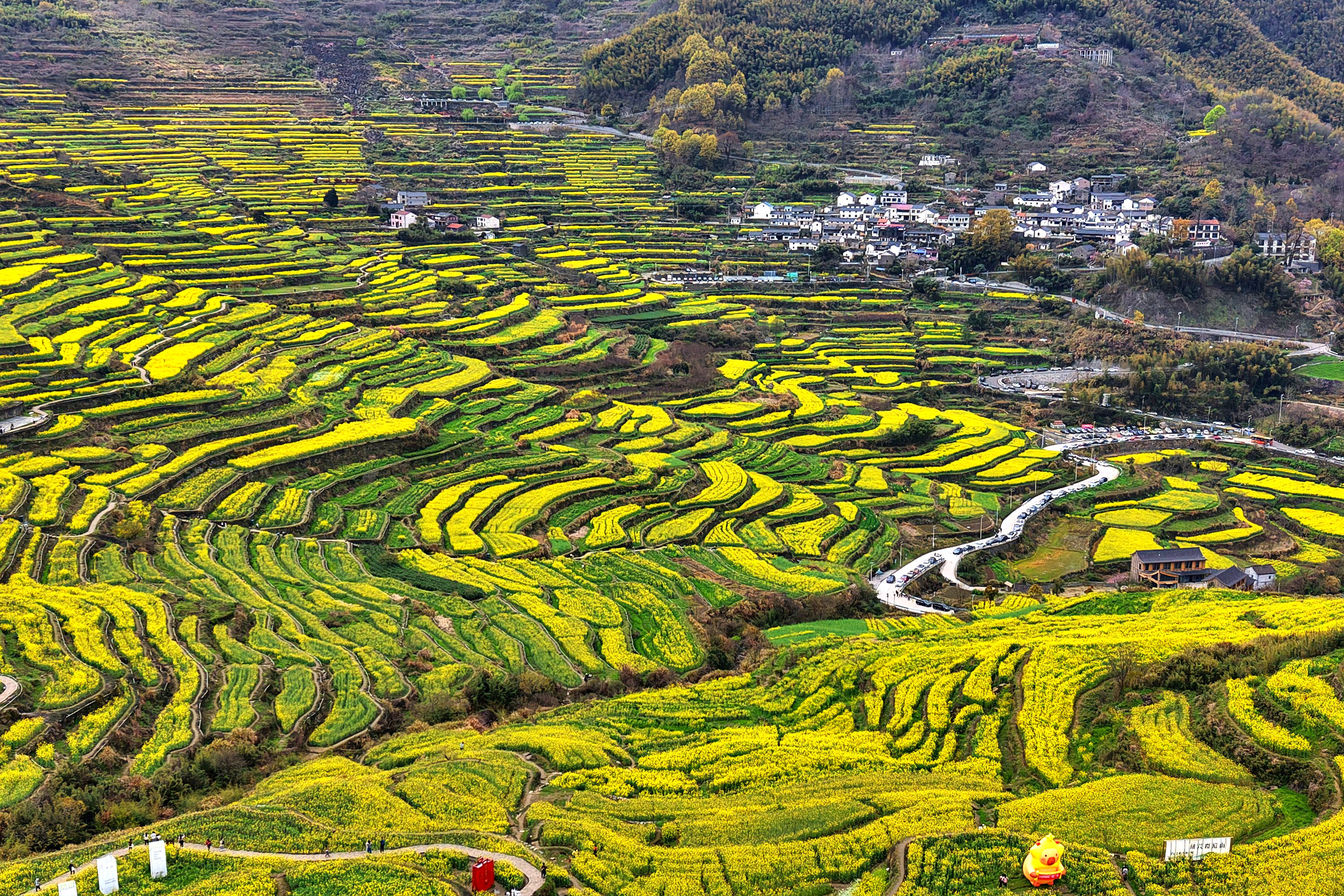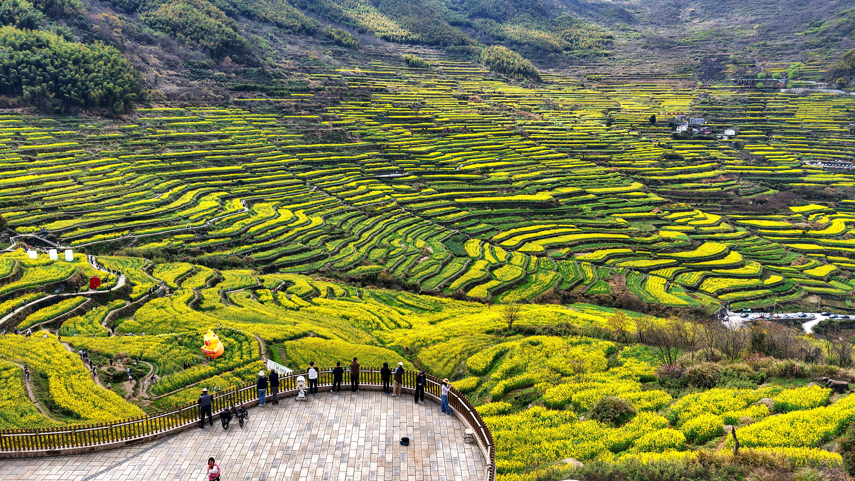 《震撼了!覆卮山梯田花海》3月28日,登上“华东最美十大金花胜地之一”的绍兴上虞覆卮山千年梯田油菜花海,站在海拨500余米的观景台上,眼前是漫山遍野的油菜花层层叠叠,从山顶铺向山谷,除了震撼还是震撼!