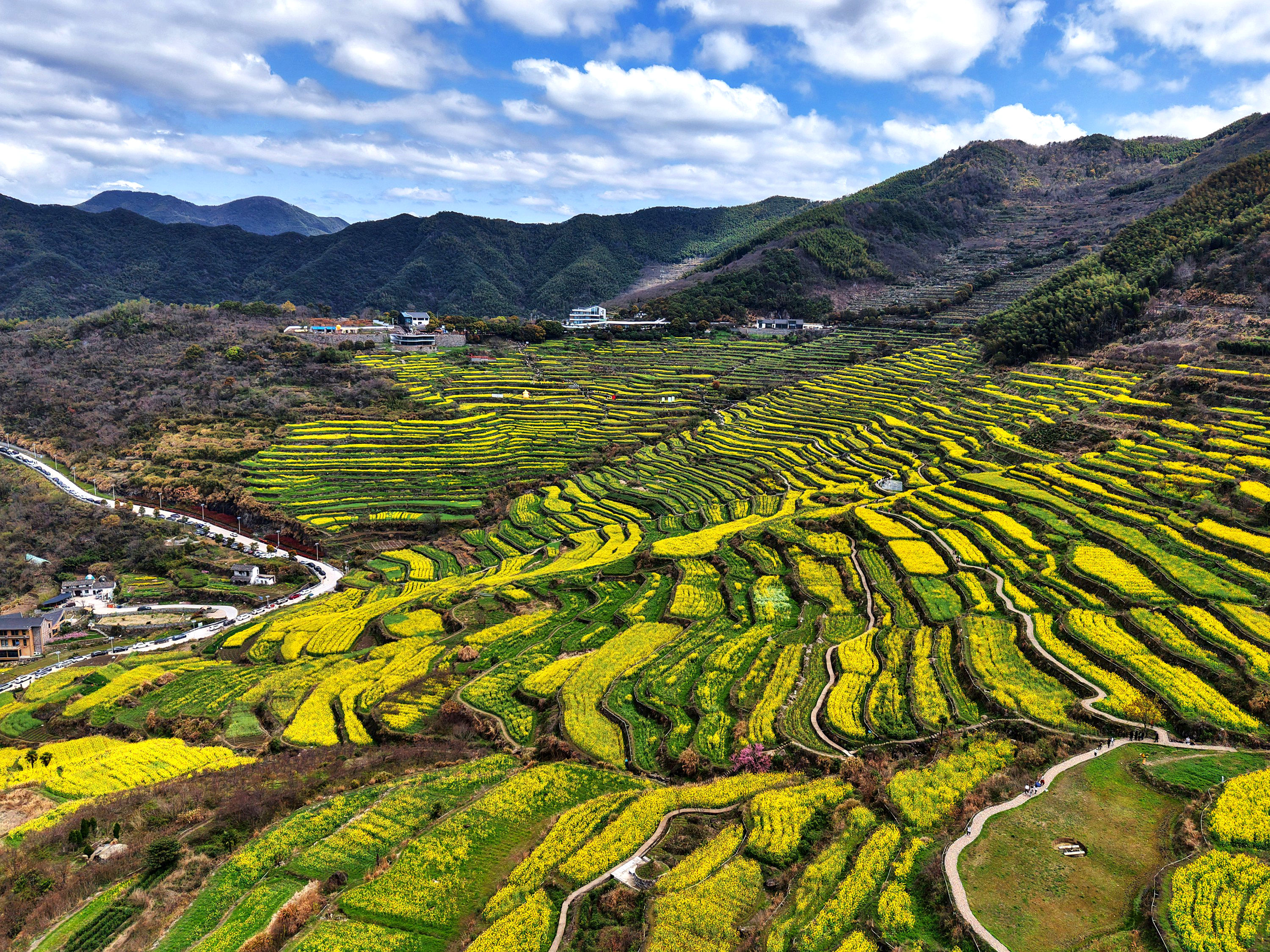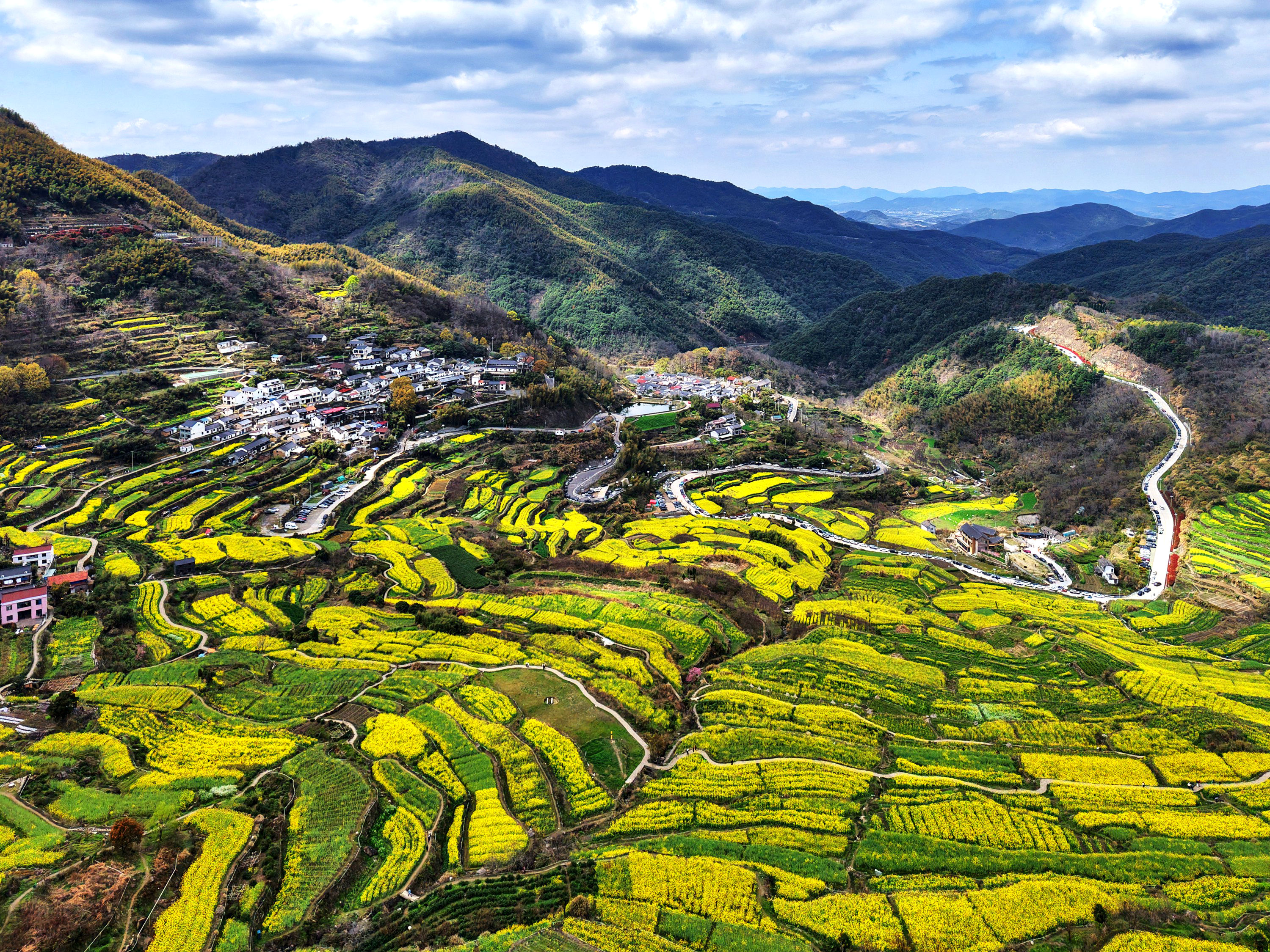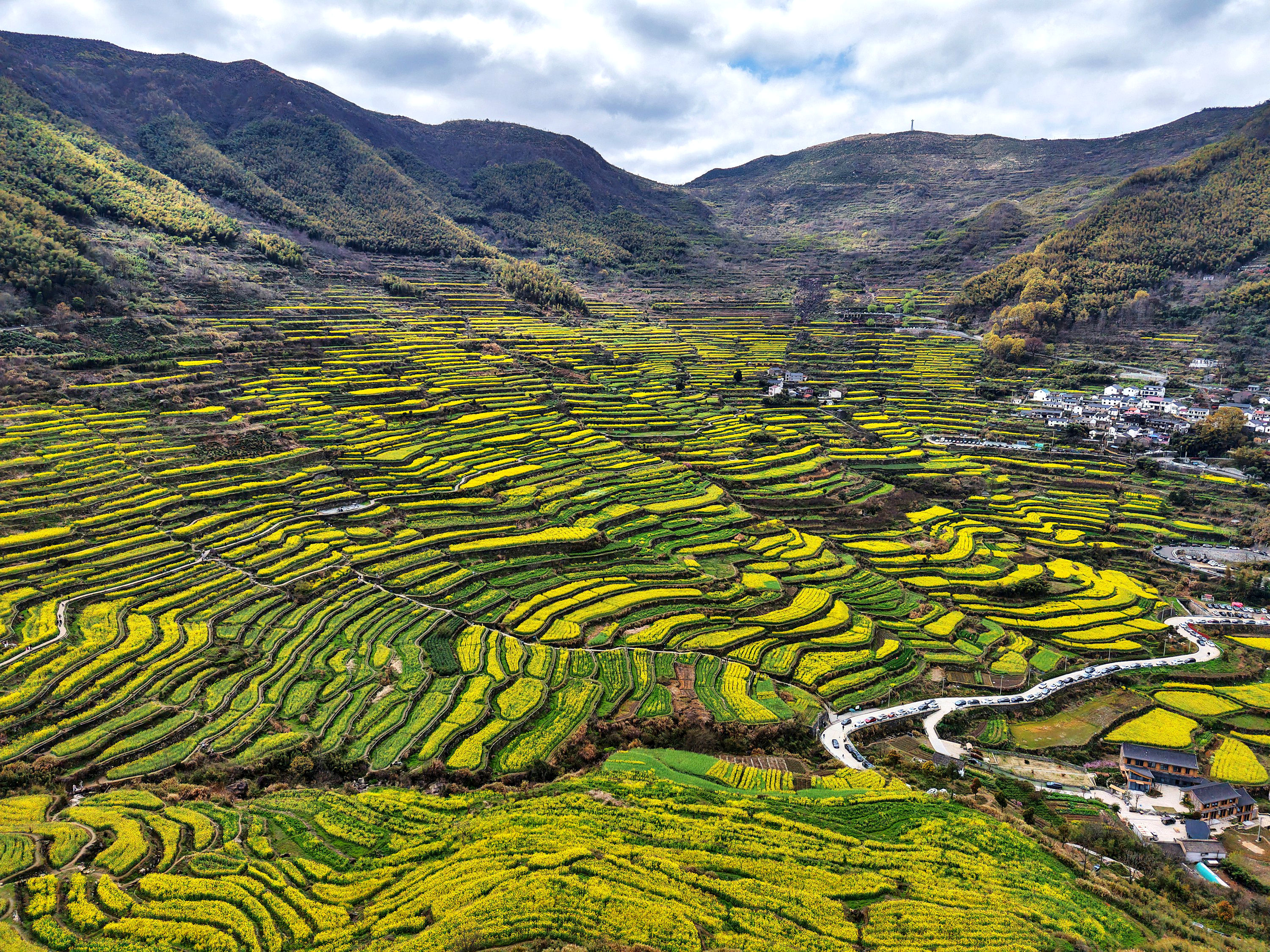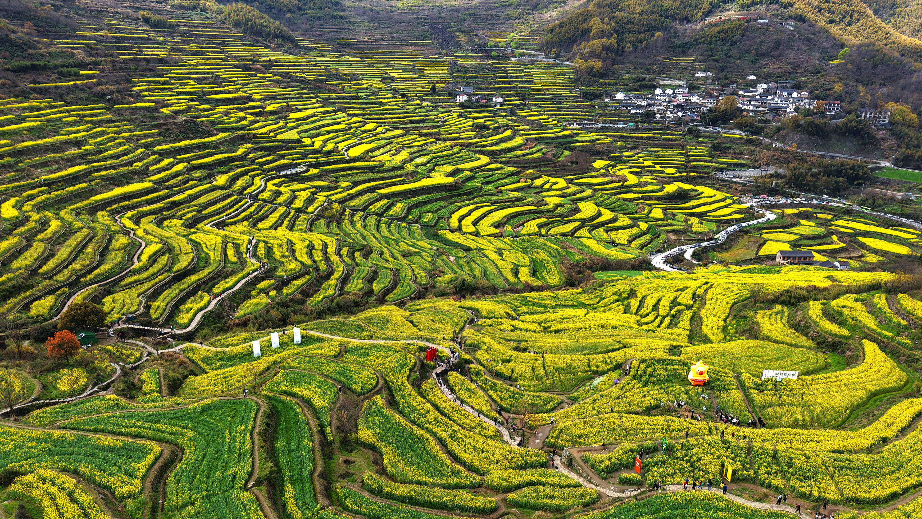 《震撼了!覆卮山梯田花海》3月28日,登上“华东最美十大金花胜地之一”的绍兴上虞覆卮山千年梯田油菜花海,站在海拨500余米的观景台上,眼前是漫山遍野的油菜花层层叠叠,从山顶铺向山谷,除了震撼还是震撼!