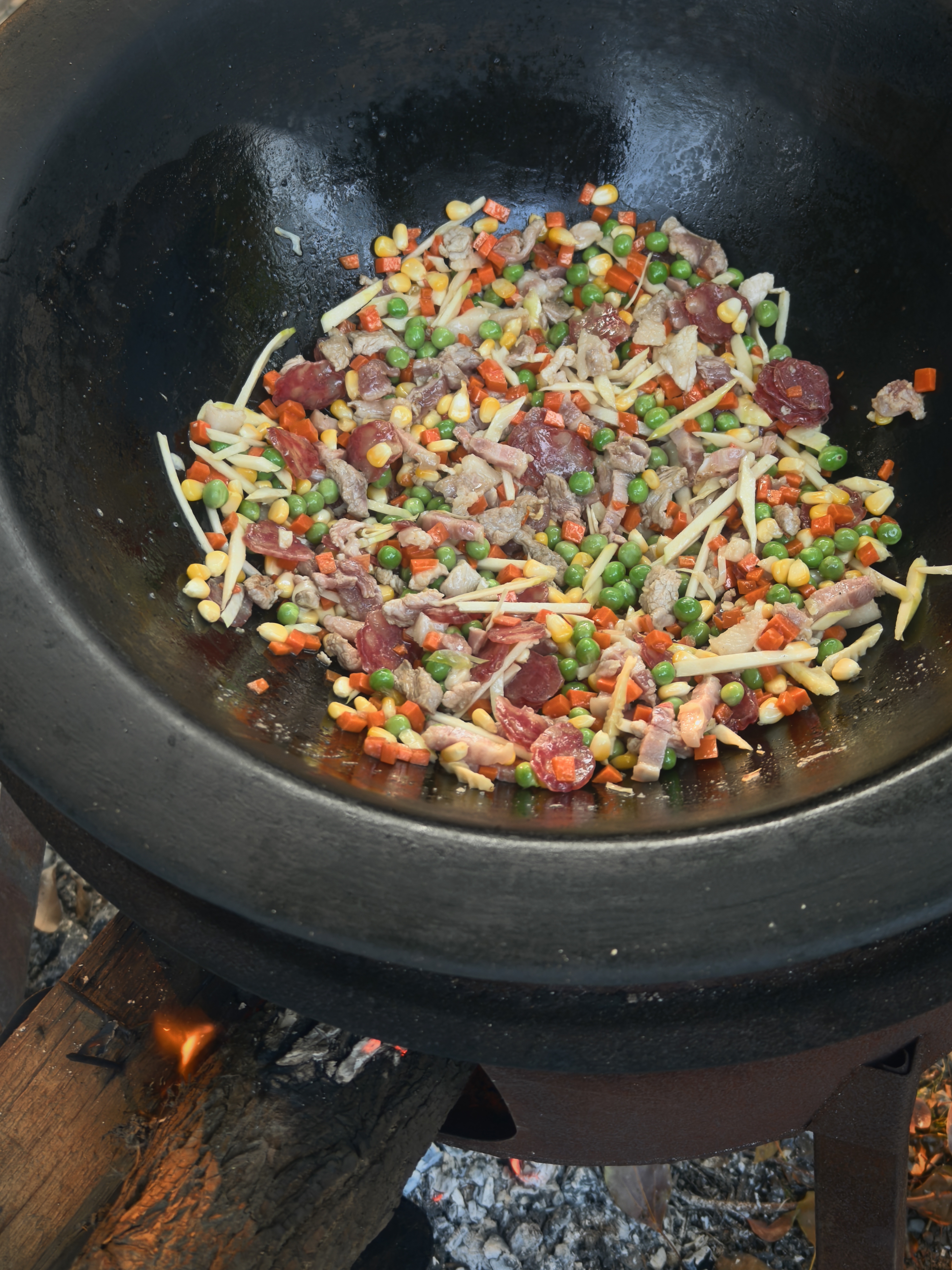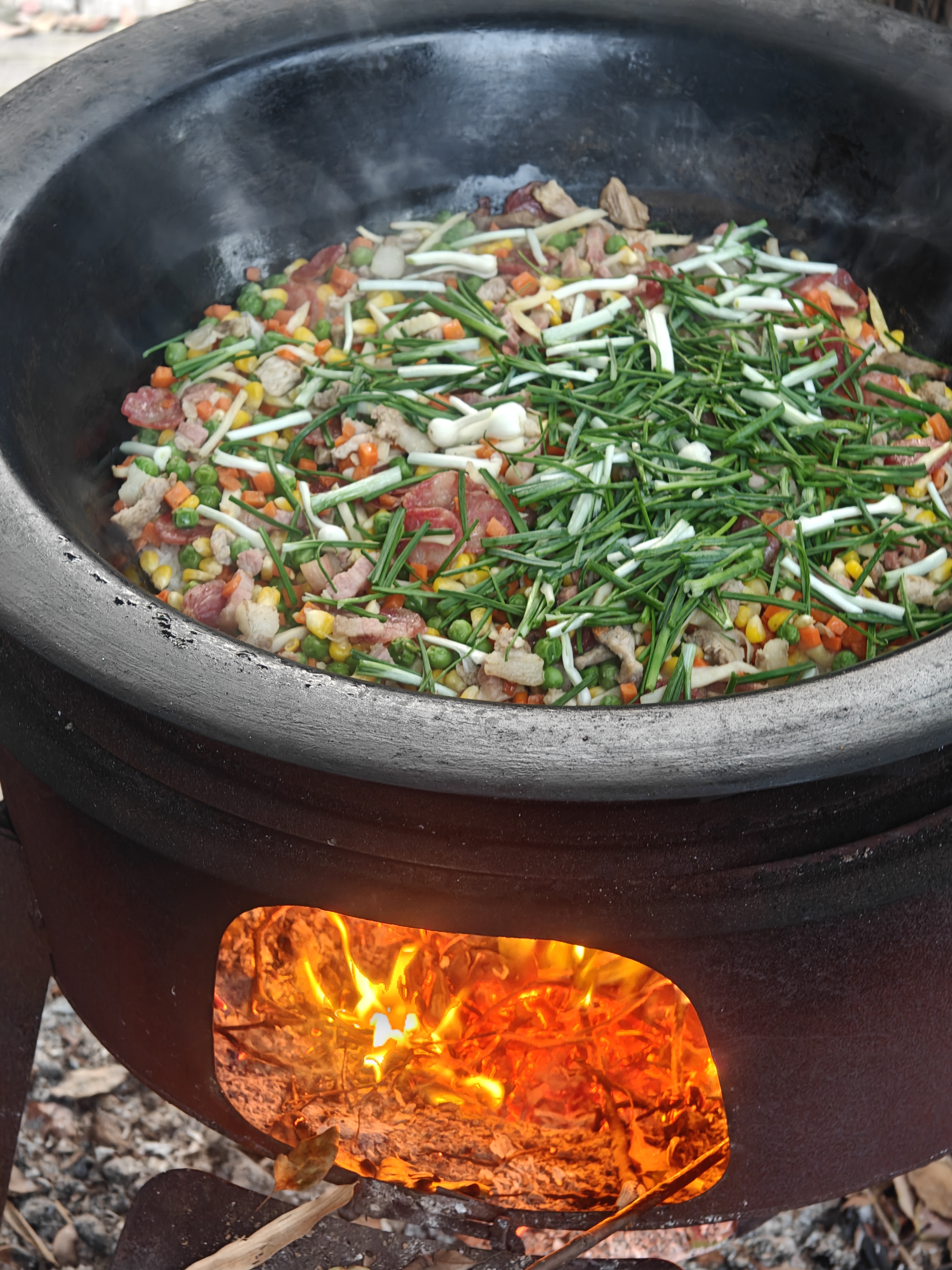 灶火正旺,腊肉香混着玉米青豆的甜,铁锅一烧,烟火气全来了~