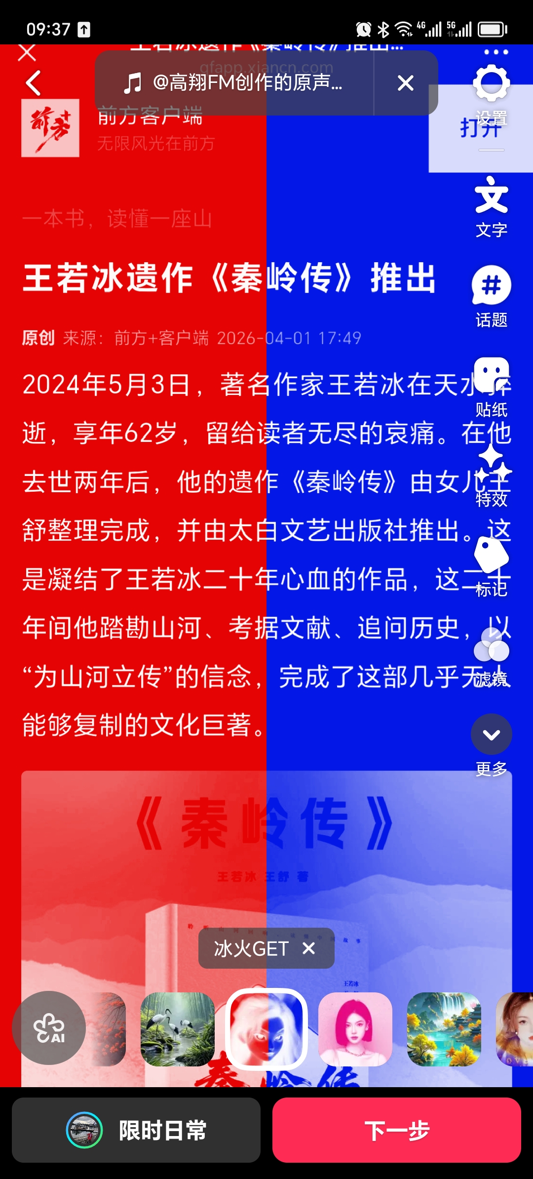 一本书,读懂一座山 王若冰遗作《秦岭传》推出 原创来源:前方+客户端2026-04-01 17:49 王若冰的遗作《秦岭传》由女儿王舒整理完成,并由太白文艺出版社推出。这是凝结了王若冰二十年心血的作品,这二十年间他踏勘山河、考据文献、追问历史,以“为山河立传”的信念,完成了这部几乎无人能够复制的文化巨著。#王若冰的碑文故事# #王若冰的碑文雄立各地#