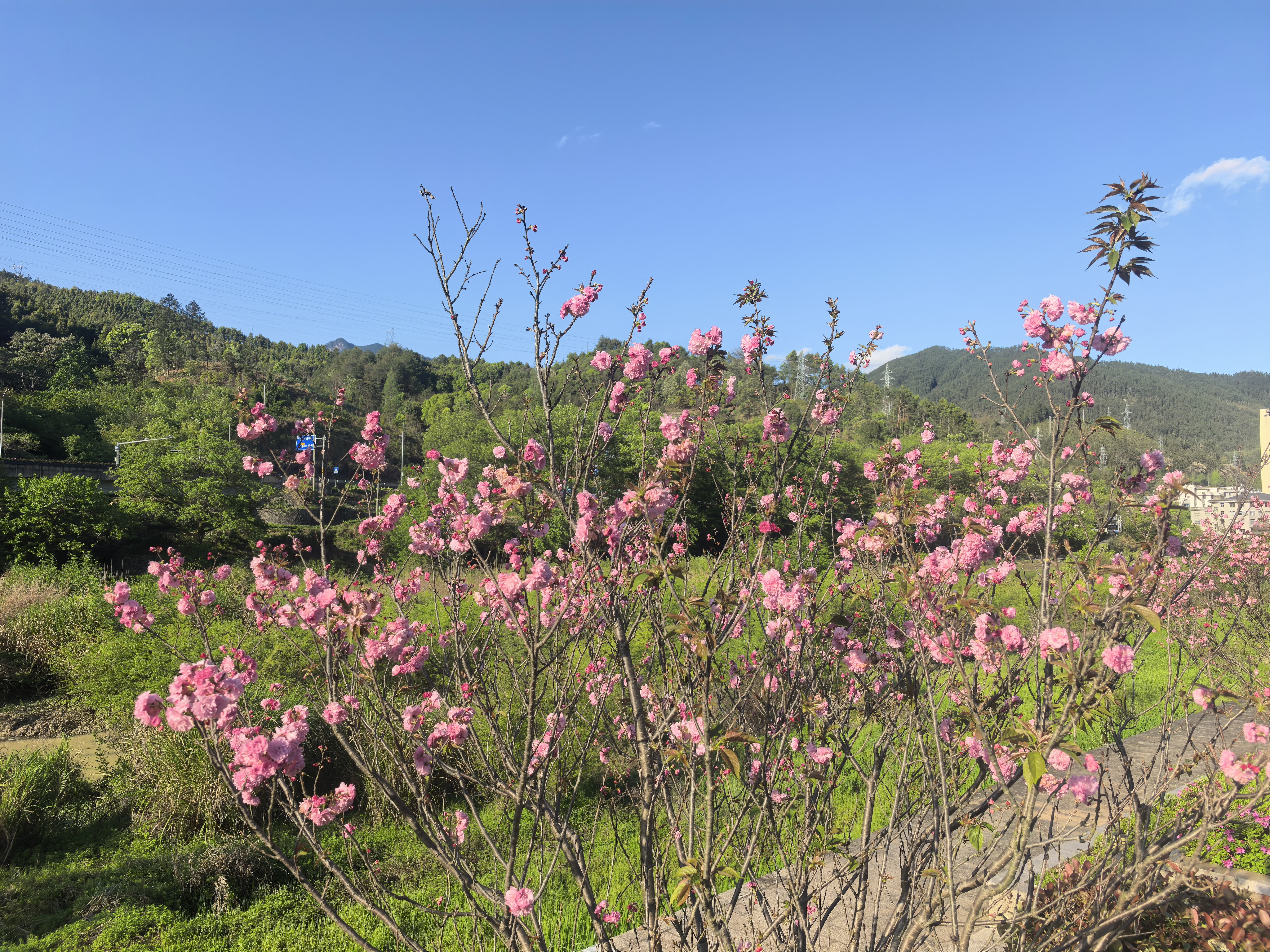 樱花粉粉的,山丘绿绿的,蓝天蓝蓝的~今天在江滨绿道乱拍,连电线杆都自带柔焦!