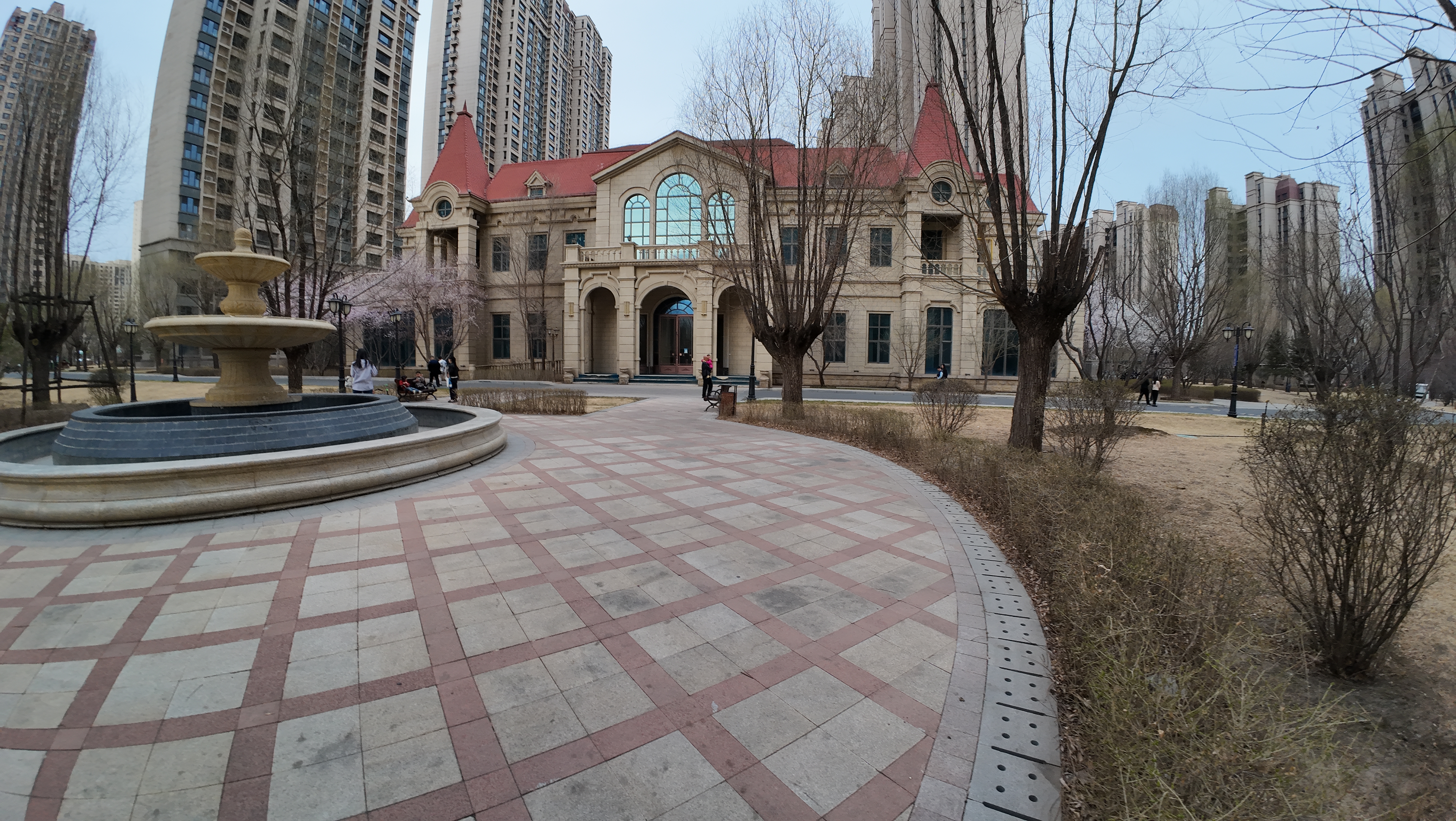 喷泉边的欧式红顶小楼,落叶铺满石砖广场,随手一拍就是冬日城市小确幸~