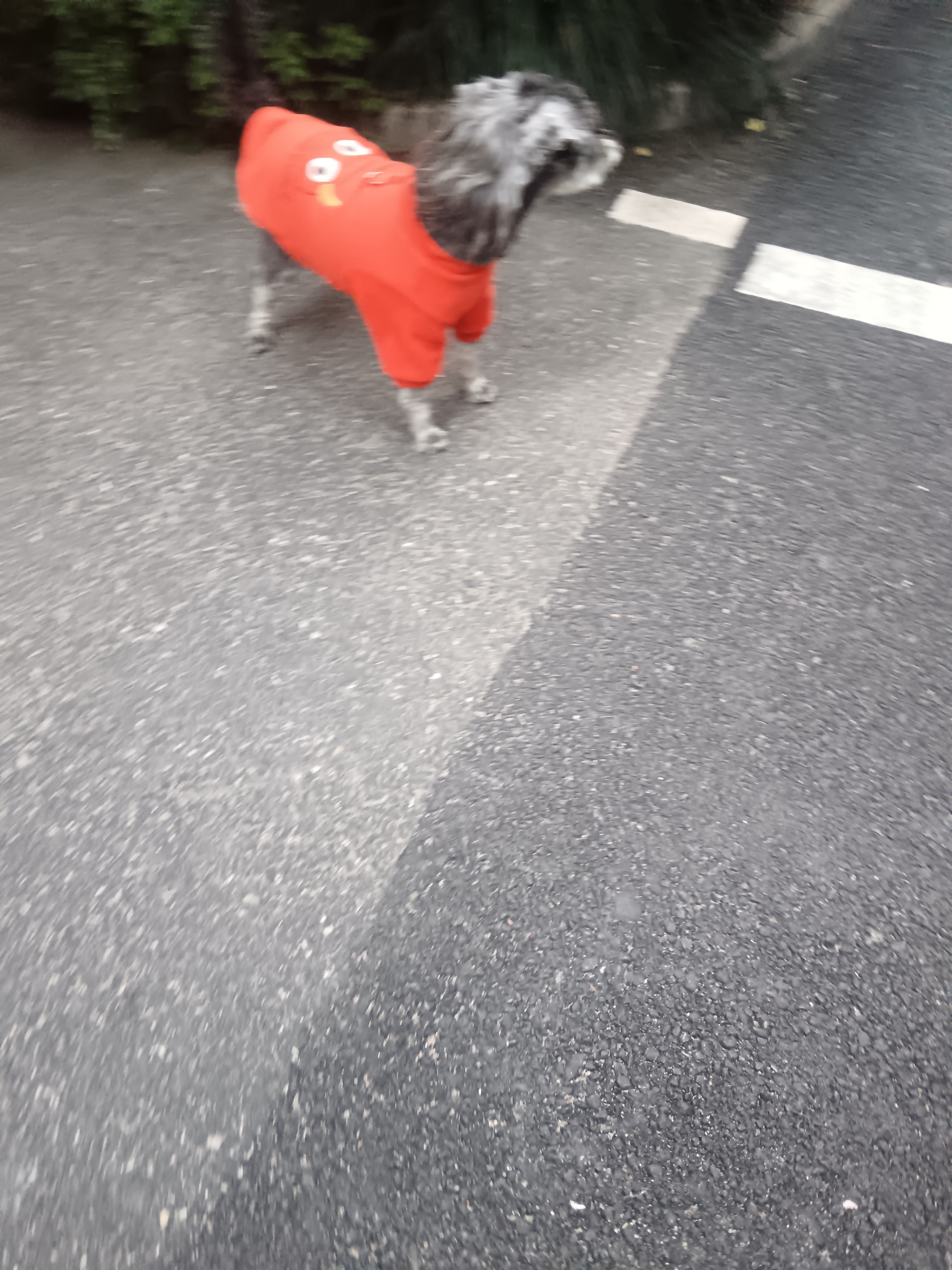 小狗穿红衣冲过斑马线,灰色毛发在风里飞,柏油路上拖出萌萌运动模糊~