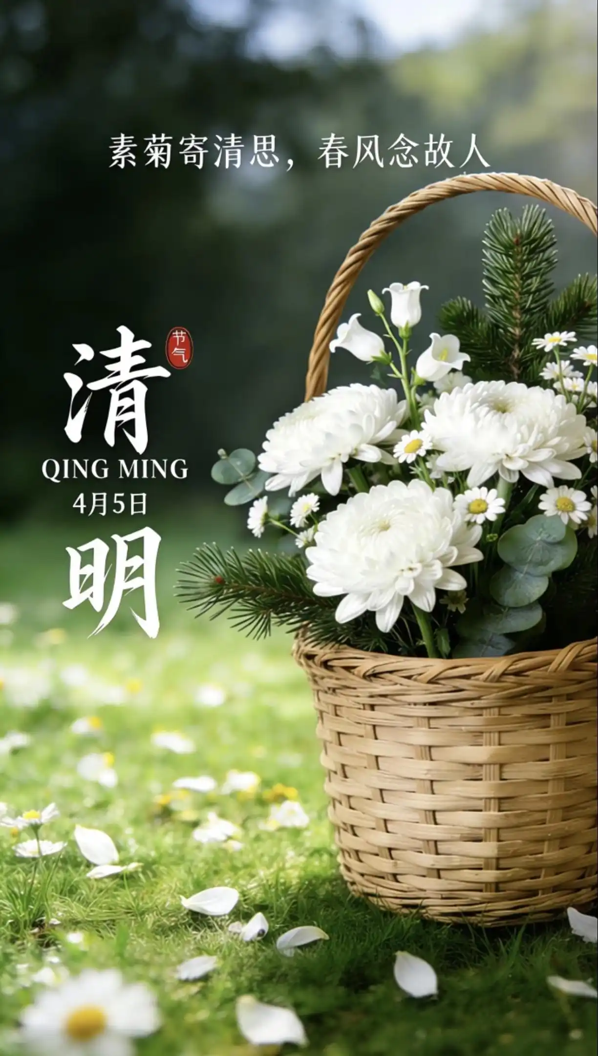 清明风起,素菊轻摇,竹篮松枝伴雏菊,绿草地上花瓣飞——思念随春风,自在又温柔。