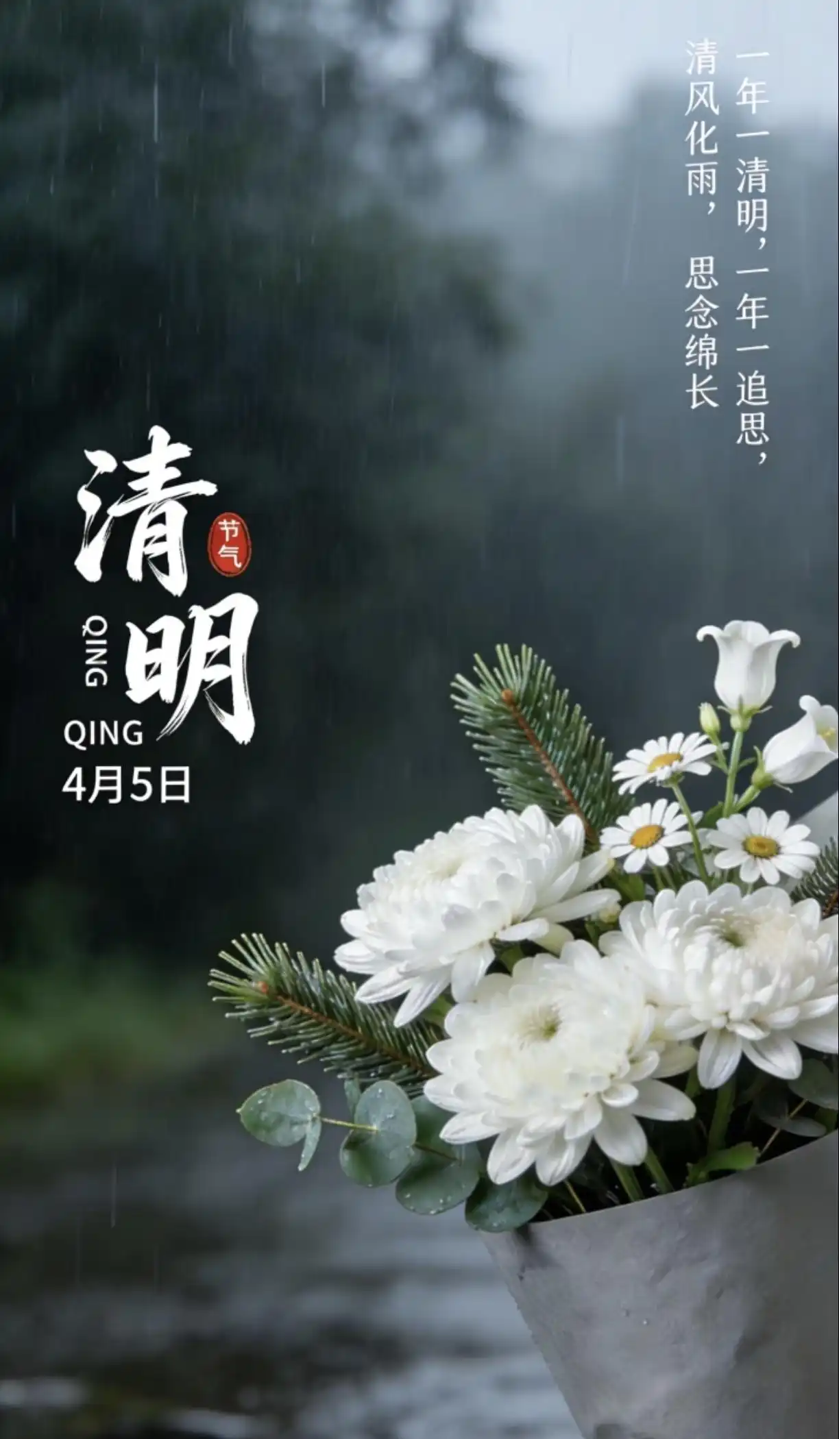 清明雨落,水边静立。雏菊配松枝,尤加利叶沾着水汽——一束清简的思念,刚刚好。