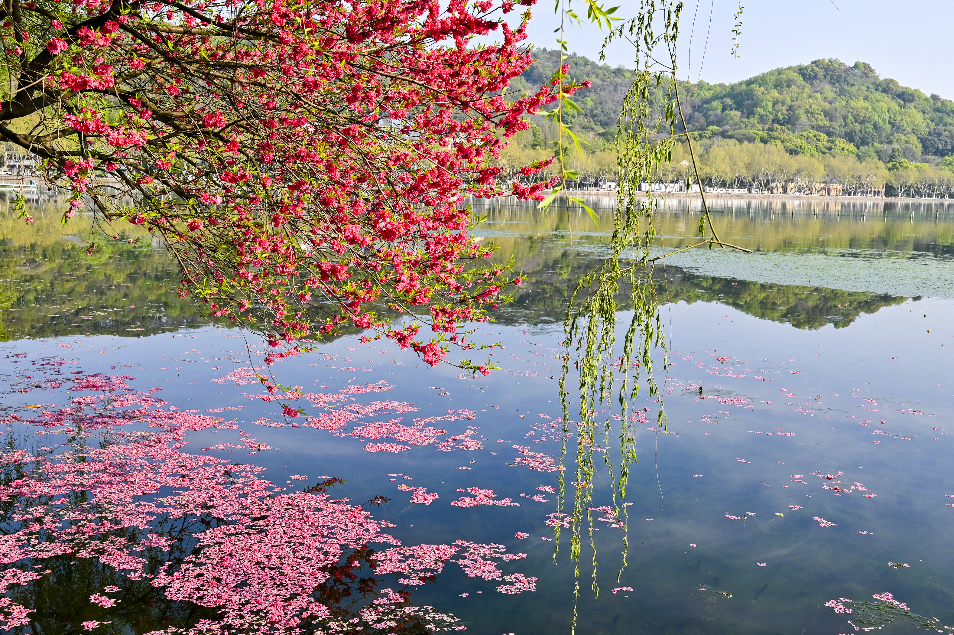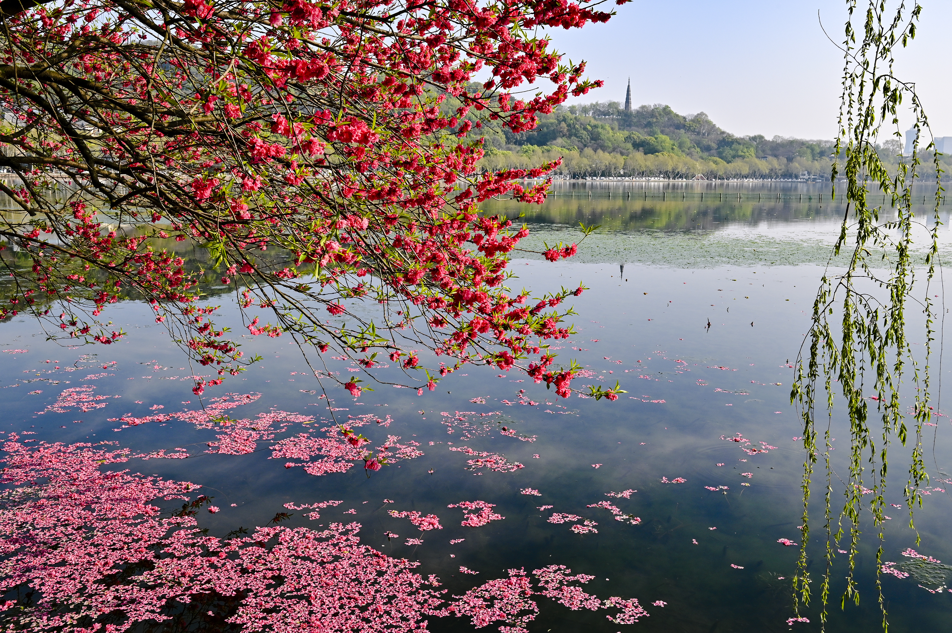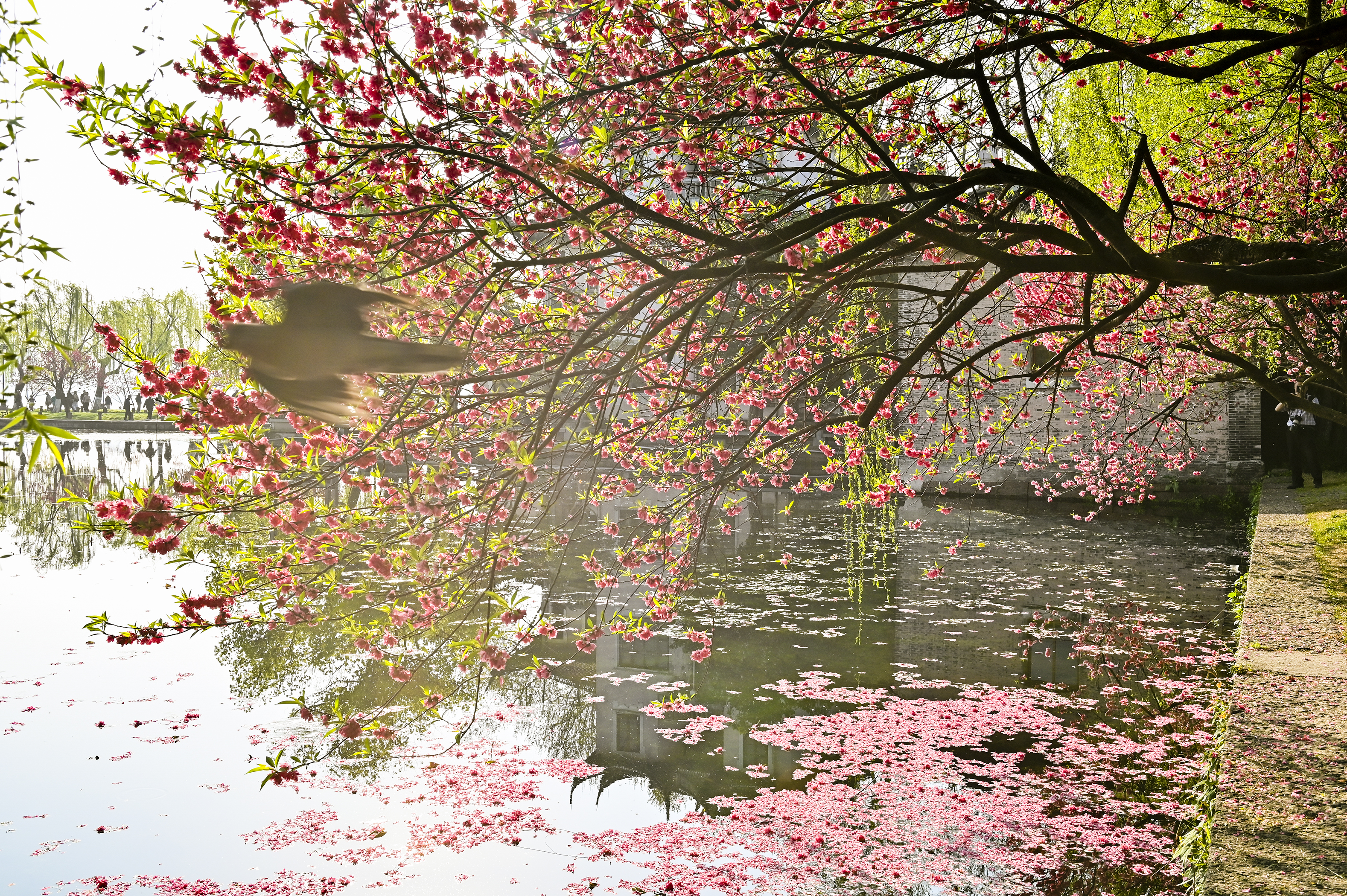 飞鸟衔春,桃花渡水 春鸟穿花过,桃花落满池 一只飞鸟,撞碎了满池春影