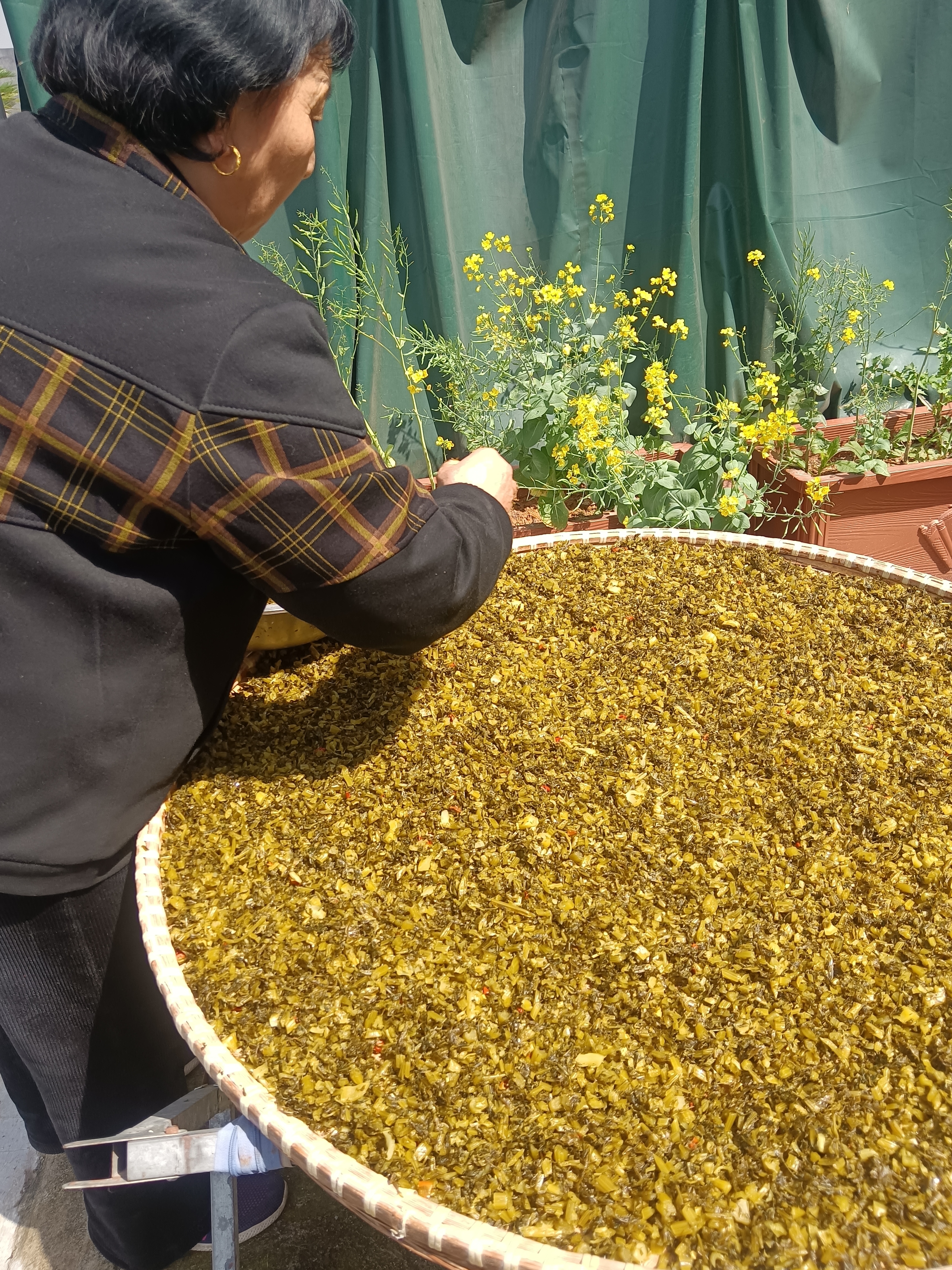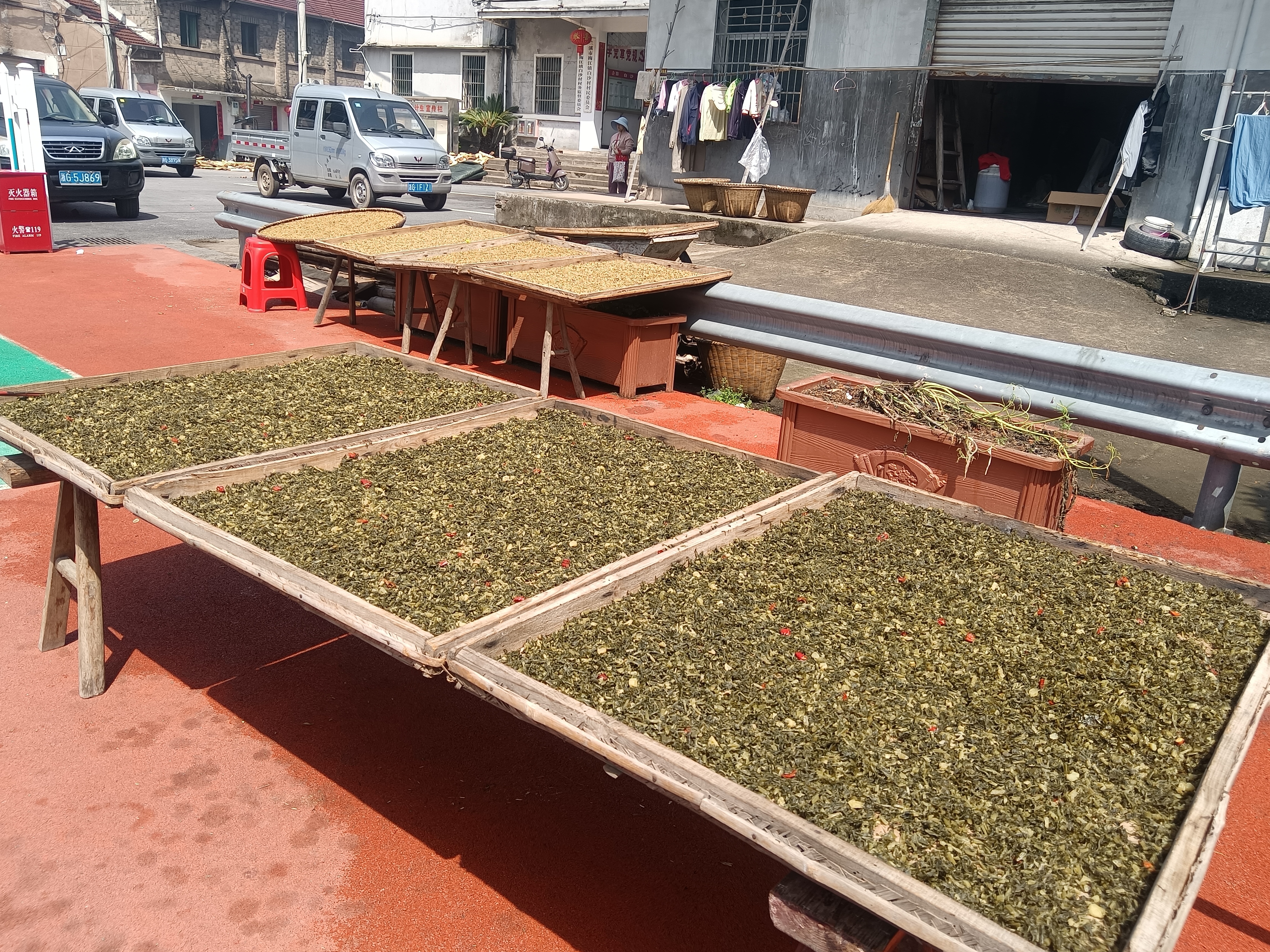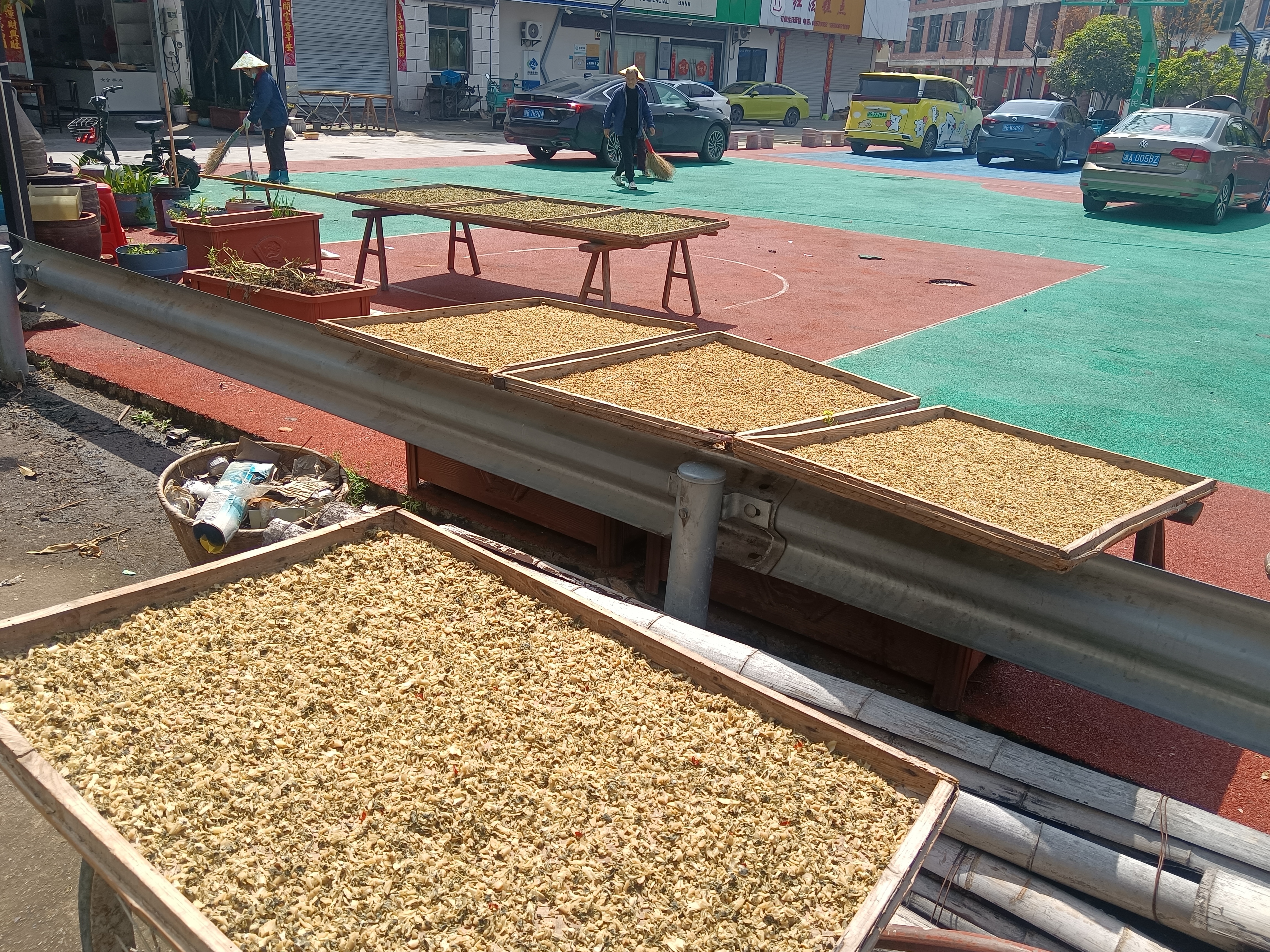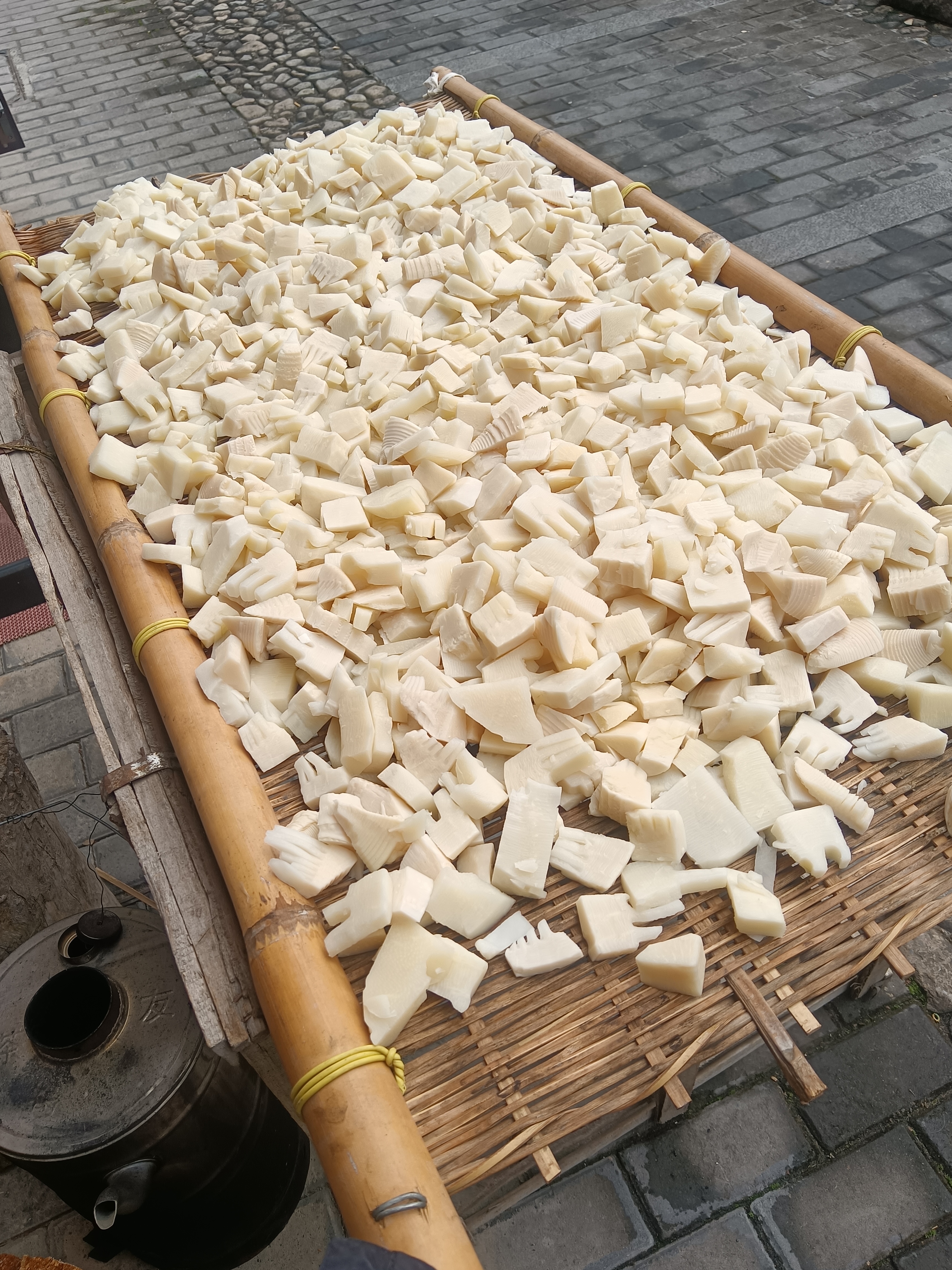 前三天,阴雨连绵,昨天下午则下大雨。今日天气晴好,在梅江镇白沙村党群中心门口,青少年运动场竟成了晒菜干晒笋干晒树根的场所。晒树根,是日后烧大锅蒸糯高粱。当地盛产土高粱烧酒。 图一:干菜为九头芥(雪里蕻一种) 图四:晒笋干(毛竹笋)