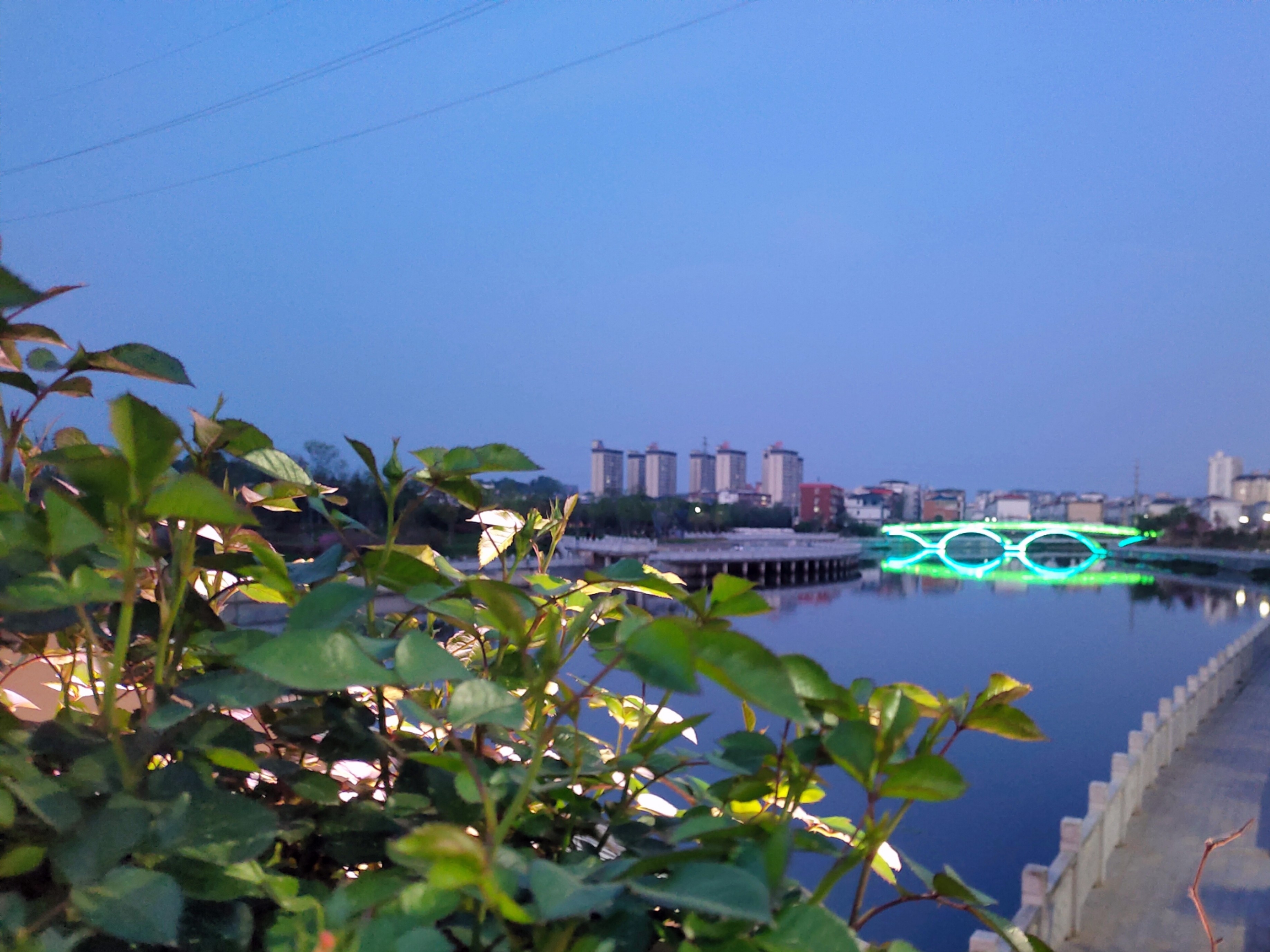 桥灯亮了,湖面就偷偷藏起整座城。绿植在前打个框,抬头是温柔天际线,低头是晃悠的光。
