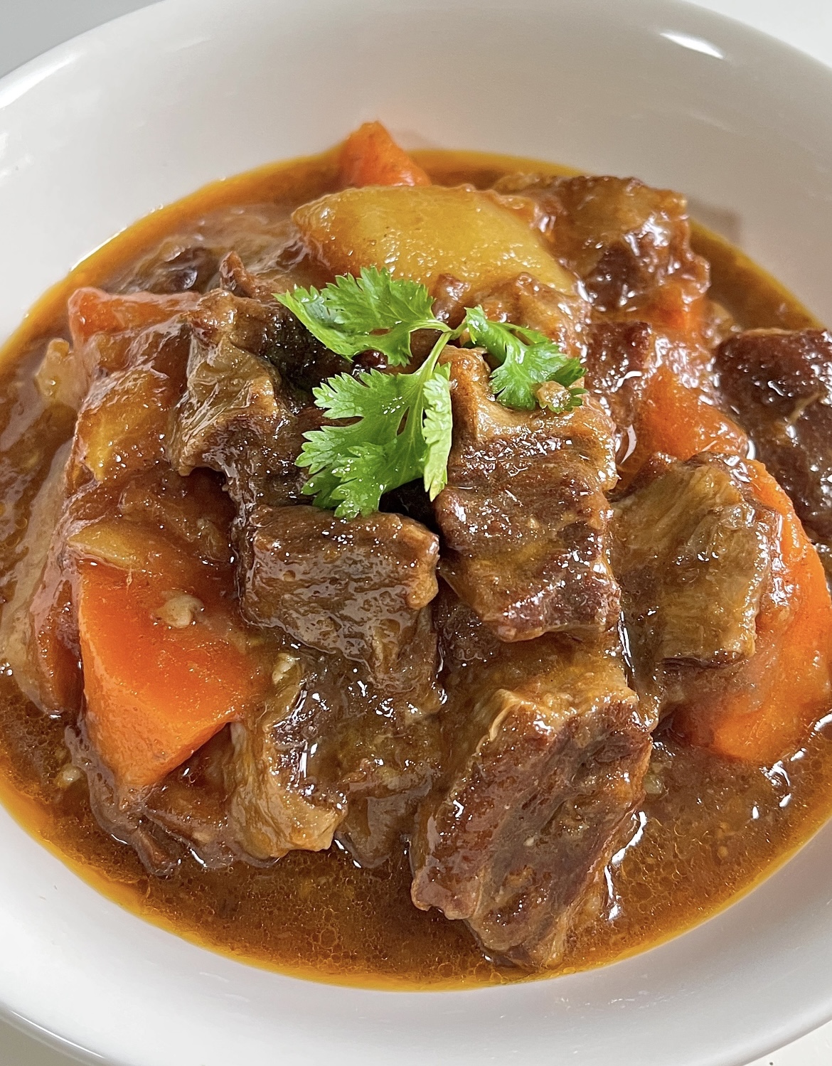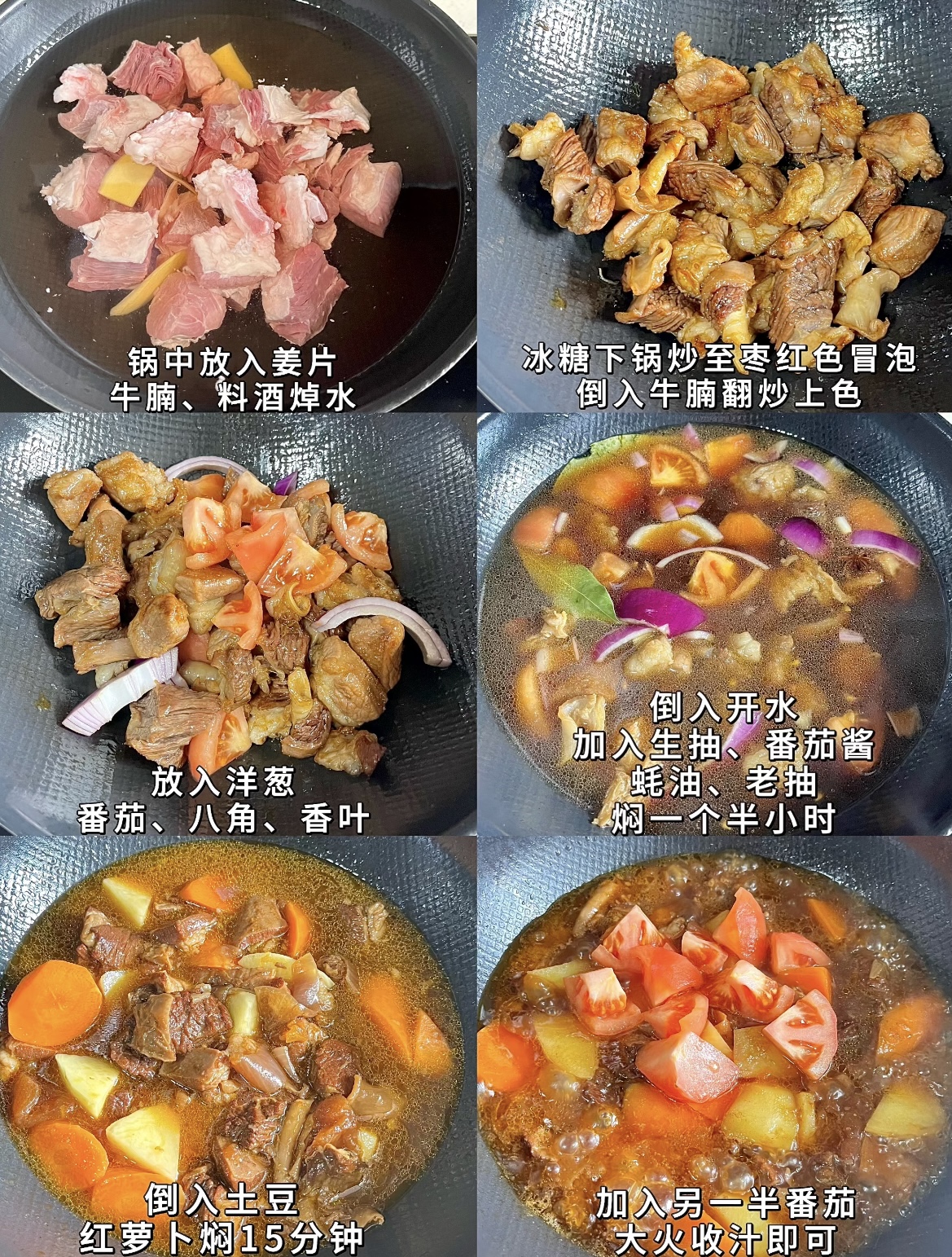 巨下饭的番茄牛腩,酸甜的番茄和牛腩一起炖,搭配绵软的土豆和红萝卜,就是妥妥的下饭神器,小朋友直呼再来一碗饭,大家快试试吧! 具体做法: 1,锅中放入姜片,牛腩,料酒焯水 2,冰糖下锅炒至枣红色冒泡,倒入牛腩翻炒上色3,放入洋葱,番茄,八角,香叶,倒入开水,加入生抽,番茄酱,蚝油,老抽,焖1个半小时4,倒入土豆,红萝卜焖15分钟,加入另一半番茄,大火收汁即可!