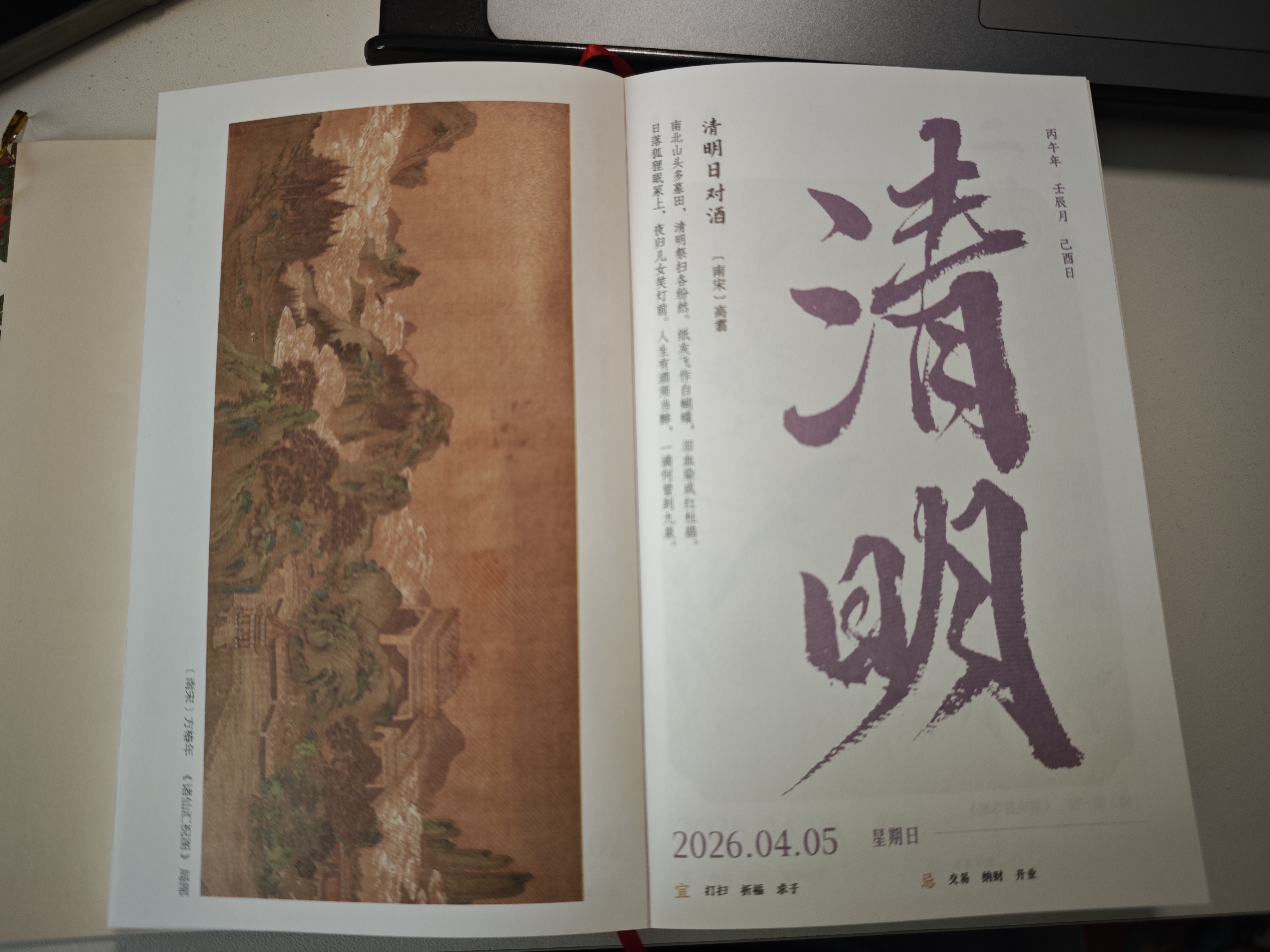 诗画书历|清明日对酒 《清明日对酒》【南宋】 高翥 【原诗】 南北山头多墓田,清明祭扫各纷然。 纸灰飞作白蝴蝶,泪血染成红杜鹃。 日落狐狸眠冢上,夜归儿女笑灯前。 人生有酒须当醉,一滴何曾到九泉。 【今译】 你看那南边北边的山头上,密密麻麻都是墓地,清明节到了,各家各户都在忙着上坟祭扫,场面纷乱繁忙。焚烧的纸钱灰屑漫天飞舞,就像白色的蝴蝶在翻飞,人们痛哭流涕,悲伤得仿佛泪中带血,染红了山间的杜鹃花。 可是等到太阳落山,祭扫的人群散去,只有狐狸在坟冢上安然入睡,享受这片死寂。 而那些白天还在哭泣的儿女们,晚上回到家后,早已忘记了悲伤,在灯前欢声笑语,恢复了往日的快乐。人生在世,有酒就应当痛快地喝醉,因为死后祭奠的酒,哪怕只有一滴,又何曾能流到九泉之下给亡者喝到呢? 【赏析】 高翥的这首《清明日对酒》,始于悲凉,终于旷达。它提醒我们:清明节不仅是缅怀逝者的日子,更是审视生者生活态度的契机。在这个特殊的日子里,我们寄托哀思是必要的,但更重要的是,要明白生命的意义在于当下的体验。既然“一滴何曾到九泉”,那就不妨在缅怀之后,收拾心情,好好喝一杯,过好热气腾腾的每一天。