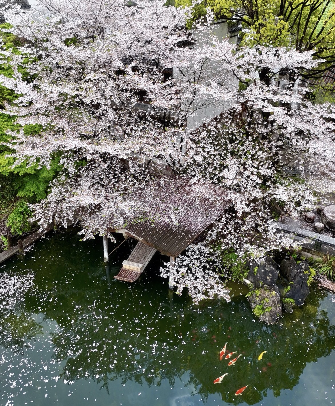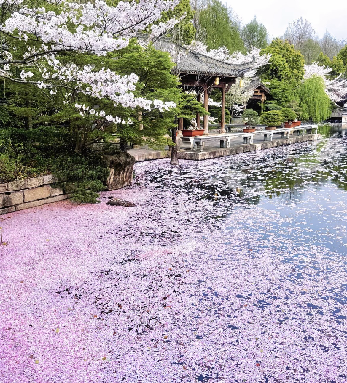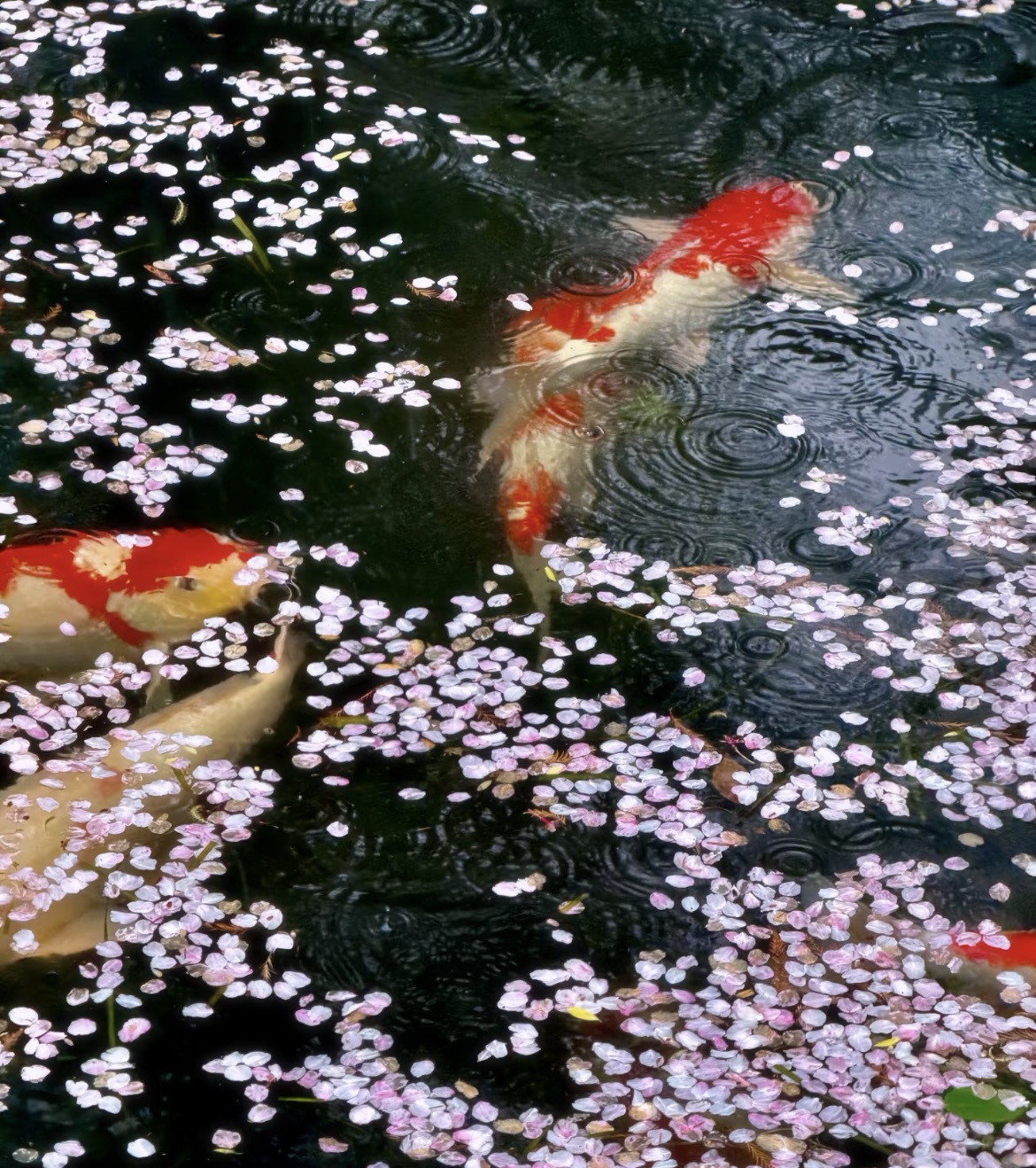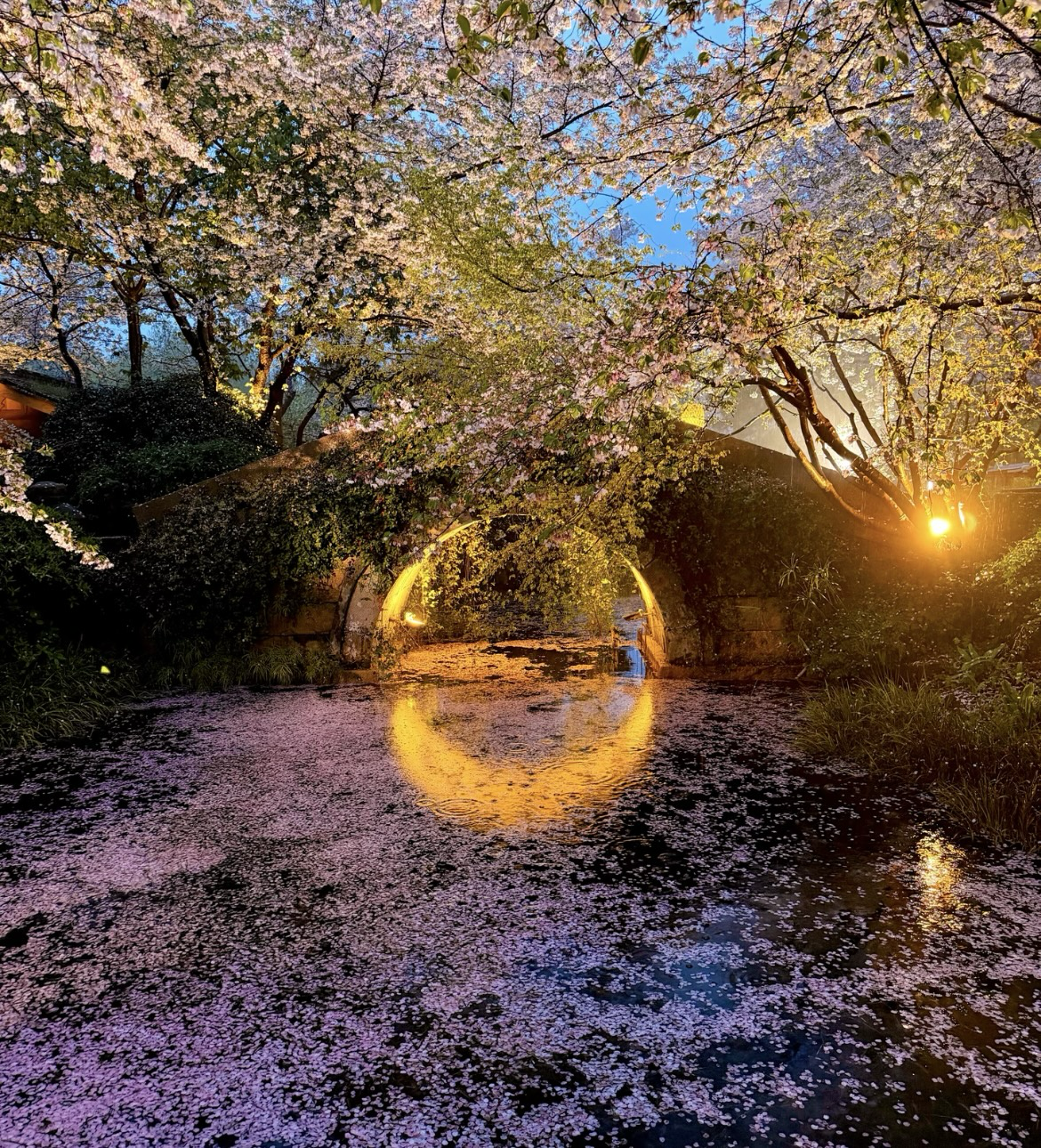 樱雪落于哲思小径,锦鲤游过倒影的桥。夜灯轻吻垂枝,一池春水盛满浮世清欢。