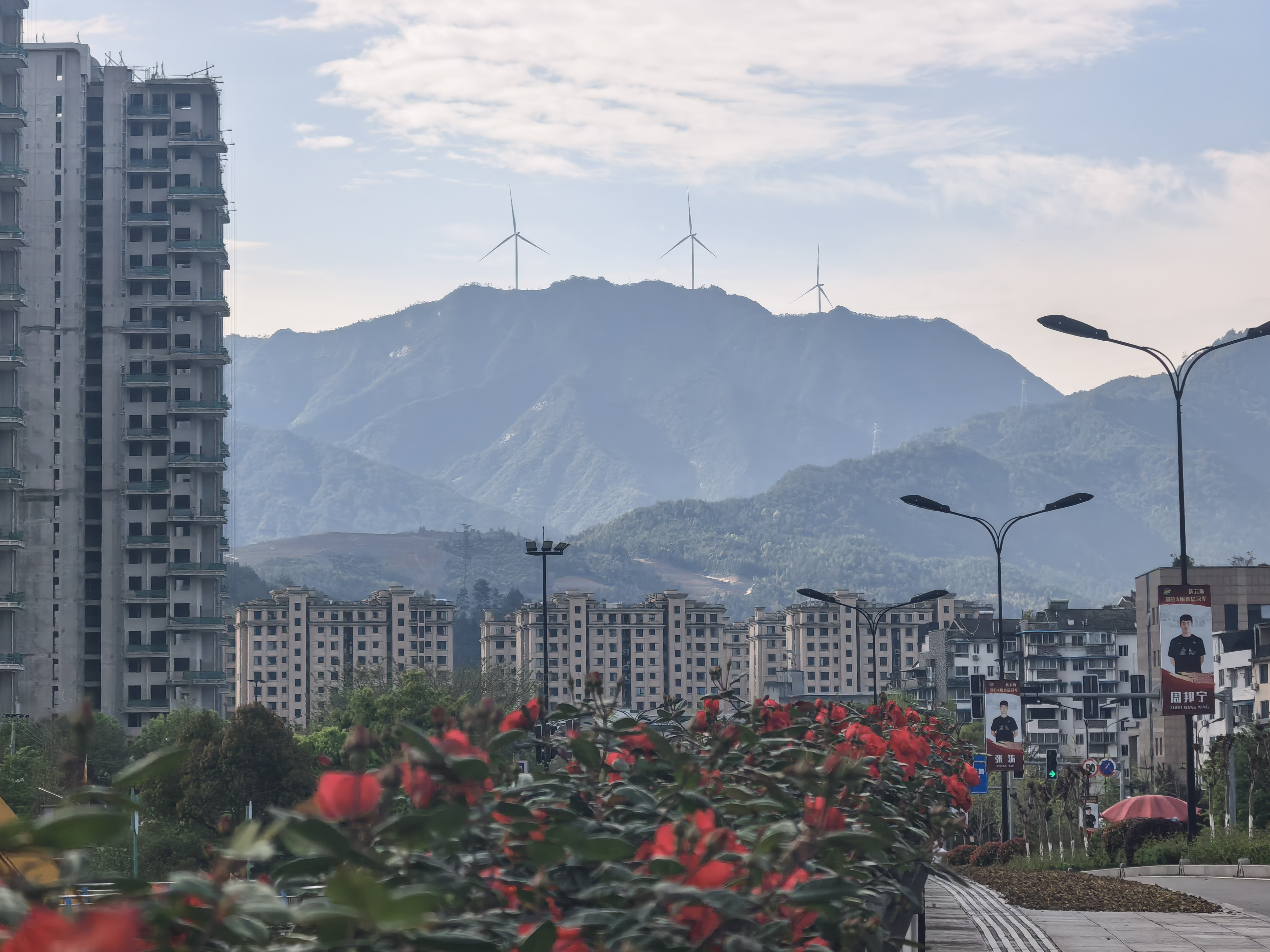 风车转、高楼立、红花绿树间,信号灯轻眨,未完工的楼也透着生机~